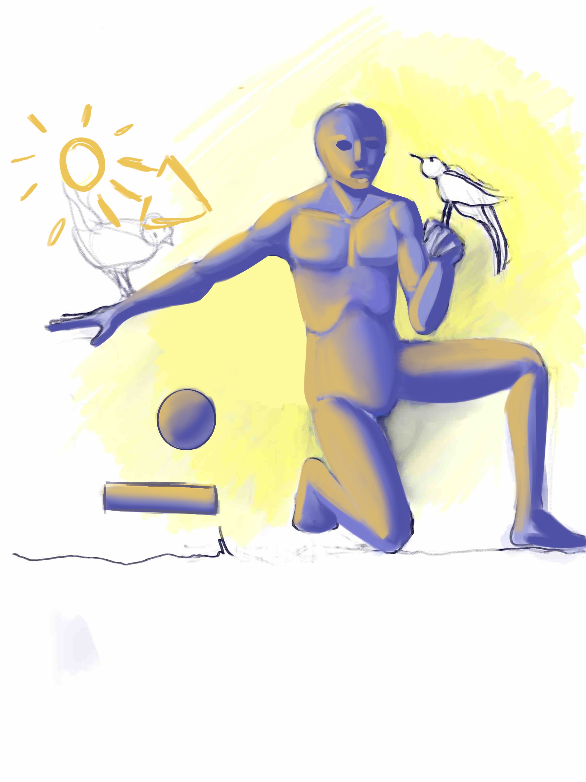 Alors au niveau de ton personnage je volume il faut que tu penses d'avantage en volume justement, déjà commence par poser une source de lumière stable, ici tes sources de lumière venaient à la fois de la gauche et de la droite ce qui a tendance à aplatir, ensuite reviens à des volumes de bases, par exemple des sphères et des cylindre, en suivant se principe, comme tu peux le voir dans la correction, même si c'est encore très perfectible on a déjà une sensation générale de volume plus présente.