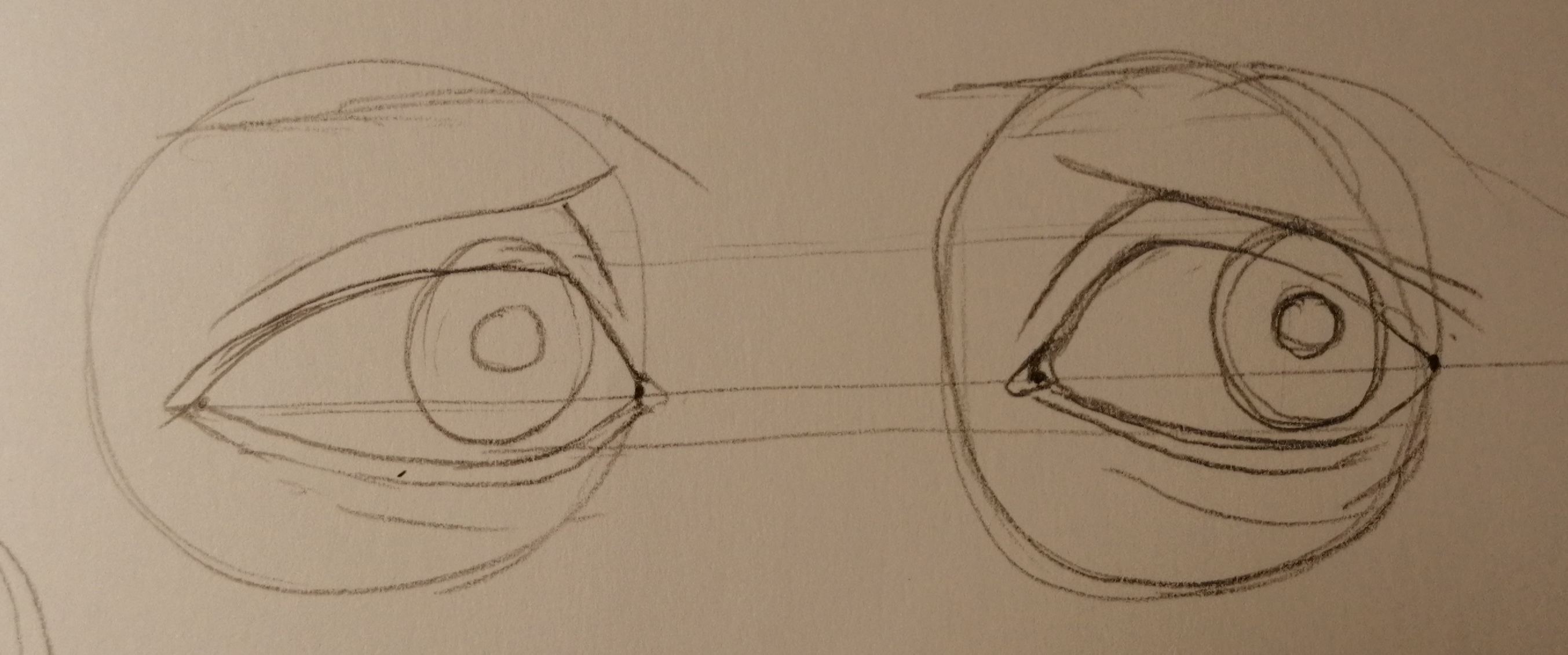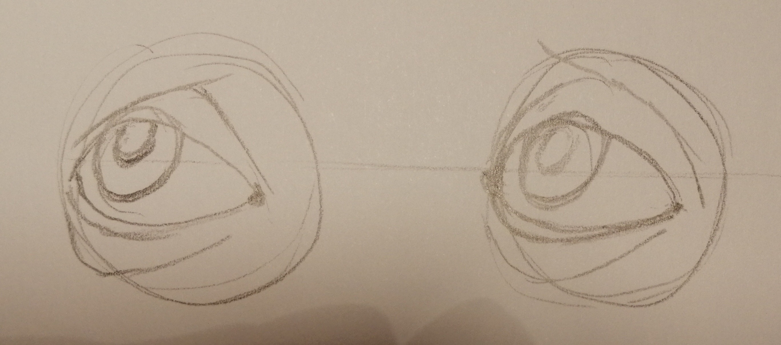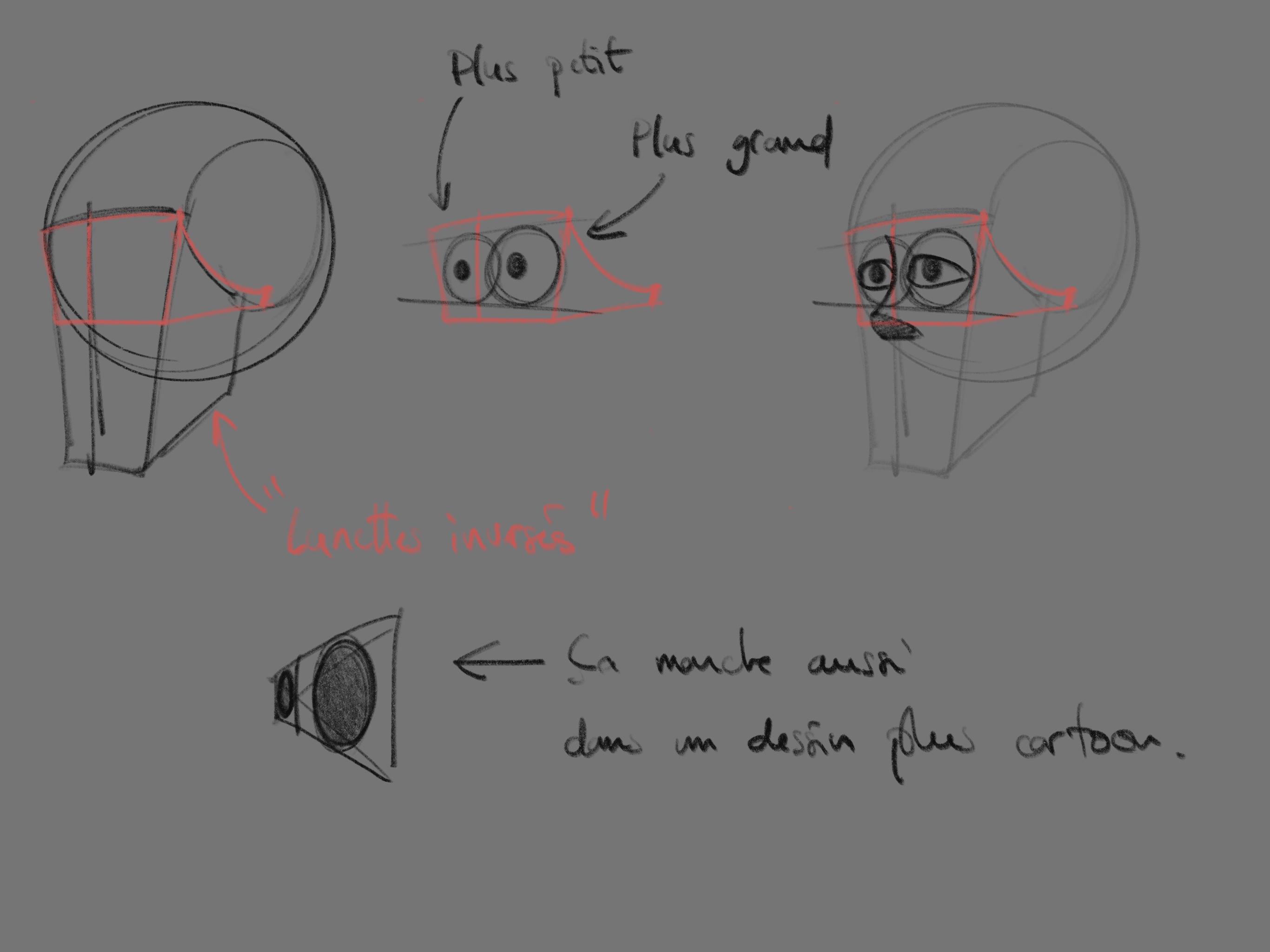 Voici un petit tip pour t'aider. Pense la forme des yeux comme une paire de lunette inversées placées sur le nez. L'oeil le plus loin sera légèrement plus petit, celui en avant plus grand. Commence par t'habituer à cette forme de lunettes puis construis derrière pour t'assurer une base solide et ne pas laisser une méthode un peu trop simplifiée s'installer sans comprendre pourquoi.