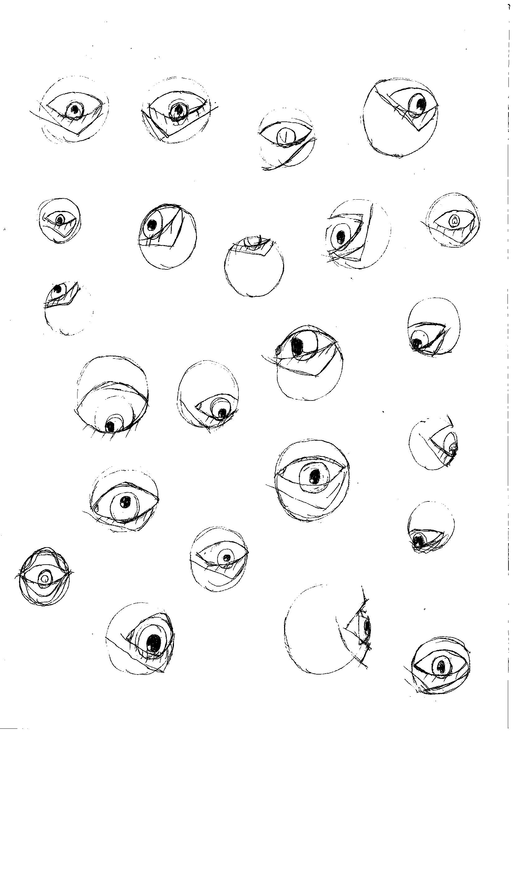 Essais de dessin de l'oeil dans son orbite.