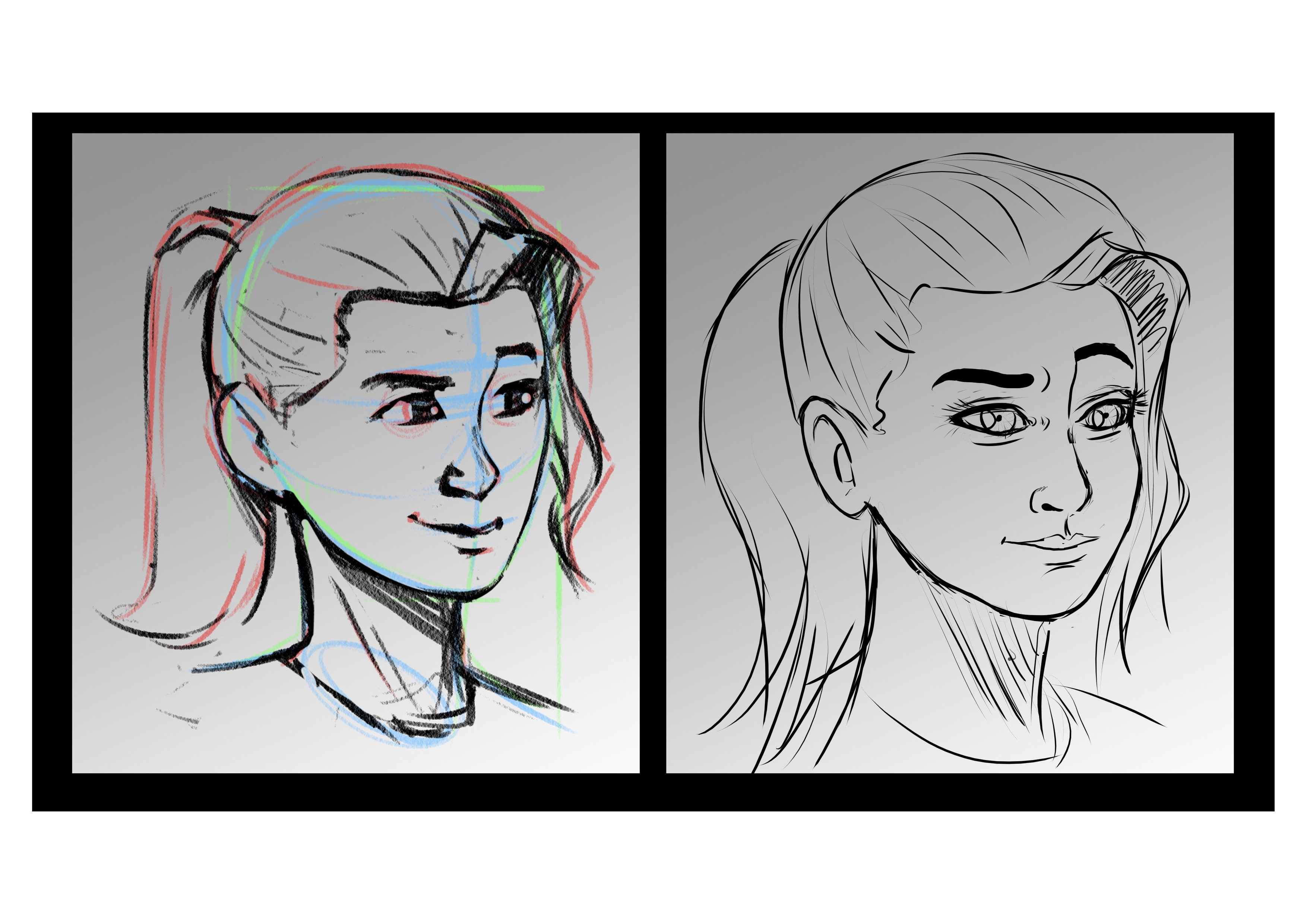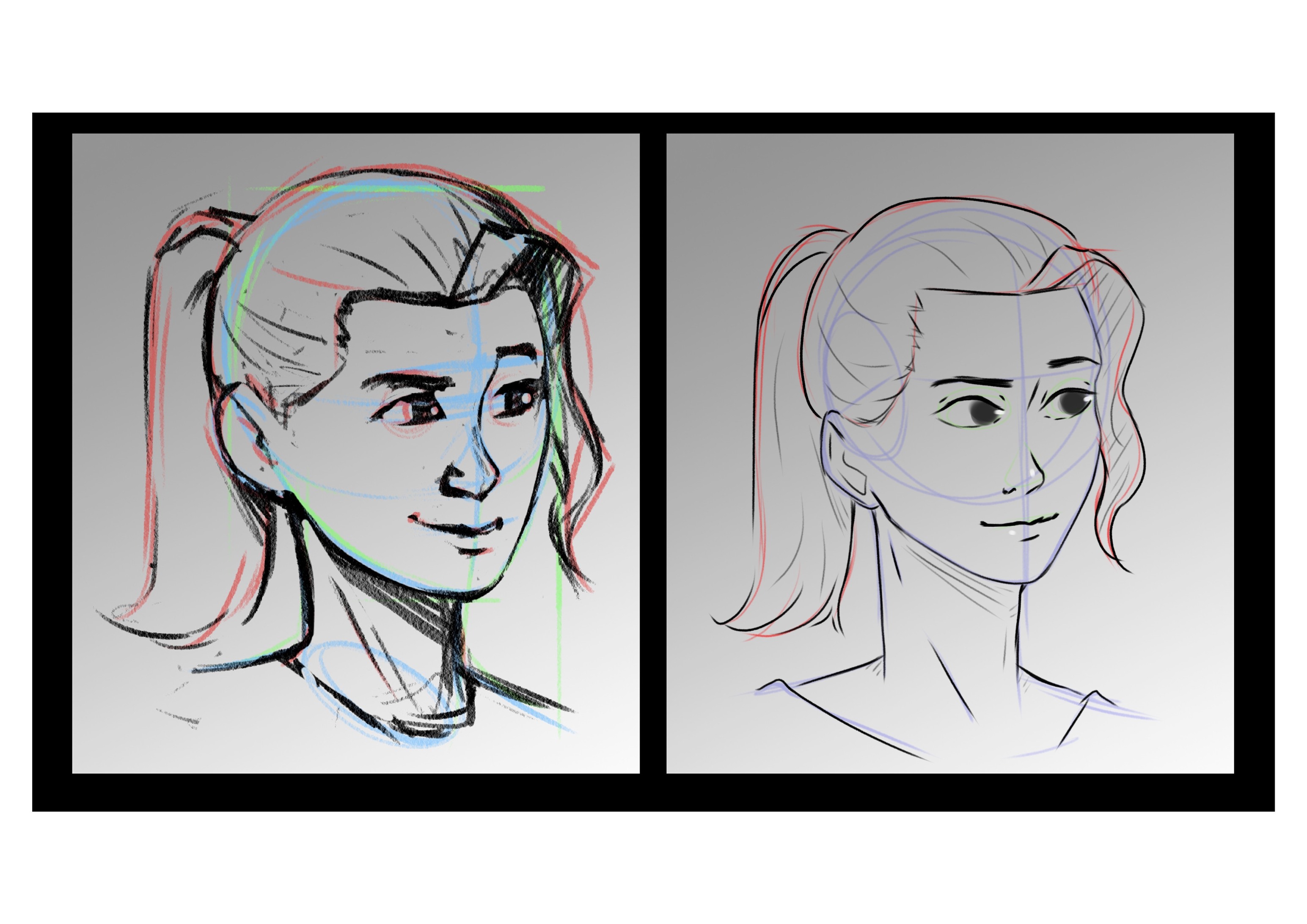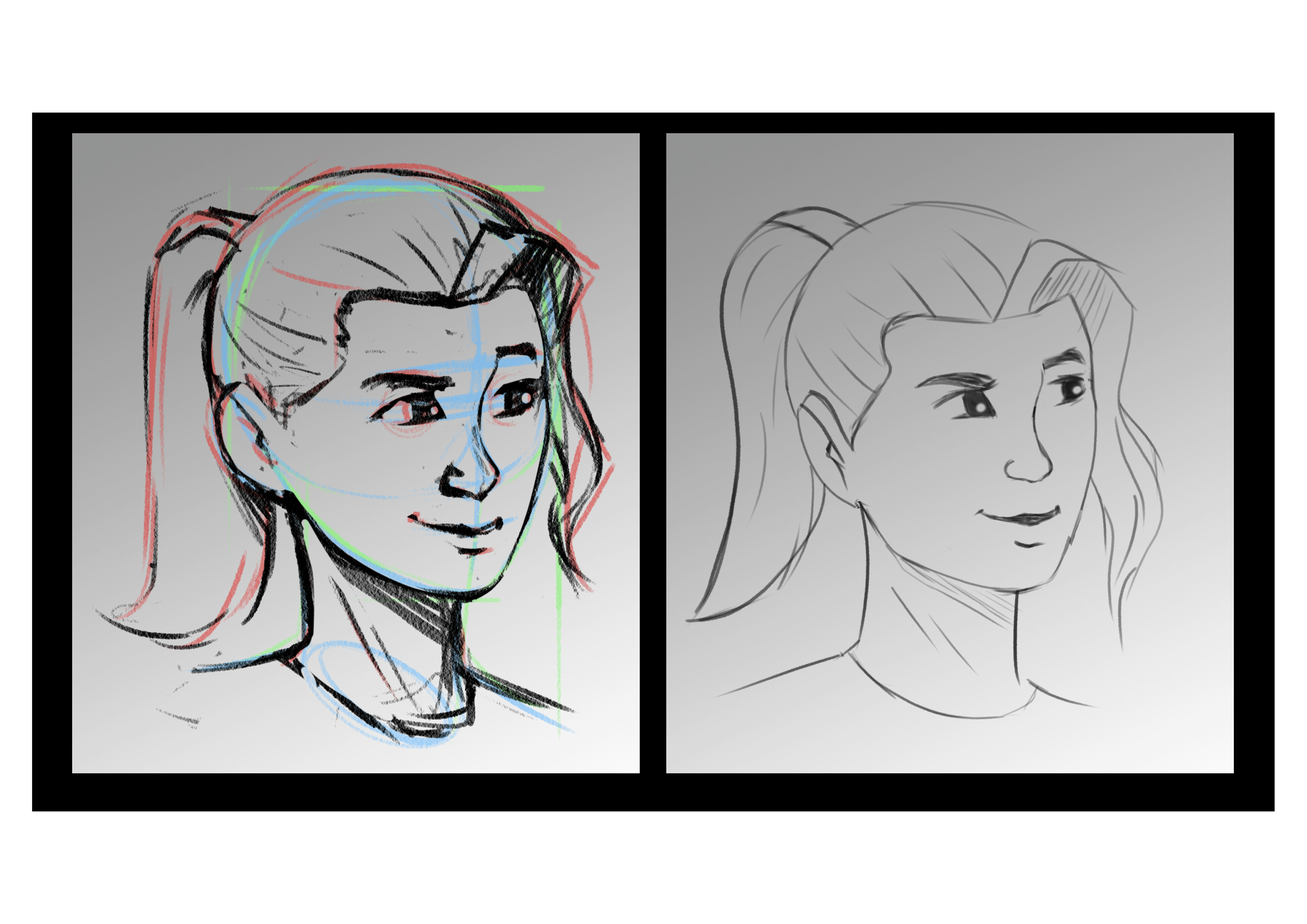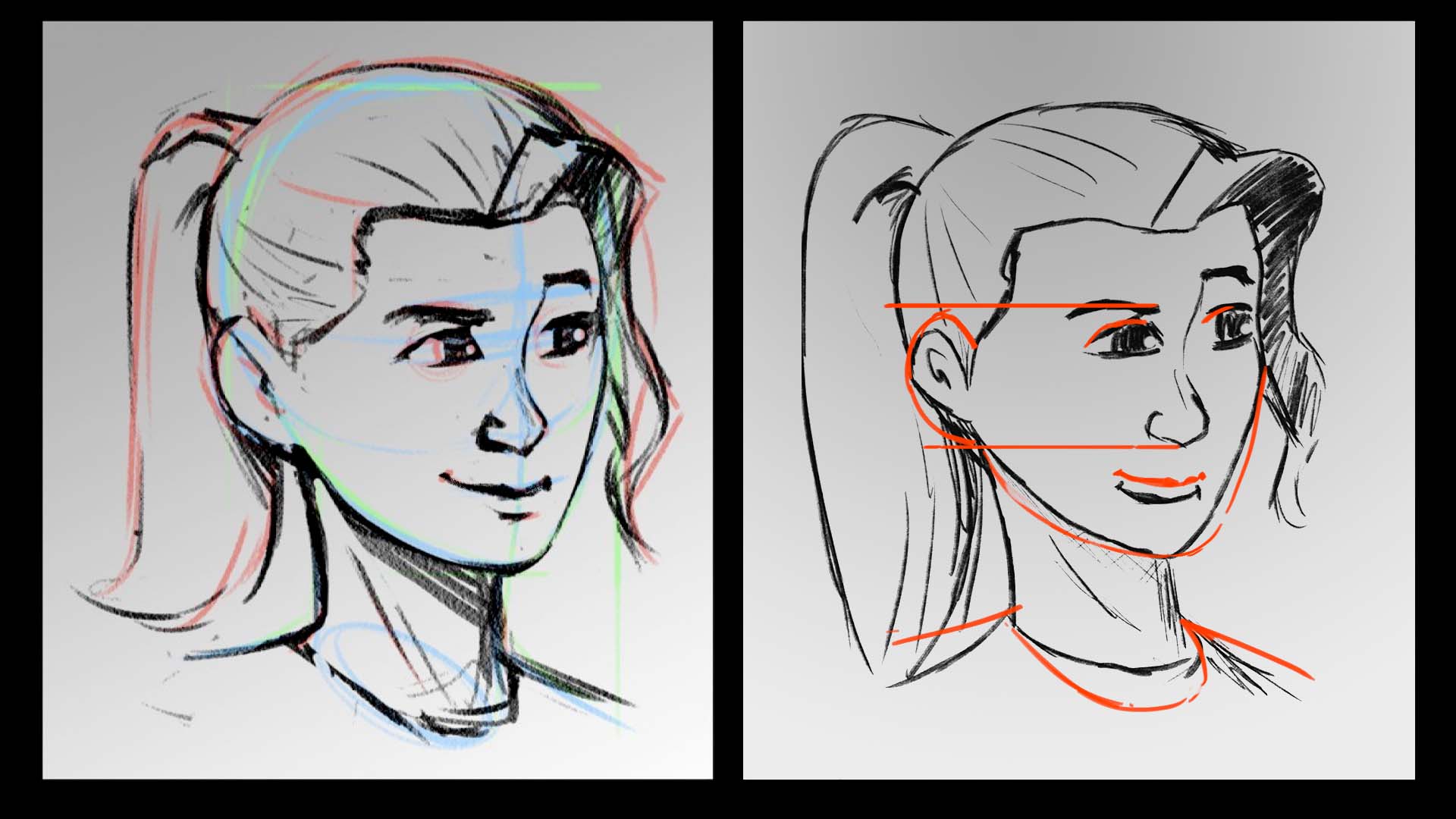 También lees los ojos y la nariz un poco altos en comparación con el modelo. Allí, lo mismo, querías evitar dibujar la inclinación de la cara, que se ve ligeramente buceando. Conociendo que bajas la línea del cabello, los ojos y la nariz, estarás mucho más cerca del modelo (verde)