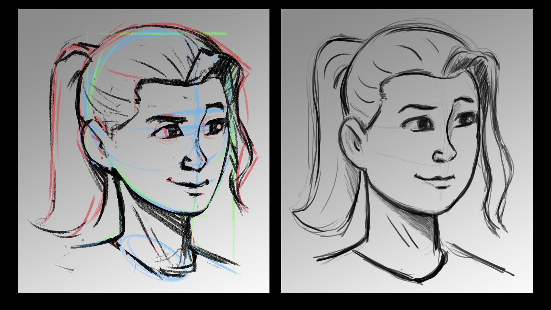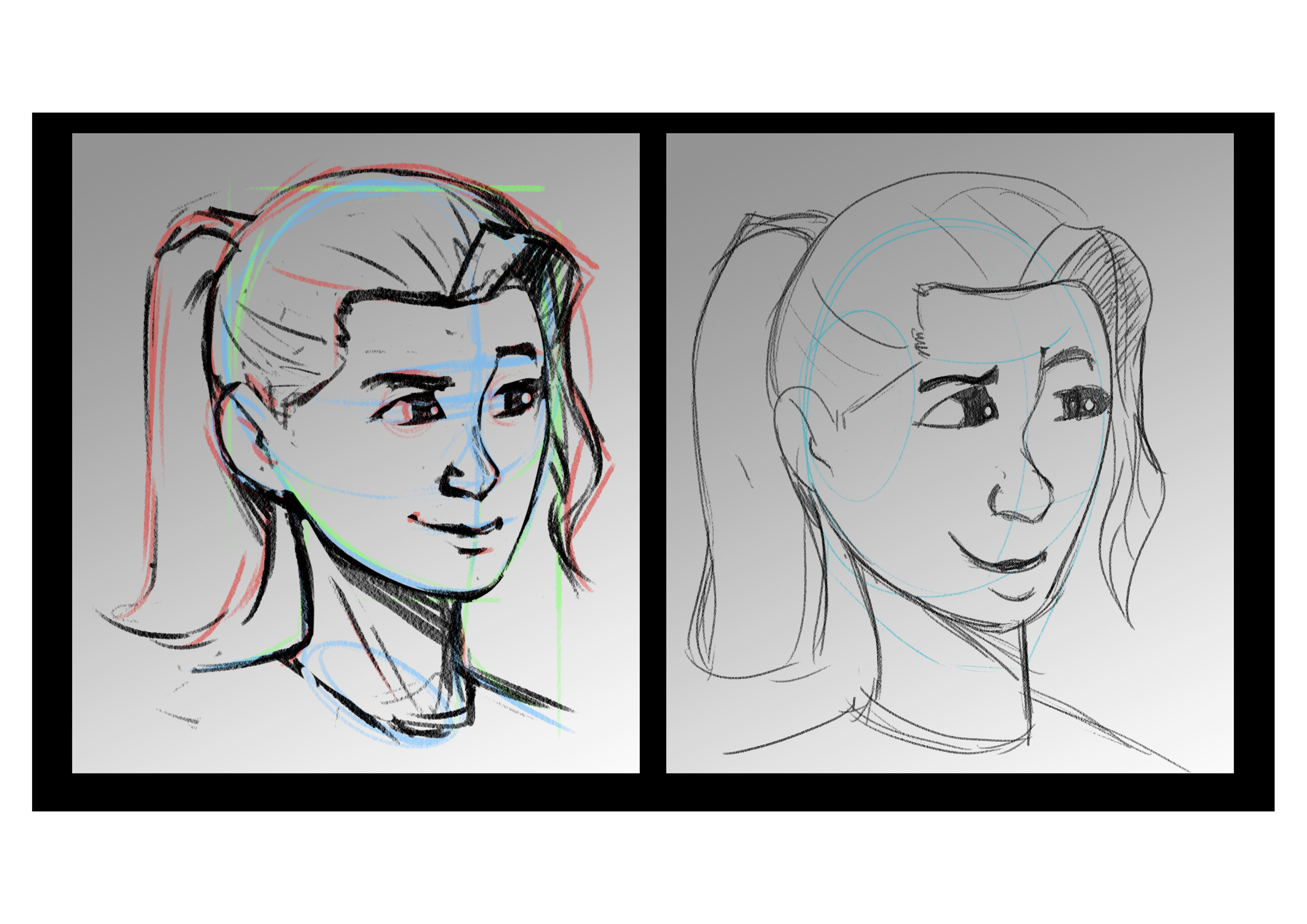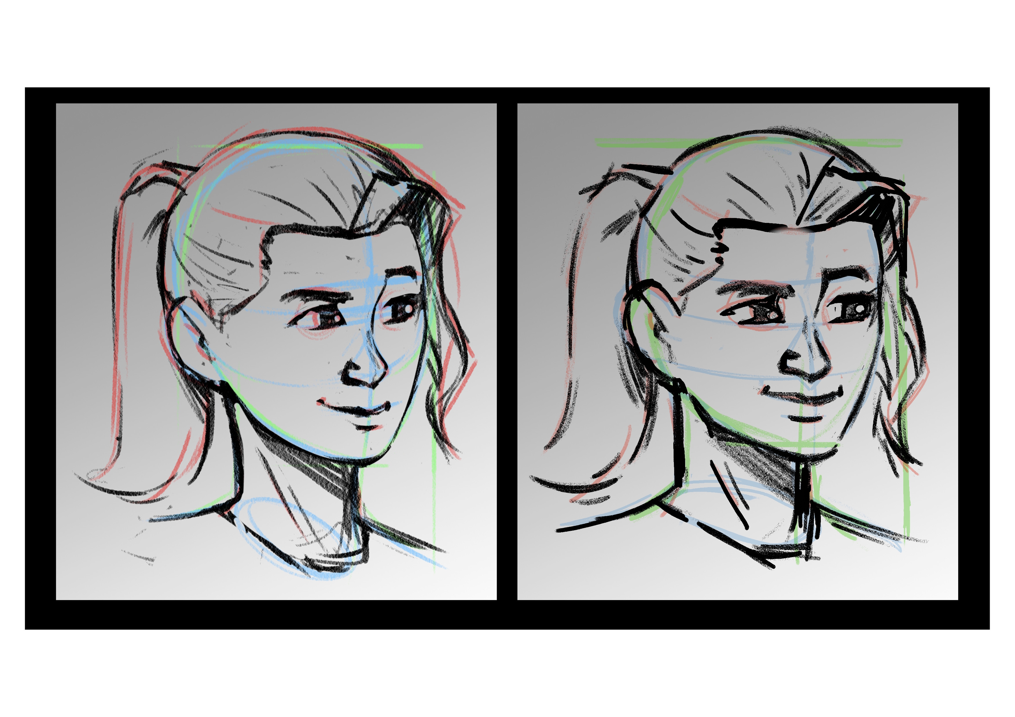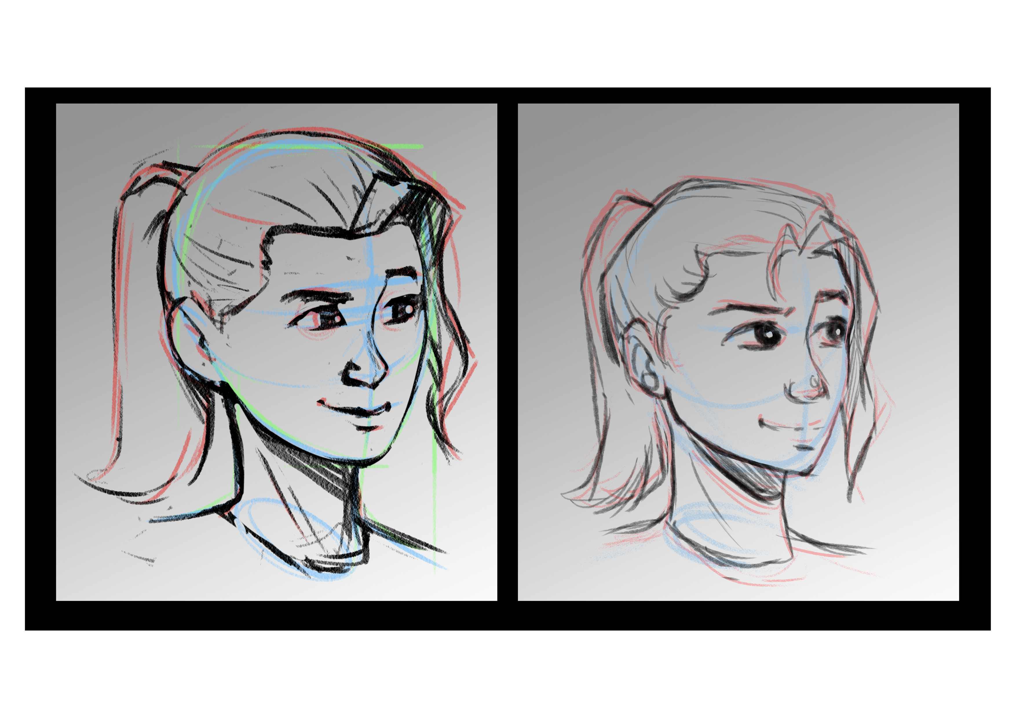 También lees los ojos y la nariz un poco altos en comparación con el modelo. Allí, lo mismo, querías evitar dibujar la inclinación de la cara, que se ve ligeramente buceando. Conociendo que bajas la línea del cabello, los ojos y la nariz, estarás mucho más cerca del modelo (verde)