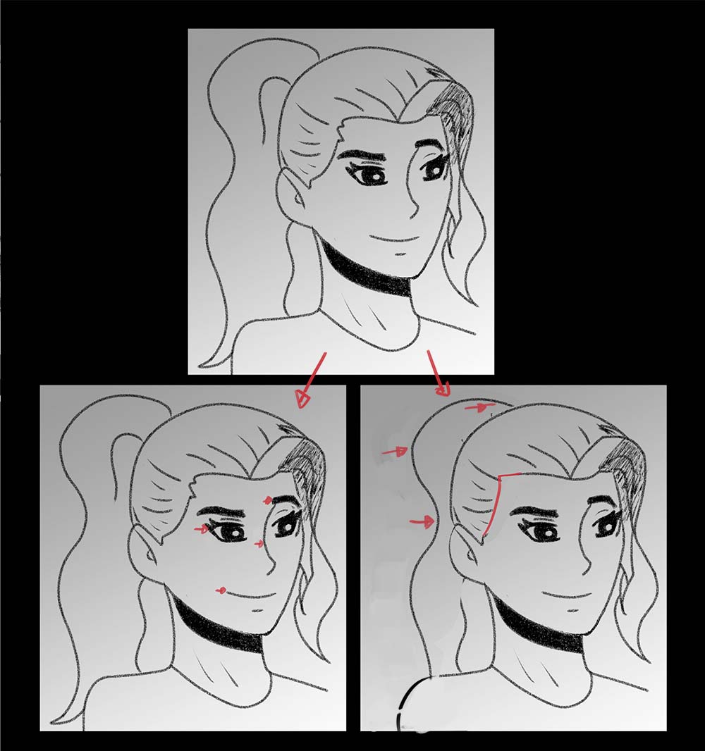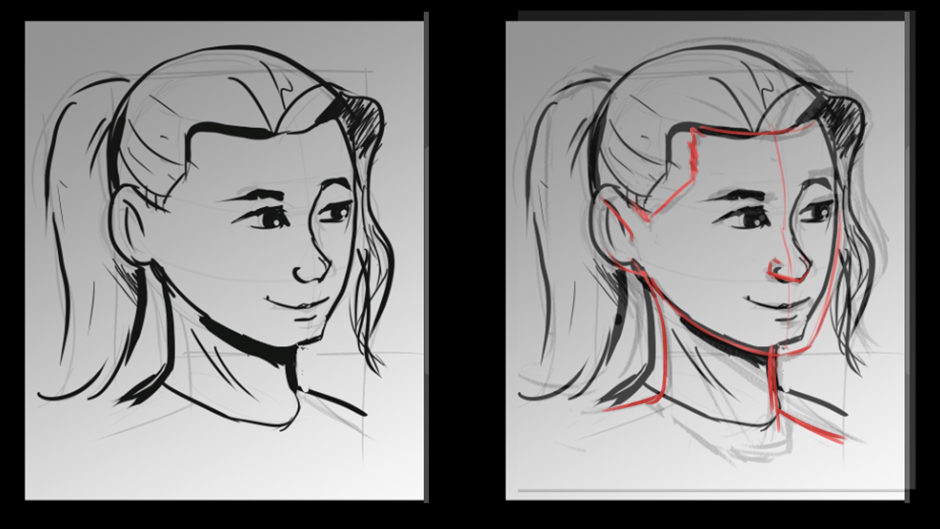 Las principales correcciones que tengo que hacer se relacionan con las proporciones. Los hombros del personaje están muy altos en su versión, lo que le da un cuello robusto y una barbilla ligeramente llena y de retiro. Al dar un poco más de espacio para el cuello y la barbilla, un poco más de espacio a la derecha de la cara, le das al personaje una cara más elegante. La línea del cabello en el templo también está un poco lejos a la izquierda y, por lo tanto, debe compararse con el resto de la cara a la derecha.