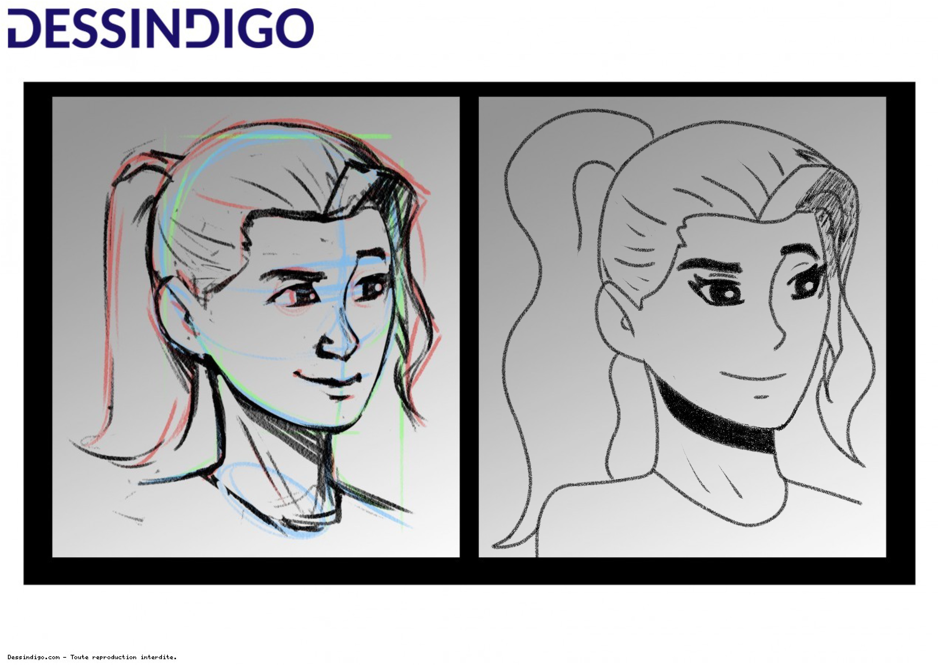 Vemos que logras poner las características donde deseas y que dominas tus proporciones. Es cierto que no es fácil manejar las expresiones (esto es lo que puede suceder cuando aprende a dibujar memorizando las cosas en 2D y cuando no domina completamente los volúmenes y la anatomía, mi solución es extraer fotos de usted (o mirar en un espejo) con expresiones fuertes, para comprender cuánto cambian las expresiones la estructura de la cara.