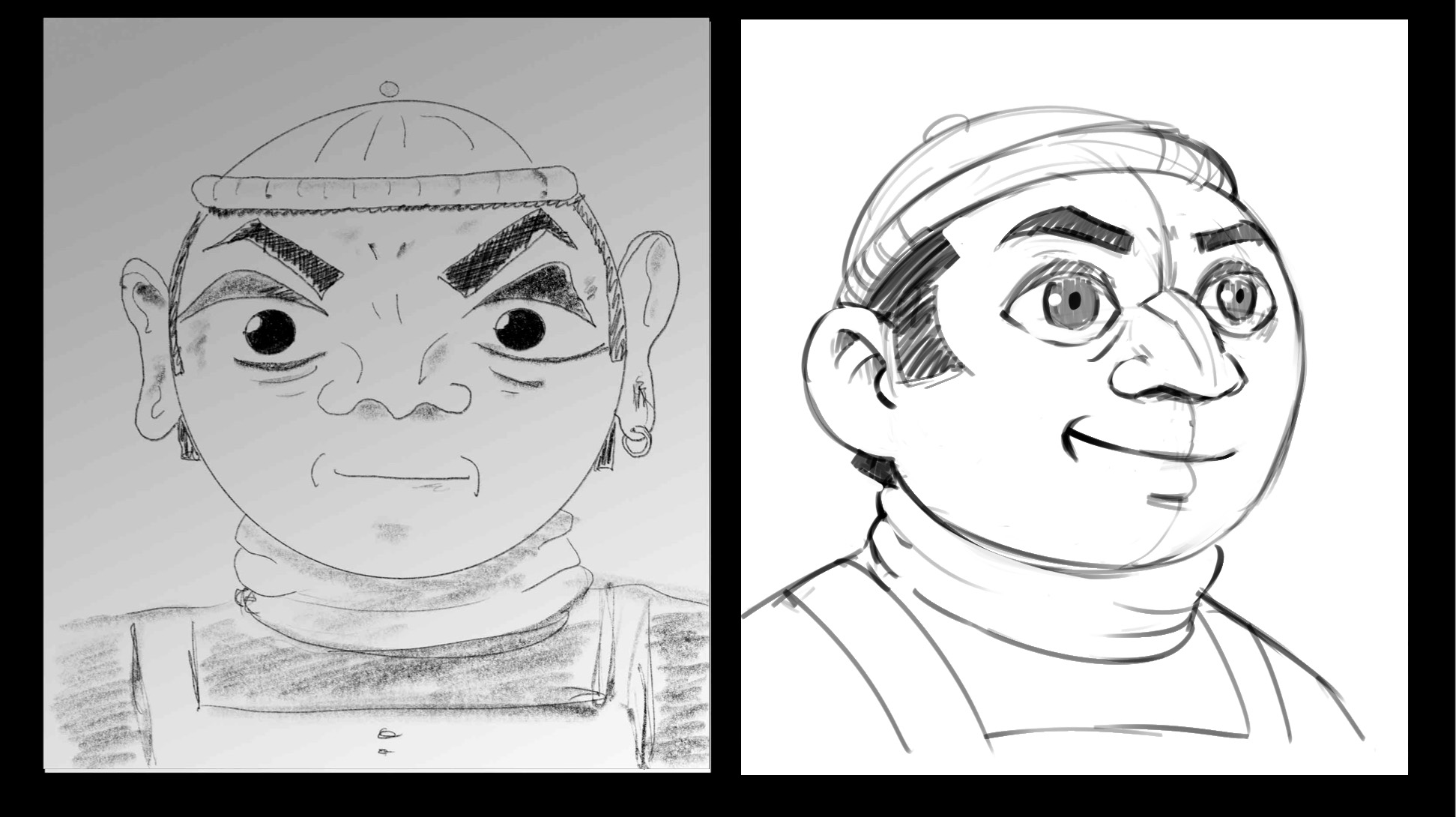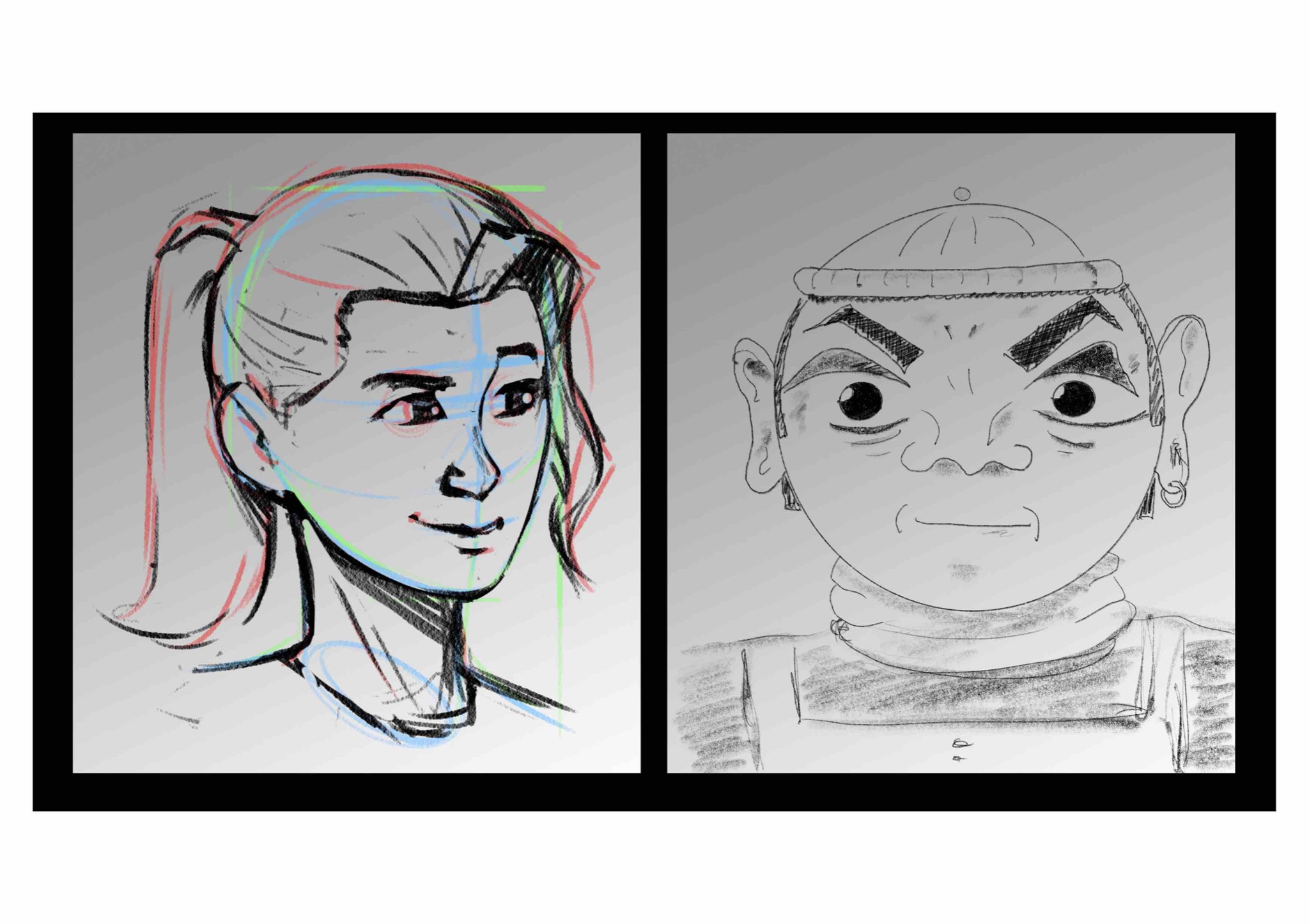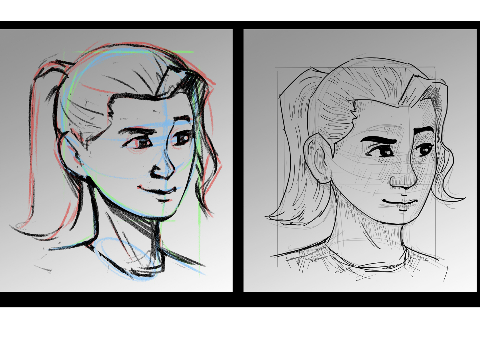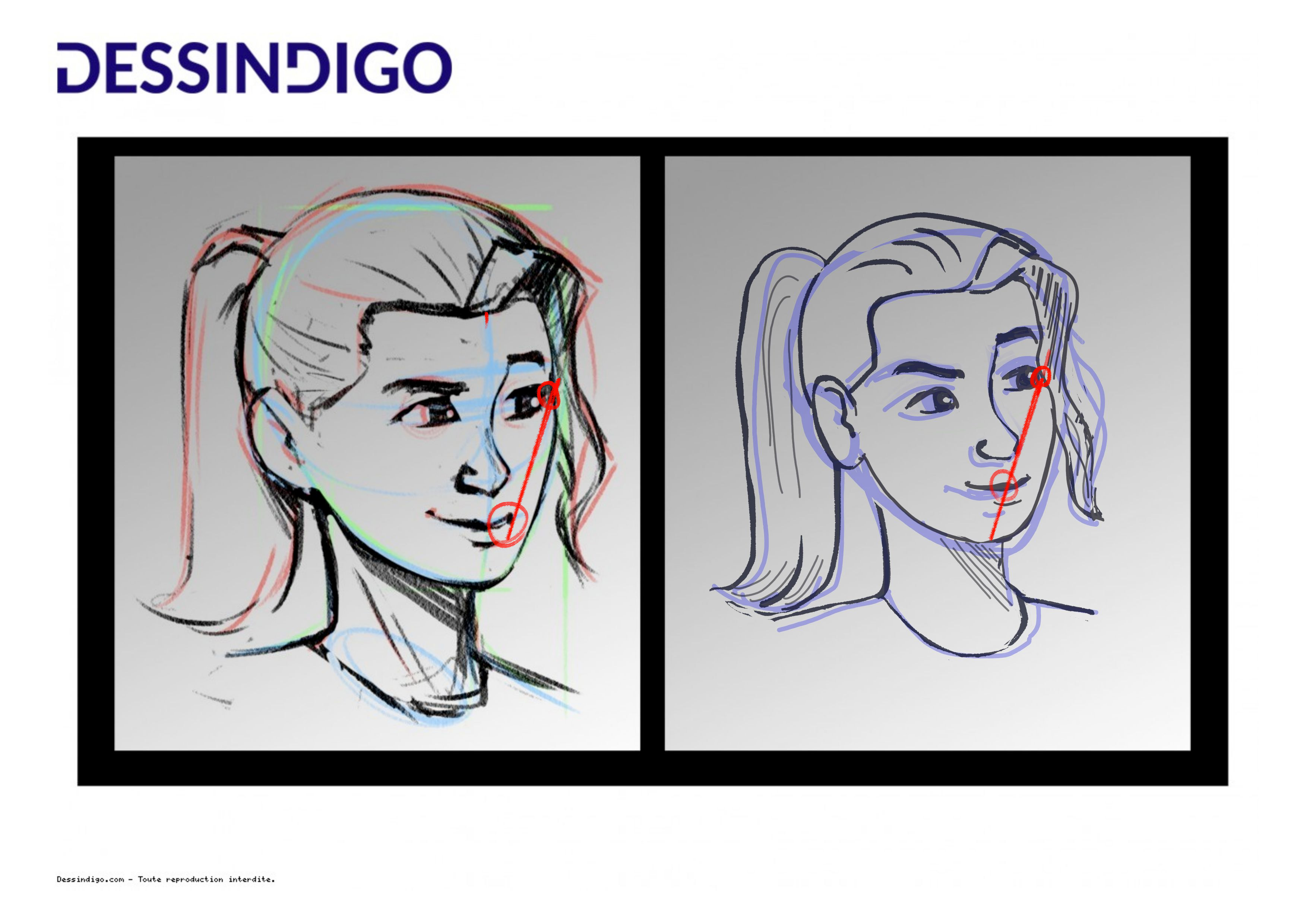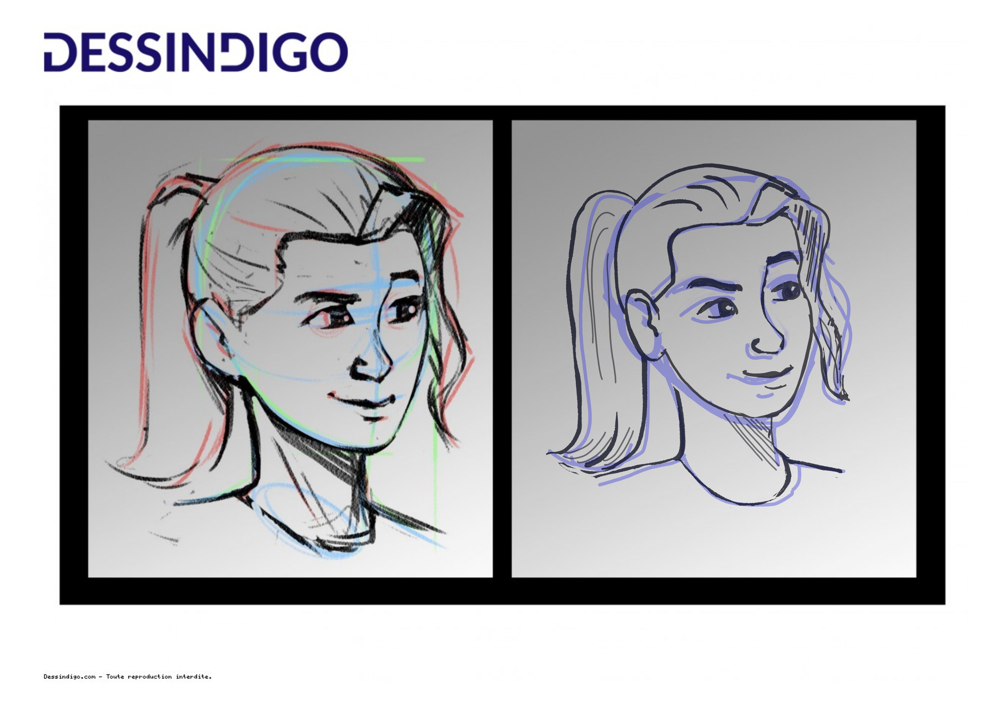 Salut! je n'ai pas vraiment de remarque à faire. L'inclinaison du visage est un peu différente, le front est un peu prohéminent, et penche légèrement vers la droite, le menton un peu en retrait, là ou le modèle penche dans l'autre direction. ça fonctionne, mais je pense que réduire légèrement le front rendra le desin plus équilibré et symmétrique.