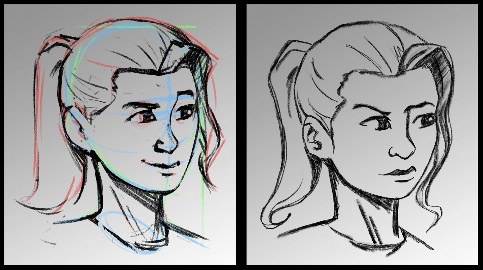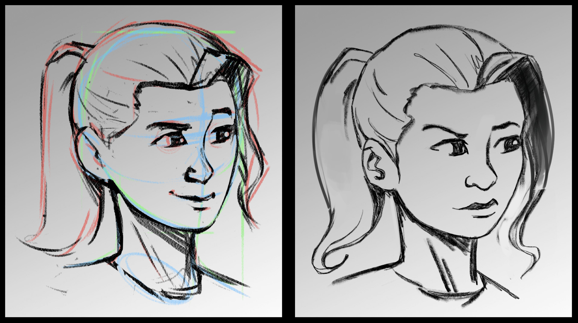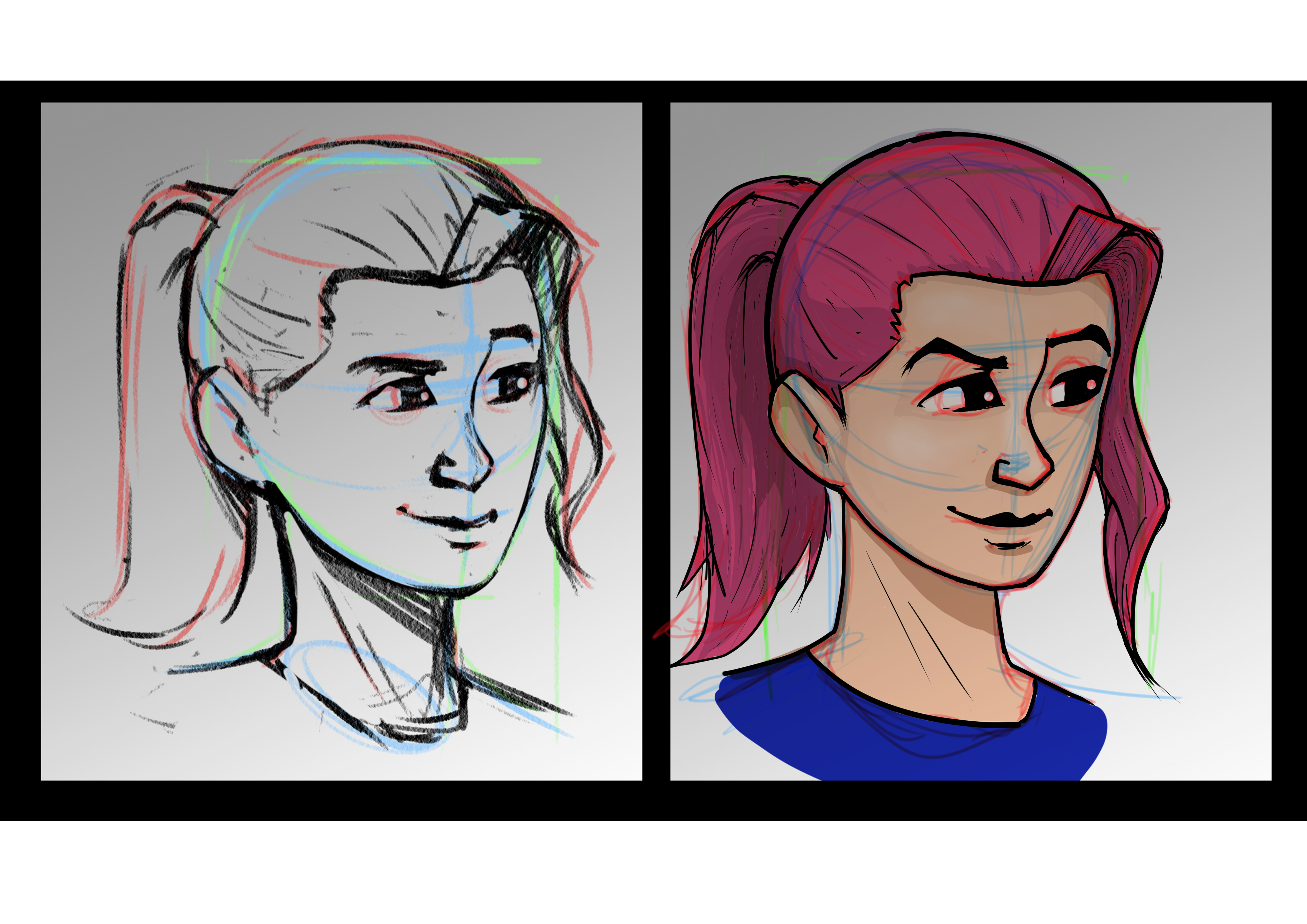 je pourrais pinailler sur le sourcil de la droite, qui déborde un peu trop vers la gauche, au dessus du nez; et la courbe des cheveux pourrait être plus fluide et élégante (on revient aux pouvement amorcé par le coude plutôt que le poignet).