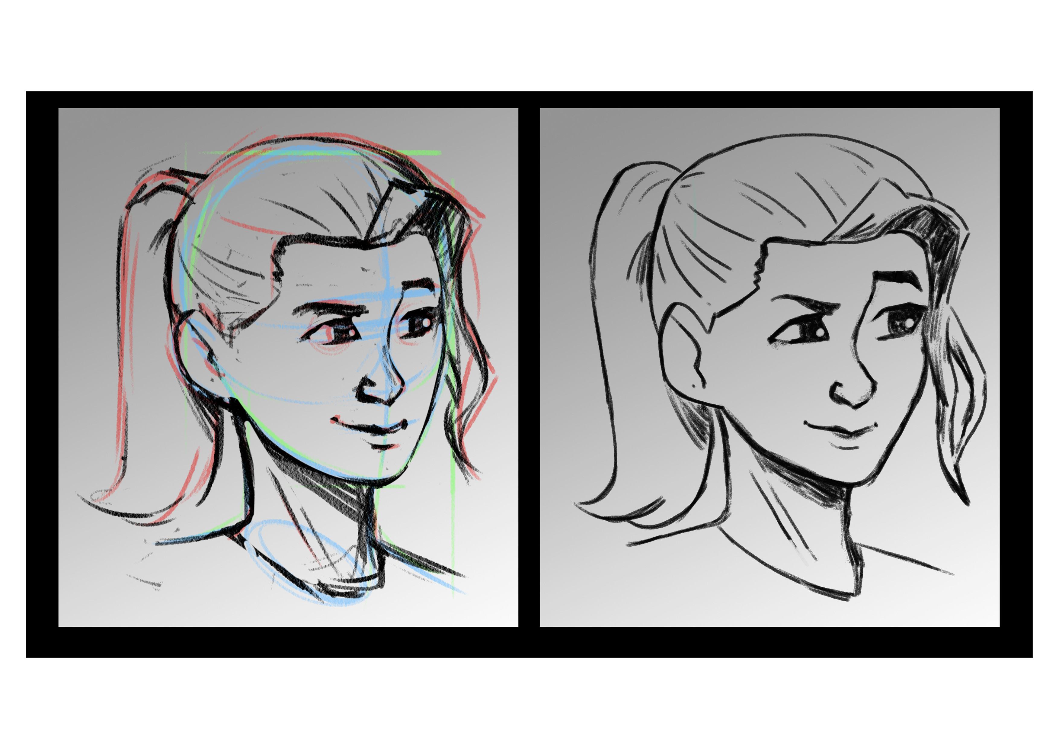 Esto es mucho mejor en términos de línea. Tenga cuidado, por otro lado, la construcción es mucho menos justa, con toda la parte superior de la cara que se inclina hacia la derecha. Trate de reanudar su primer dibujo, reducir la opacidad y volver a dibujar de eso, para mantener lo mejor de los dos mundos.
