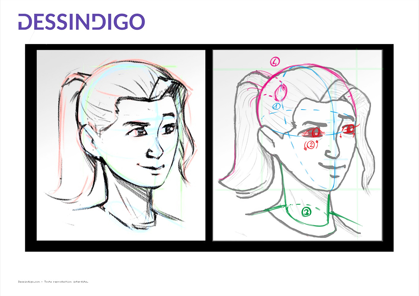 Enfin la ligne du crâne devrait être fermée au niveau de la queue de cheval, puisque la base de la queue de cheval se trouve derrière, et donc cachée par la tête. en retraçant le crane vous pouvez aussi voir que le front est un peu étroit et peut être redressé (4).