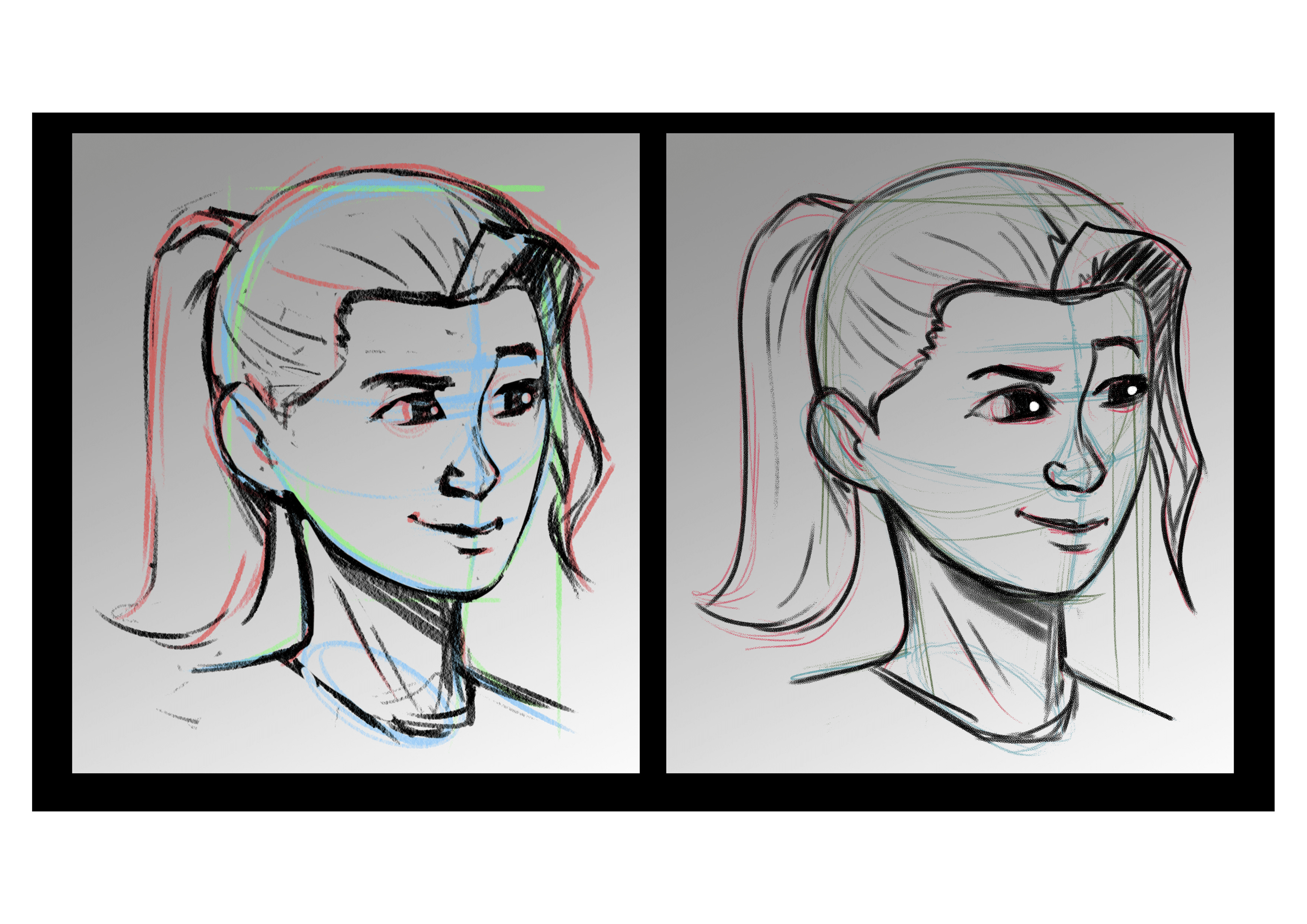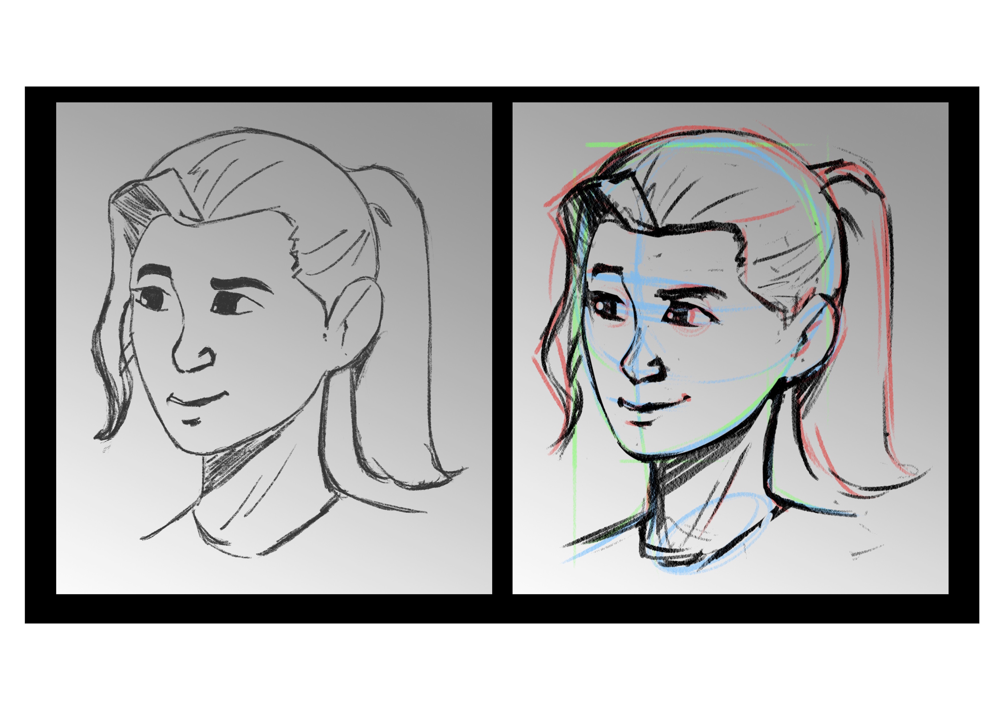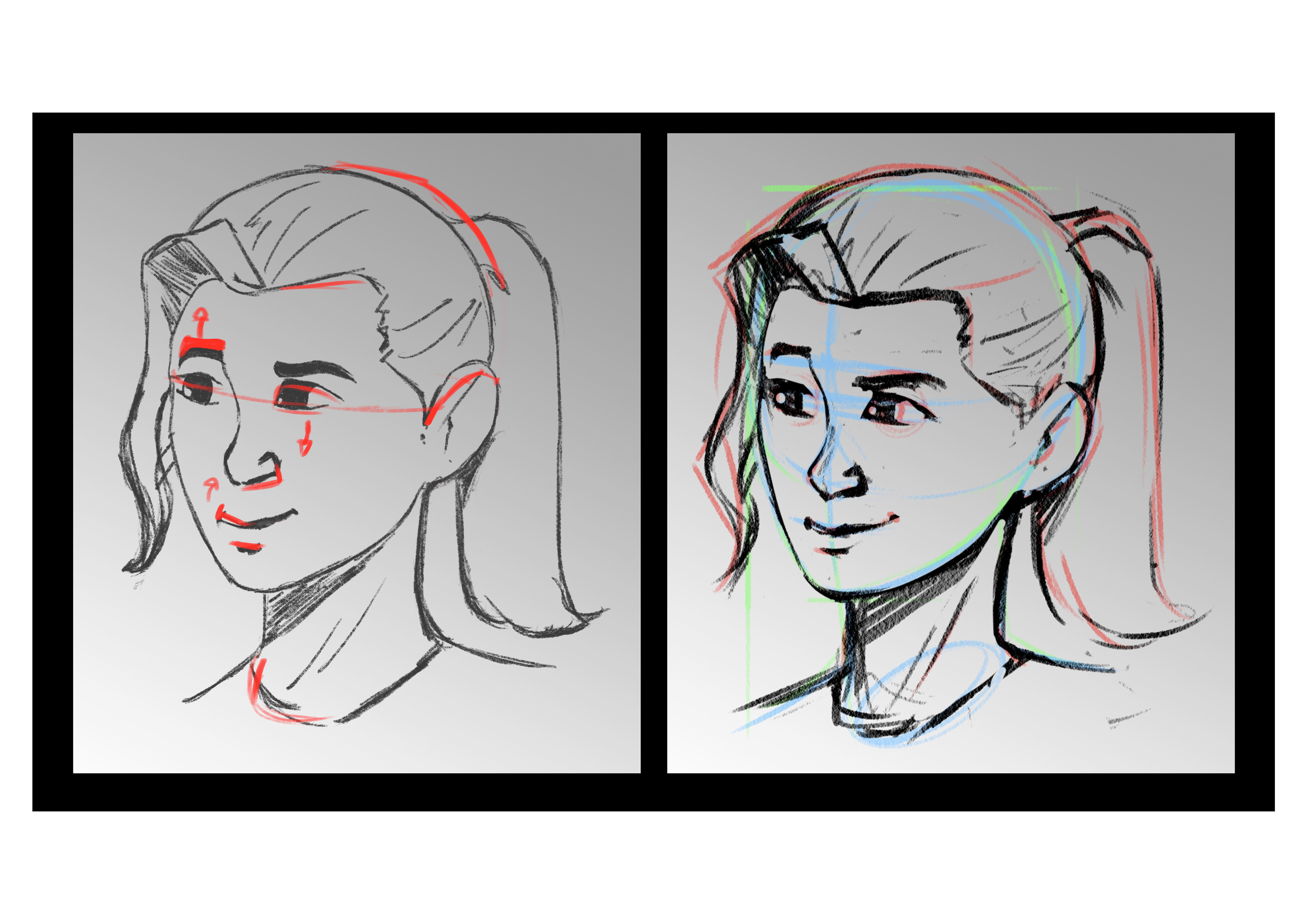 ¡Hola! ¡Encuentro su trabajo impecable! El ojo a la derecha puede ser un poco pequeño, y la barbilla ligeramente detrás, pero aparte de eso, entendiste cómo manejar la inclinación de la cabeza, el cuello, etc. ¡Buen trabajo y nos vemos muy pronto!