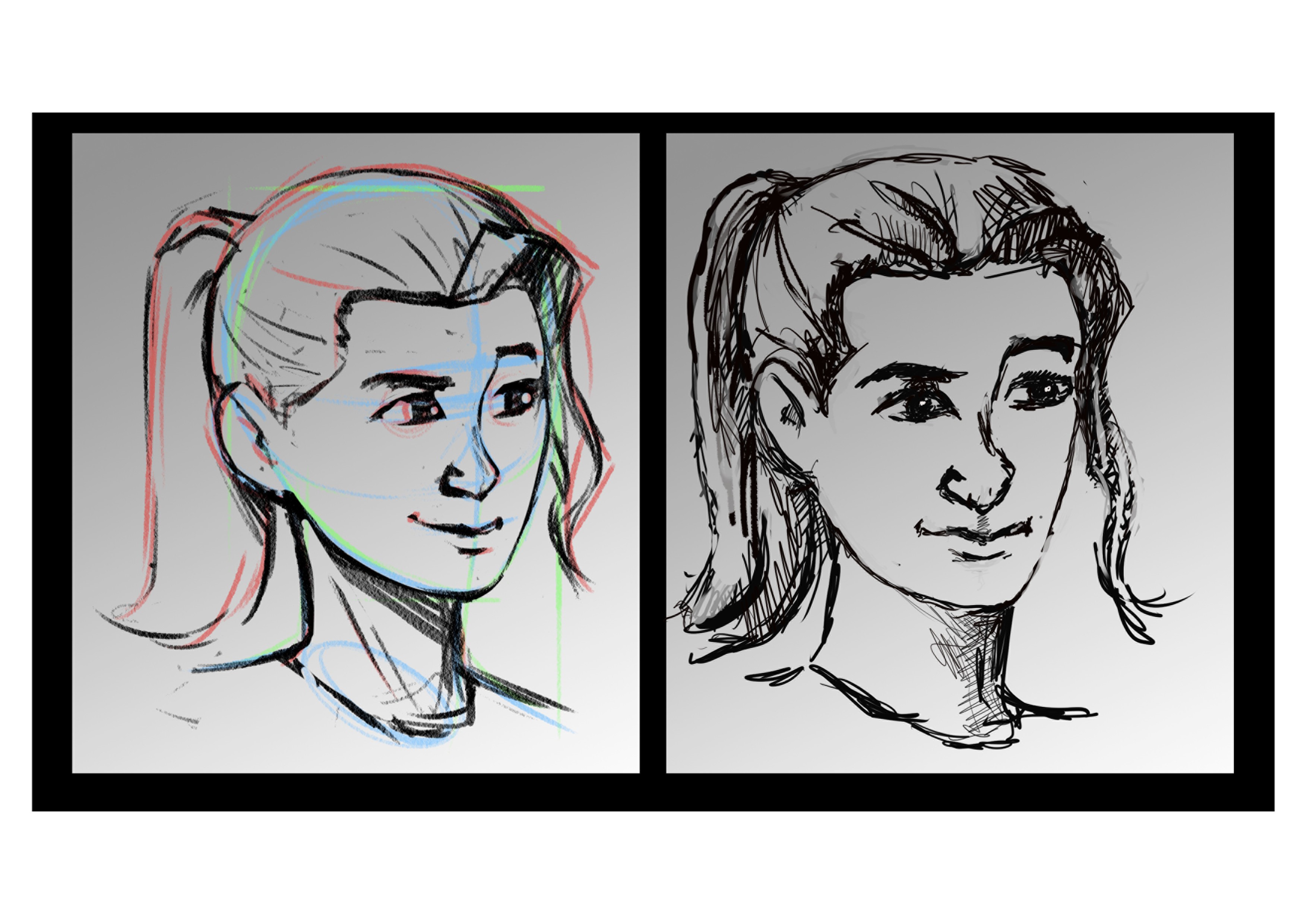 C'est beaucoup mieux au niveau du trait. attention, par contre, la construction est beaucoup moins juste, avec tout le haut du visage qui penche vers la droite. essaye de reprendre ton premier dessin, de baisser l'opacité, et de redessiner à partir de ça, pour garder le meilleur des deux mondes. Bonne continuation!