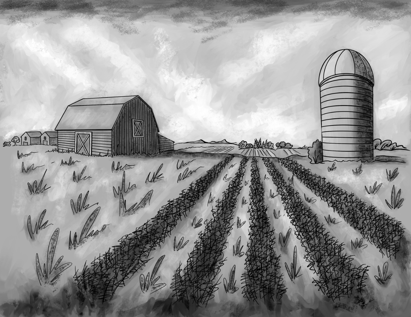 Aquí está mi ejercicio en edificios agrícolas. No pude evitar poner textura, sombras y luces.