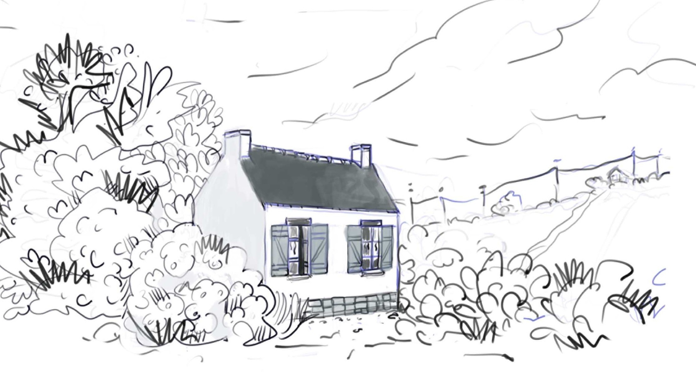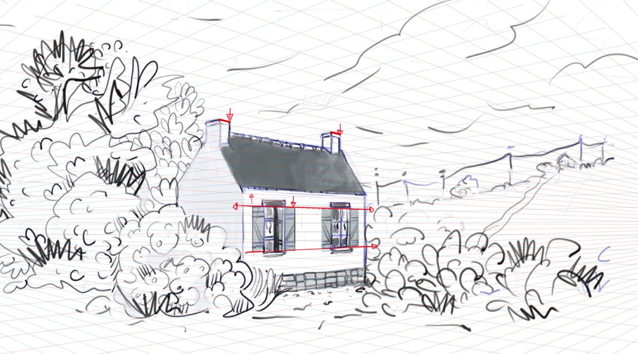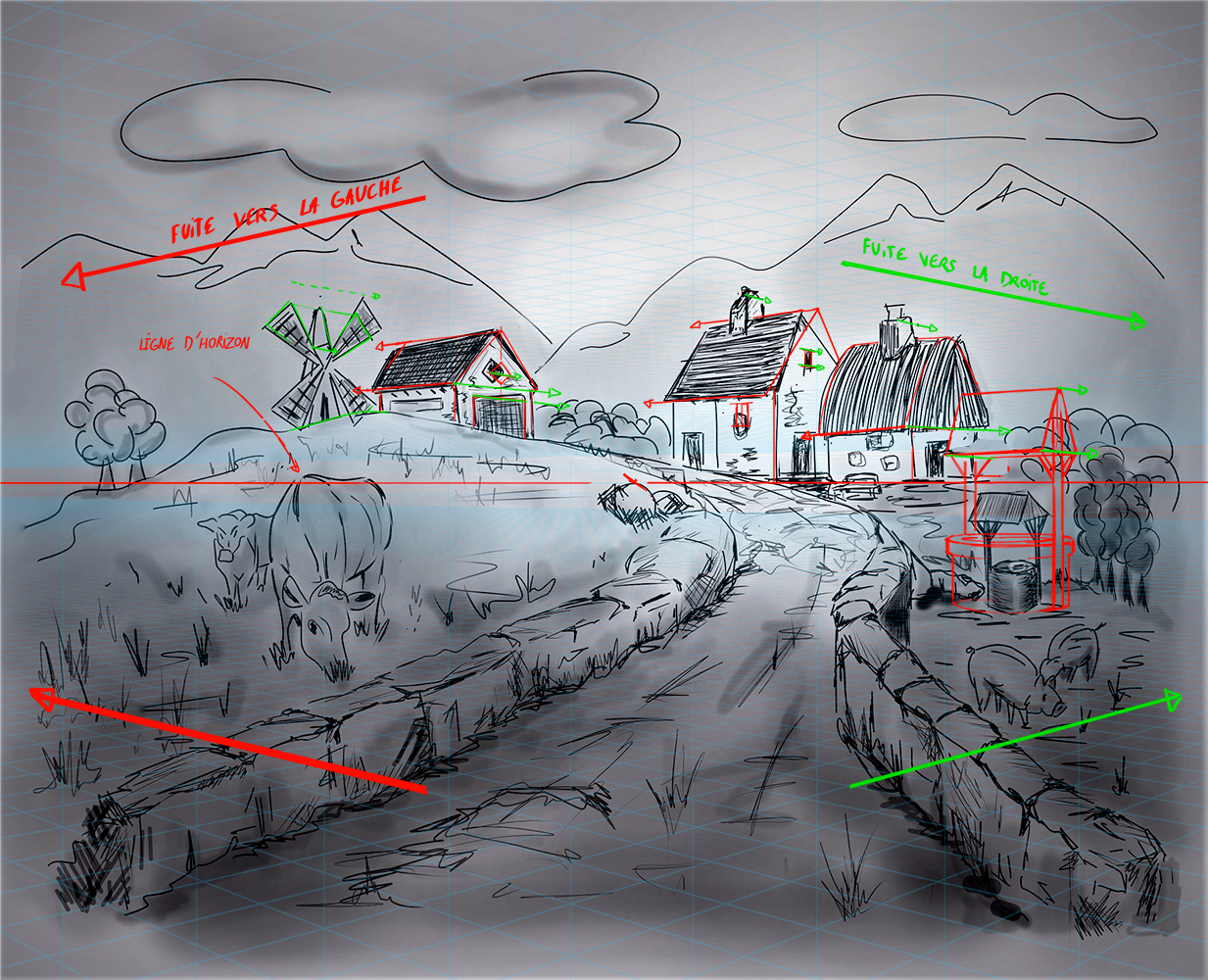 Il y a quelques lignes de construction qui devraient fuir en descendant vers la droite qui sont horizontales, voir qui montent, mais ça a tendance à être de petits détails, comme la cheminée de la maison de droite; la plus haute fenêtre de la maison du milieu, et les pâles du moulin... quand tu place un élément, réfléchis bien dans quelle direction est le point de fuite correspondant.