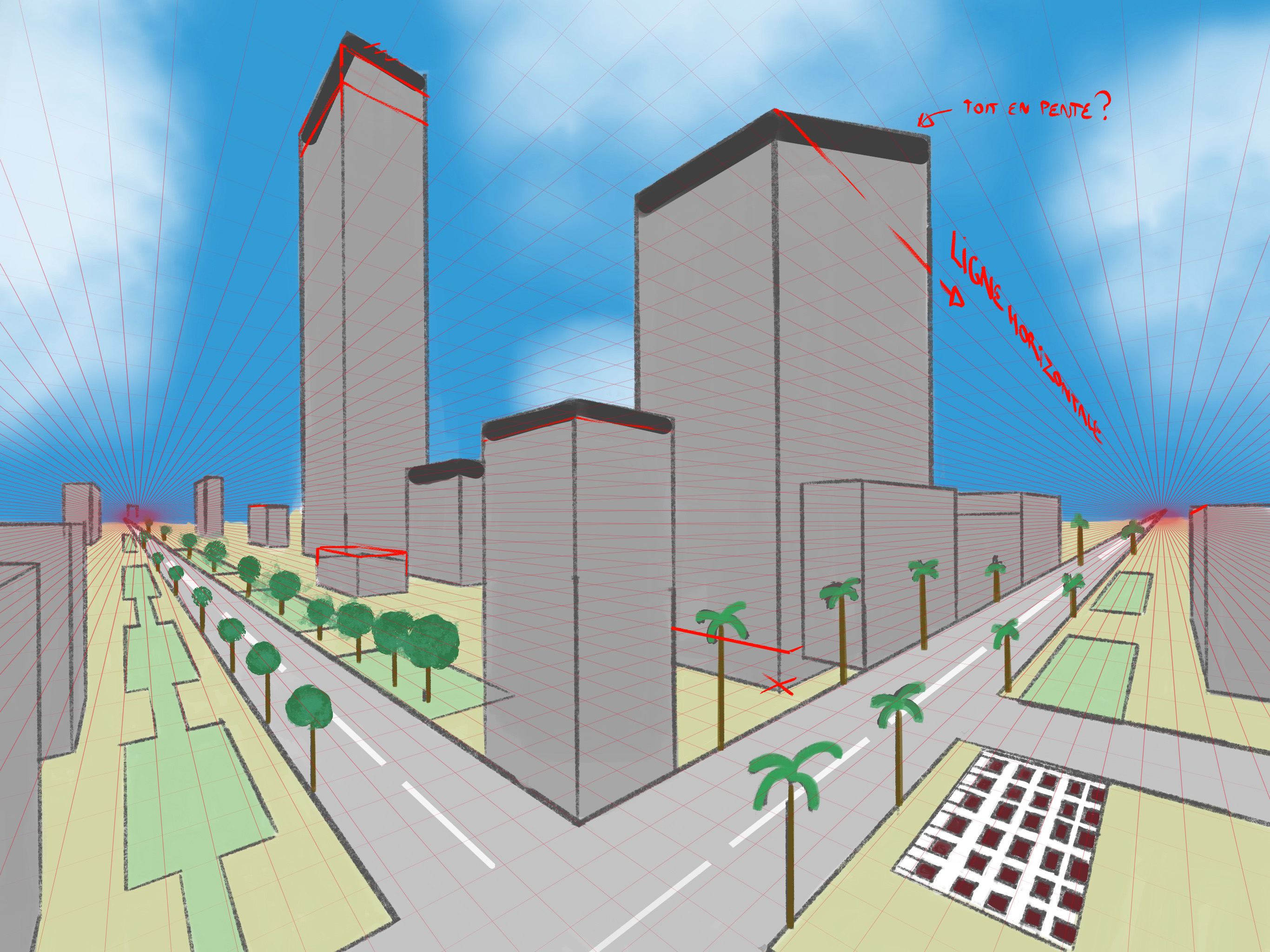 Il y a quand même quelques petites corrections à faire. la fondation du grand immeuble de droite est plus basse que celle du petit immeuble à sa droite. Il faut remonter cette fondation pour donner plus de la cohérence au volumes. notes aussi que si le pan du toit le plus à droite fuit vers le dessus de la ligne d'horizon, ça signifie que ce toit est penché. On devrait voir le dessus du toit du petit immeuble juste devant le grand immeuble de gauche.
