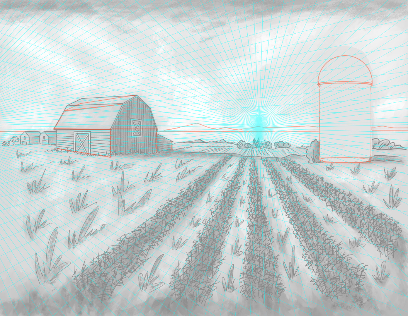 Segunda cosa: la perspectiva del silo es muy exagerada en comparación con la del granero. Para dosificar esto, debe rastrear un cuadrado en perspectiva en la parte superior e inferior del silo, ya sea usando una de las cuadrículas de perspectiva proporcionadas, o rastreando sus líneas de fuga a mano.