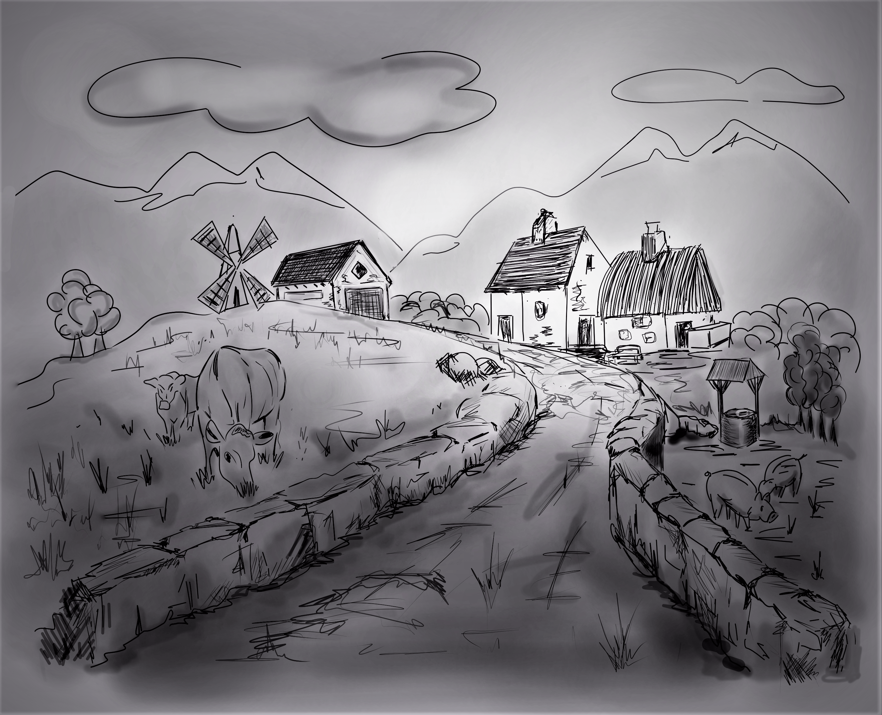 El error principal que veo es el pozo, para el cual las elipses deberían estar mucho más aplanadas, dada su proximidad a la línea del horizonte. También está mucho más cerca de nosotros que la granja, por lo que probablemente debería ser más grande en la imagen, especialmente dado el tamaño de los animales cercanos. Otra preocupación es que los postes que soportan el techo deben indicar que está casi enfrentado o en el techo en cuestión, mientras que ha dibujado el techo como si lo viera a 45 °. Dibuje los postes que pasan delante y detrás del pozo del pozo deberían darle más alivio y más coherencia entre los postes y el techo.