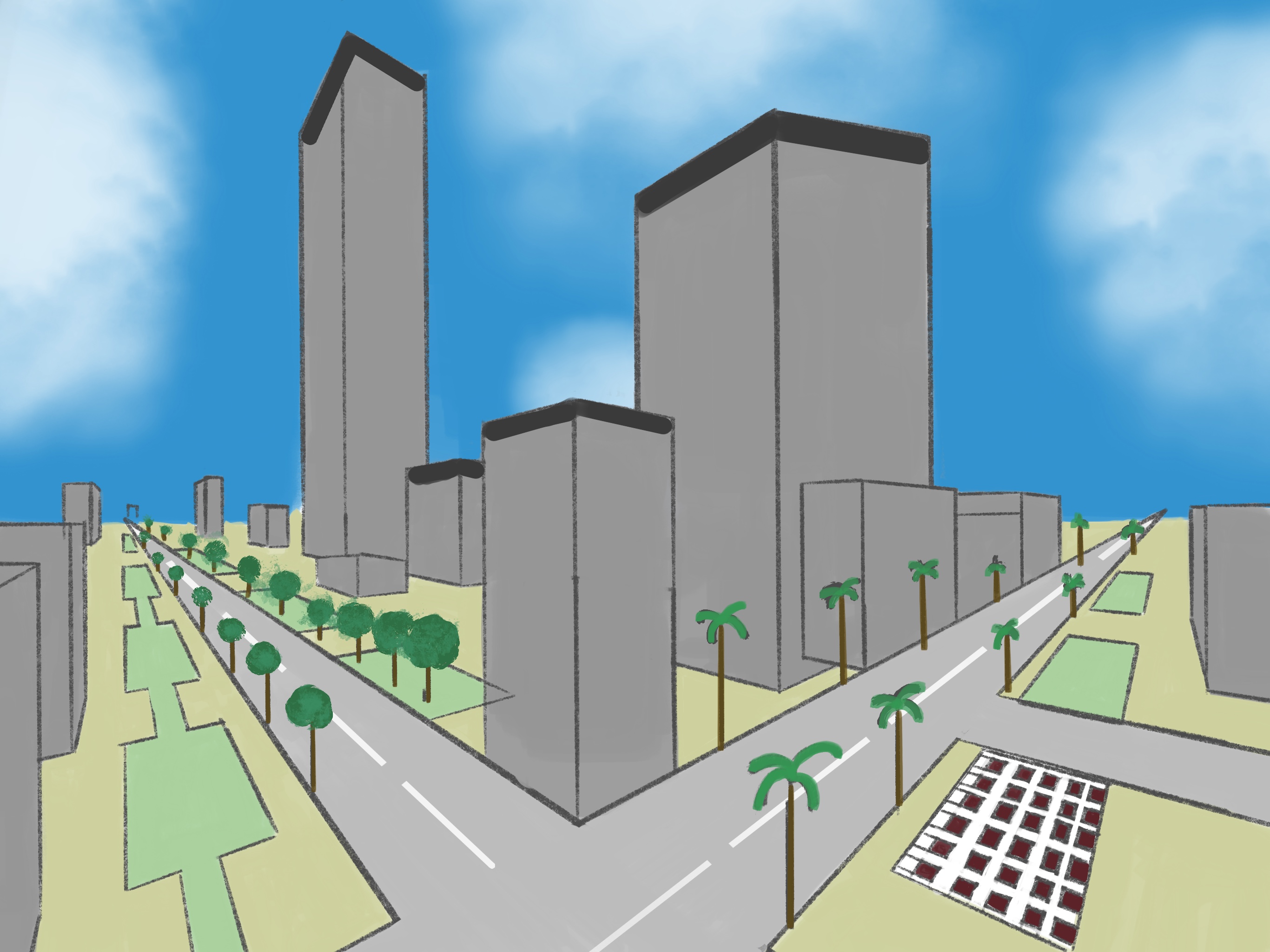 ¡Hola! Es muy bueno en general. La calle, los árboles y la mayoría de los edificios siguen su perspectiva de manera coherente, por lo que para un primer intento es excelente.