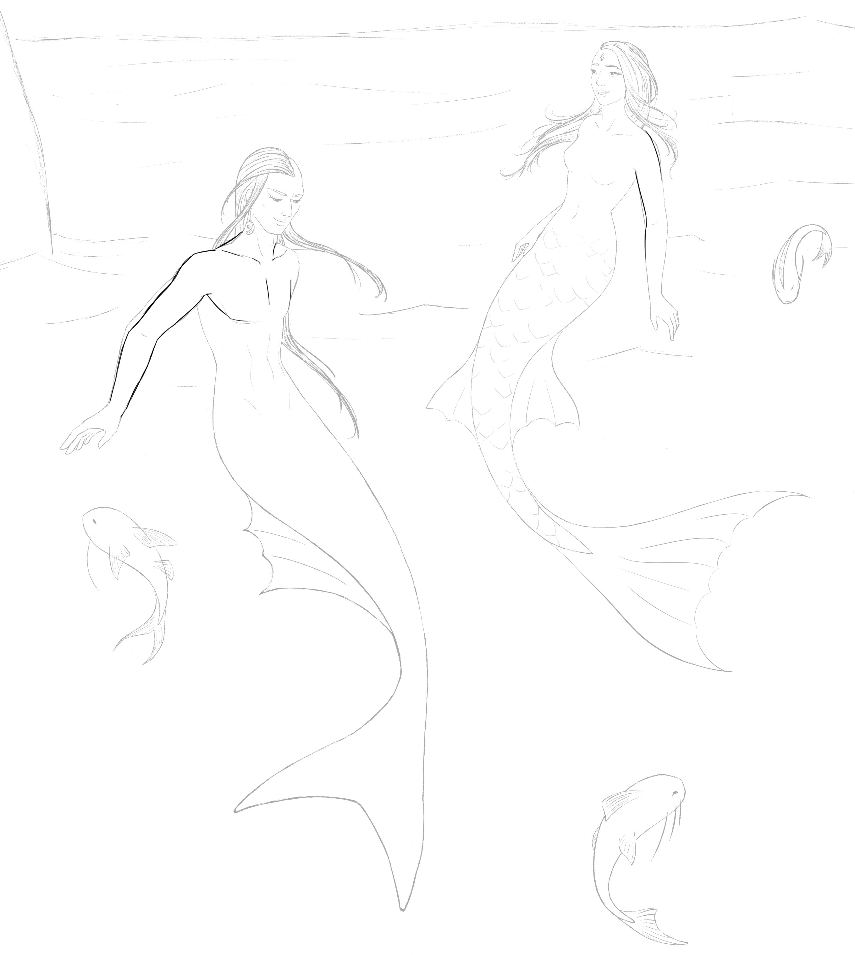 Vos mots m'ont fait du bien donc j'ai repris le dessin des sirènes en essayant de leur donner des postures plus pertinentes.
