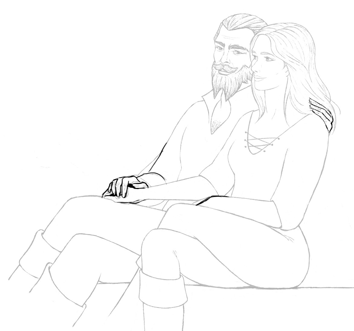 Je suis légèrement indécise quand à la main du guerrier (celle qui est posée sur le poing de la demoiselle). Quand on regarde notre propre main fermée sous un angle identique, on sait qu'on voit une partie de la paume et le haut du pouce qui dépasse mais délicat de savoir dans quelles proportions, surtout que derrière, le poignet peut à la fois être cambré ou droit, quoi choisir ? Il y a aussi une perspective avec le bras mais pas tellement importante ... donc par quoi le remplir ? On sait qu'il y a le tissu du vêtement, et c'est tout ?