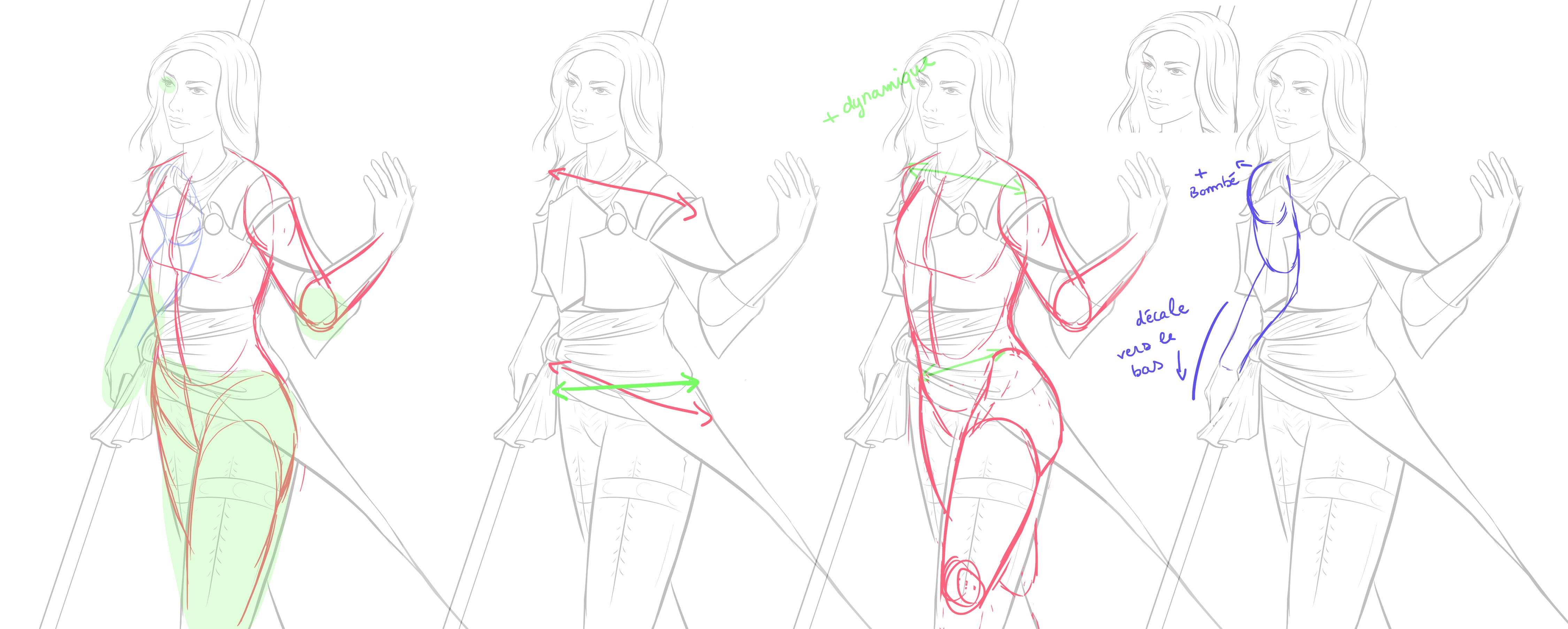 El segundo boceto muestra la línea que elegiste para tu personaje entre sus hombros y sus caderas. Los tuyos están casi alineados. Es bastante raro tener las dos líneas paralelas como esa, congela el carácter, si desea ganar en el dinamismo y en el movimiento, o simplemente tener una pose más natural, debe incluir según los ángulos opuestos los hombros y las caderas (corrección verde, por ejemplo).