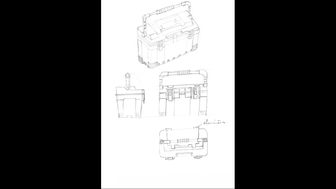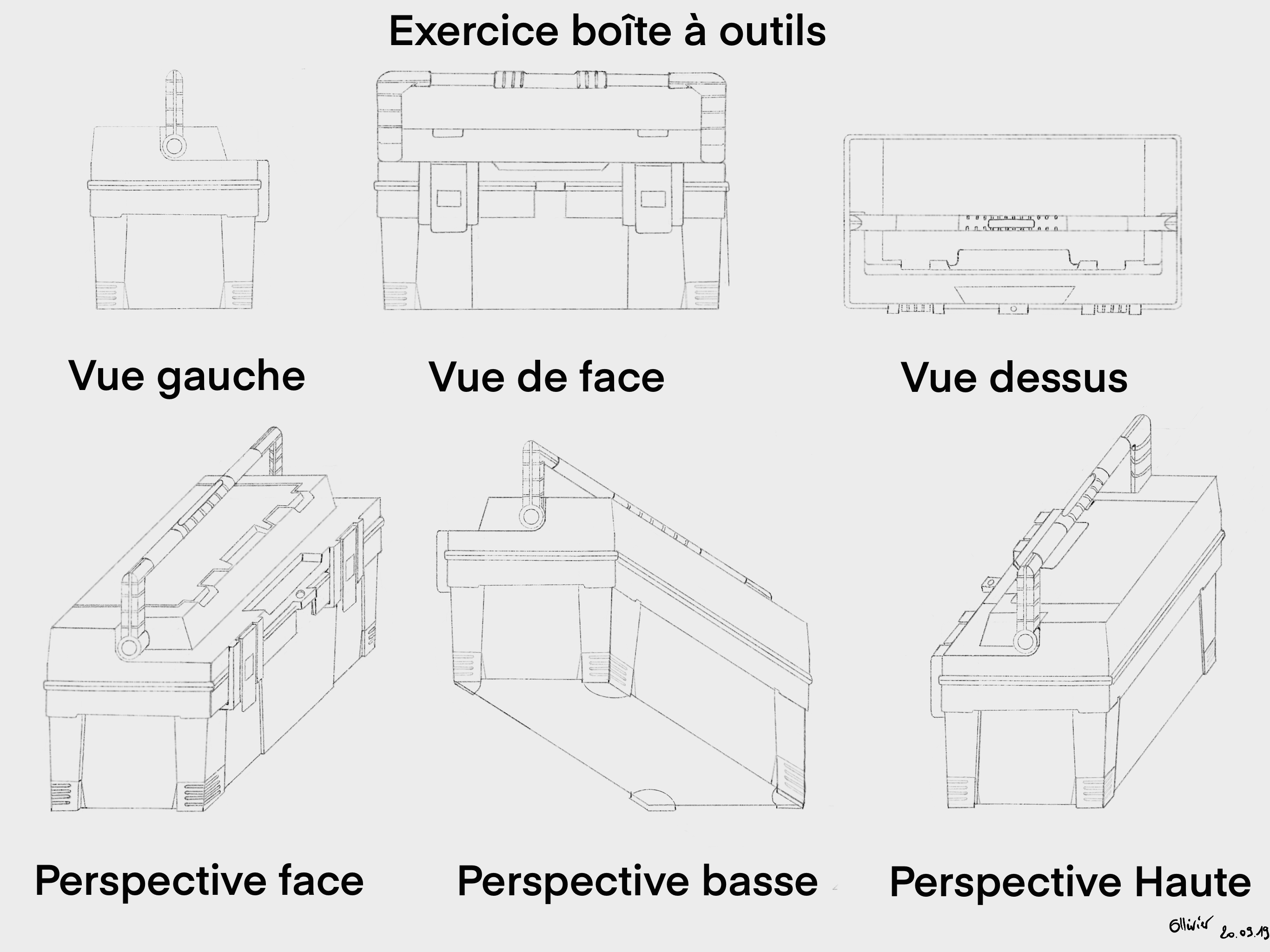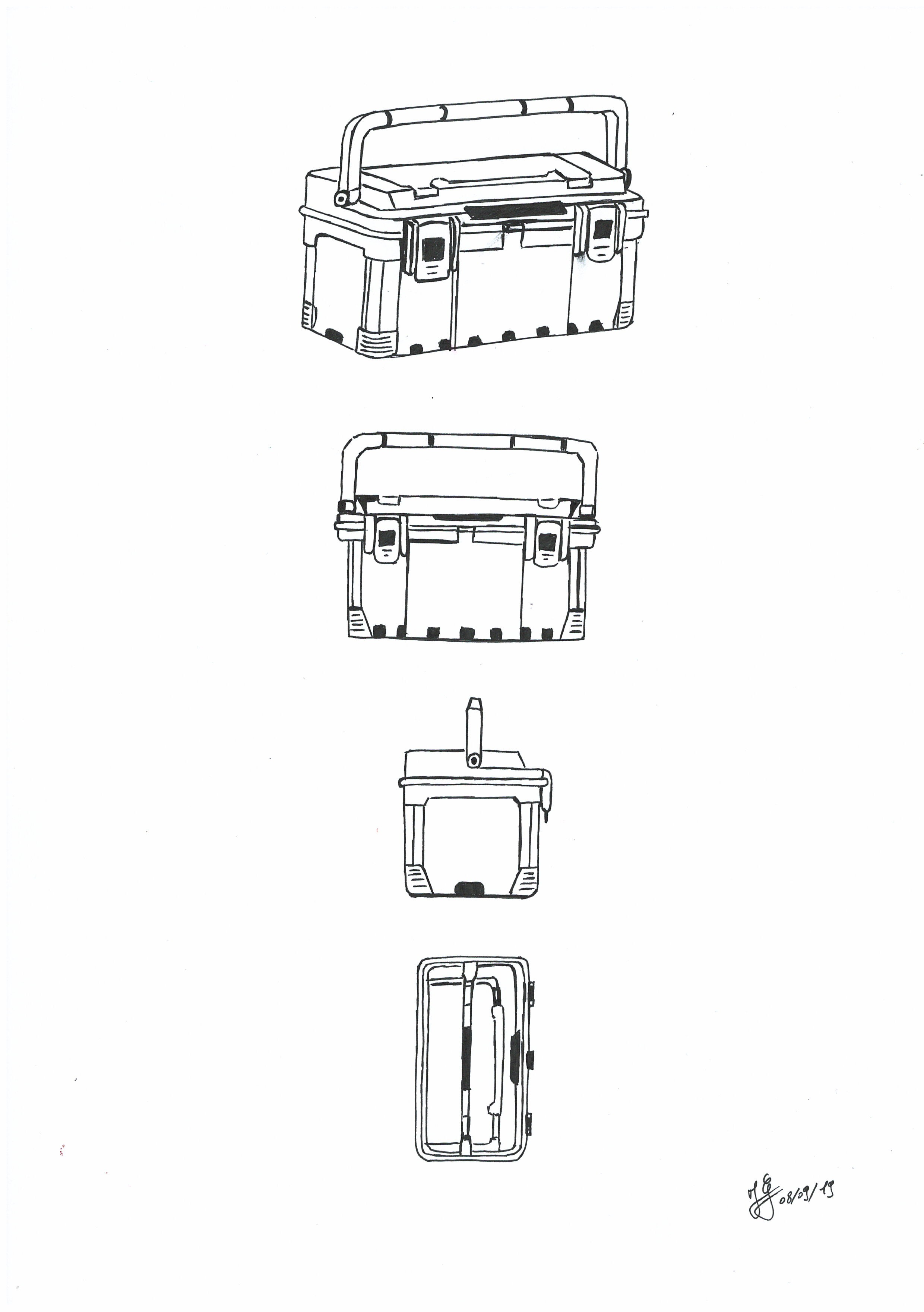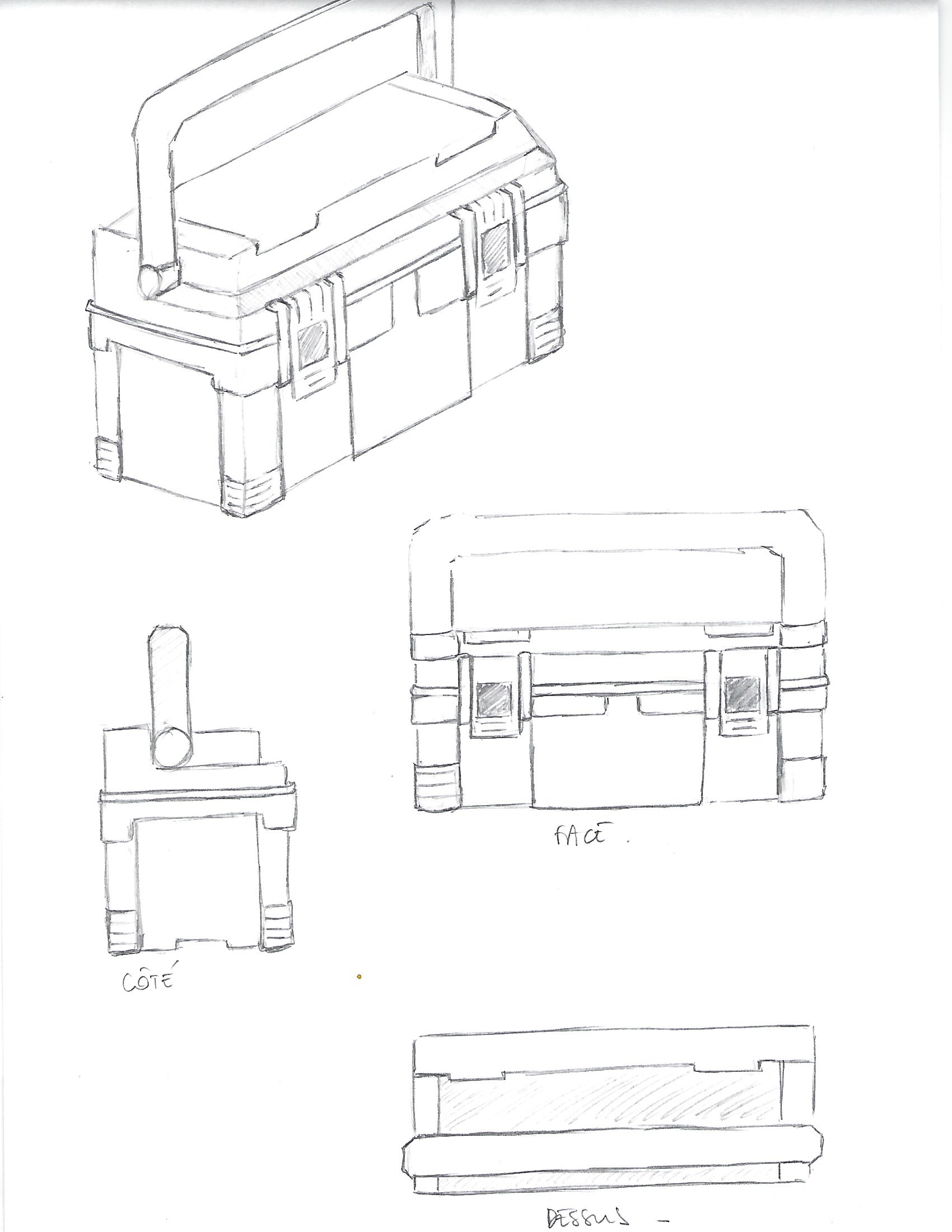Voici mon étude de la boîte à outil ! en le numérisant je viens de m’apercevoir que, sur la vue de profil, j'ai mal placé le bas de l'anse du côté droit (le plus éloigné). Les deux côtés ne sont pas au même niveau .