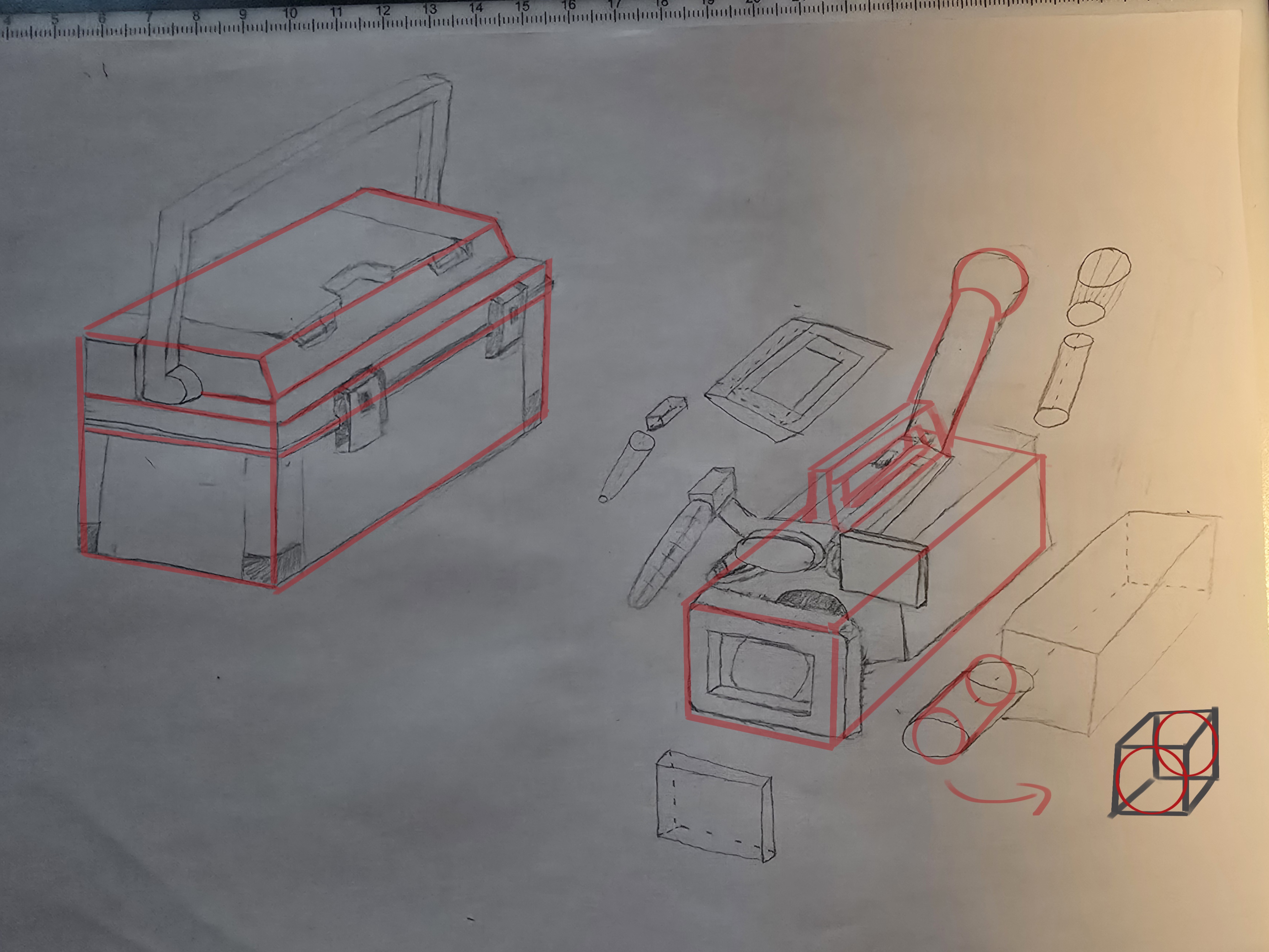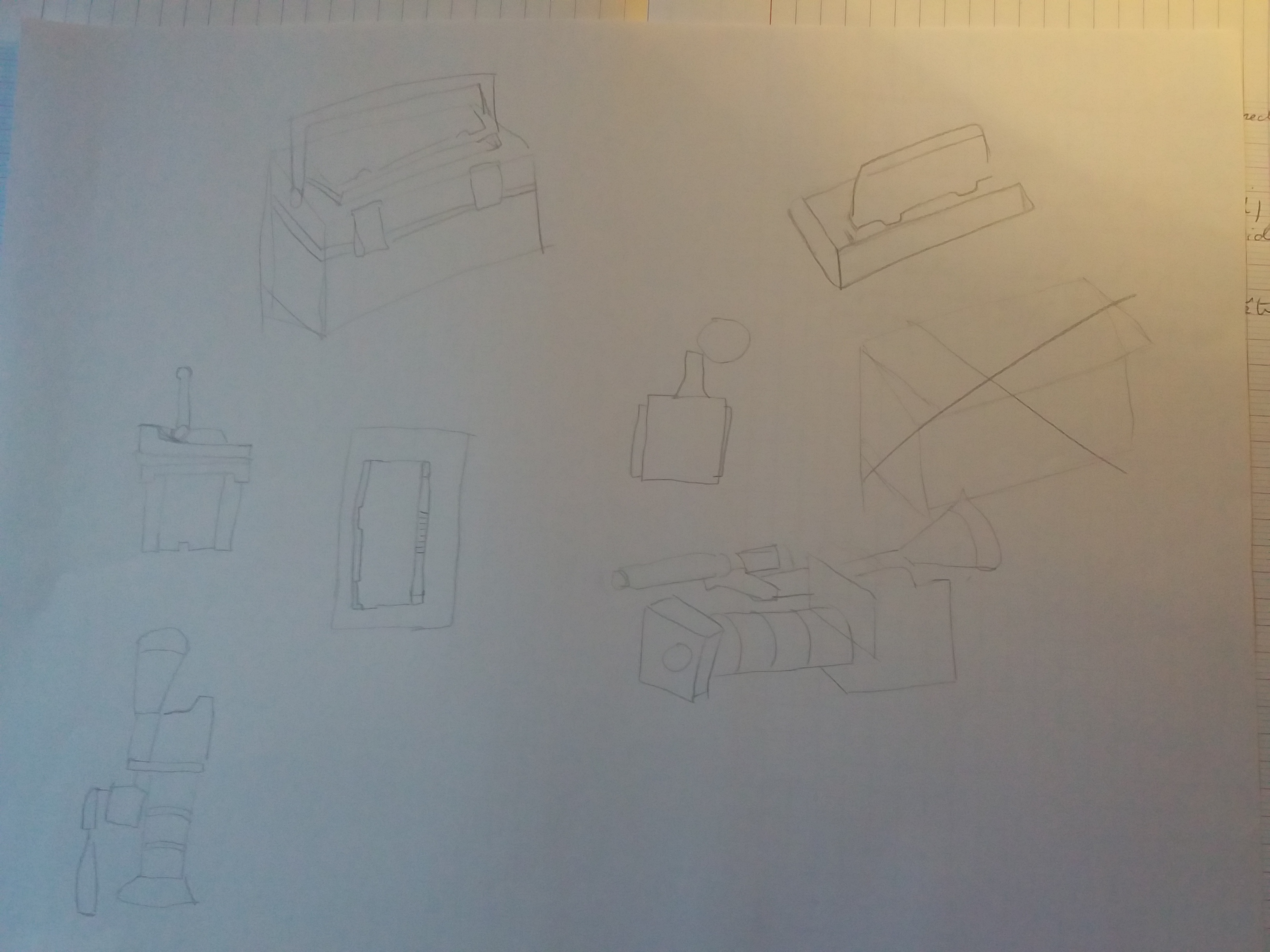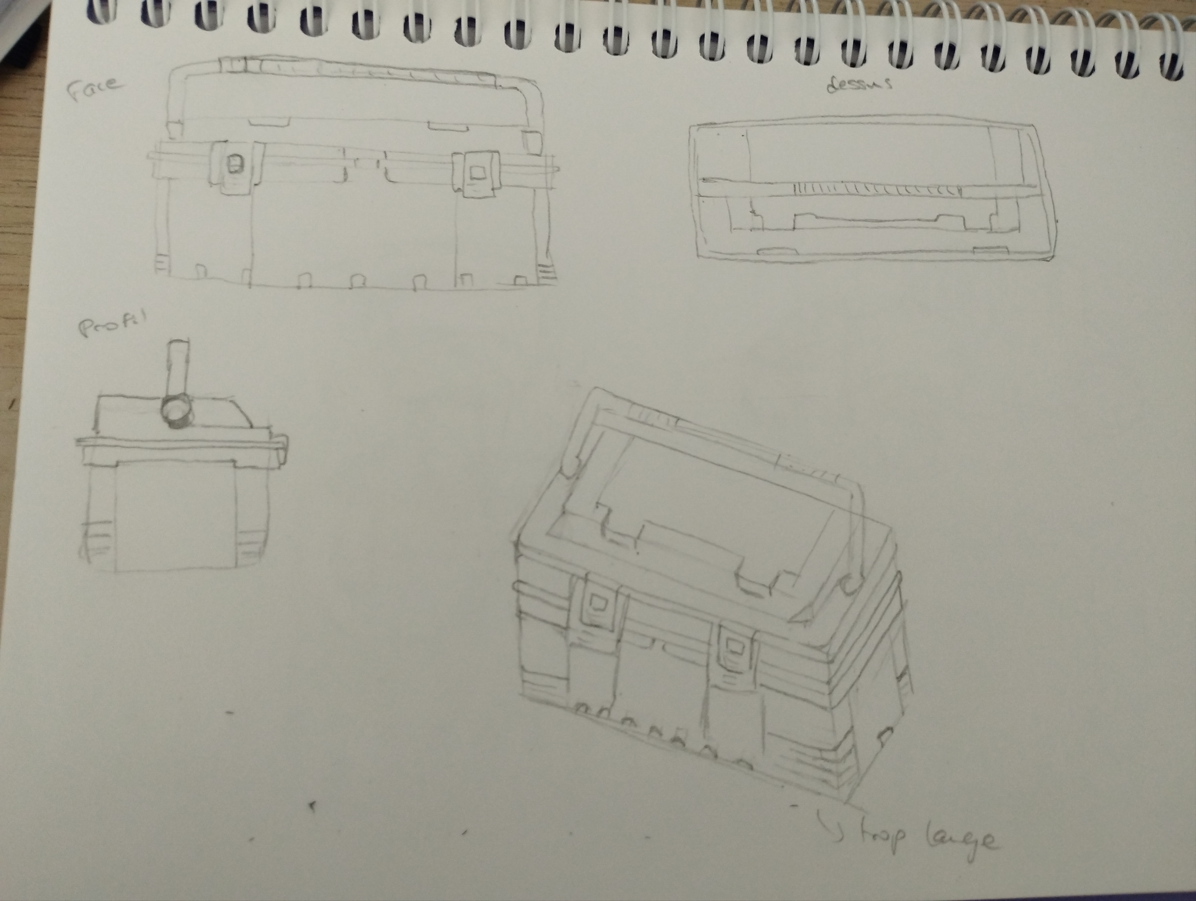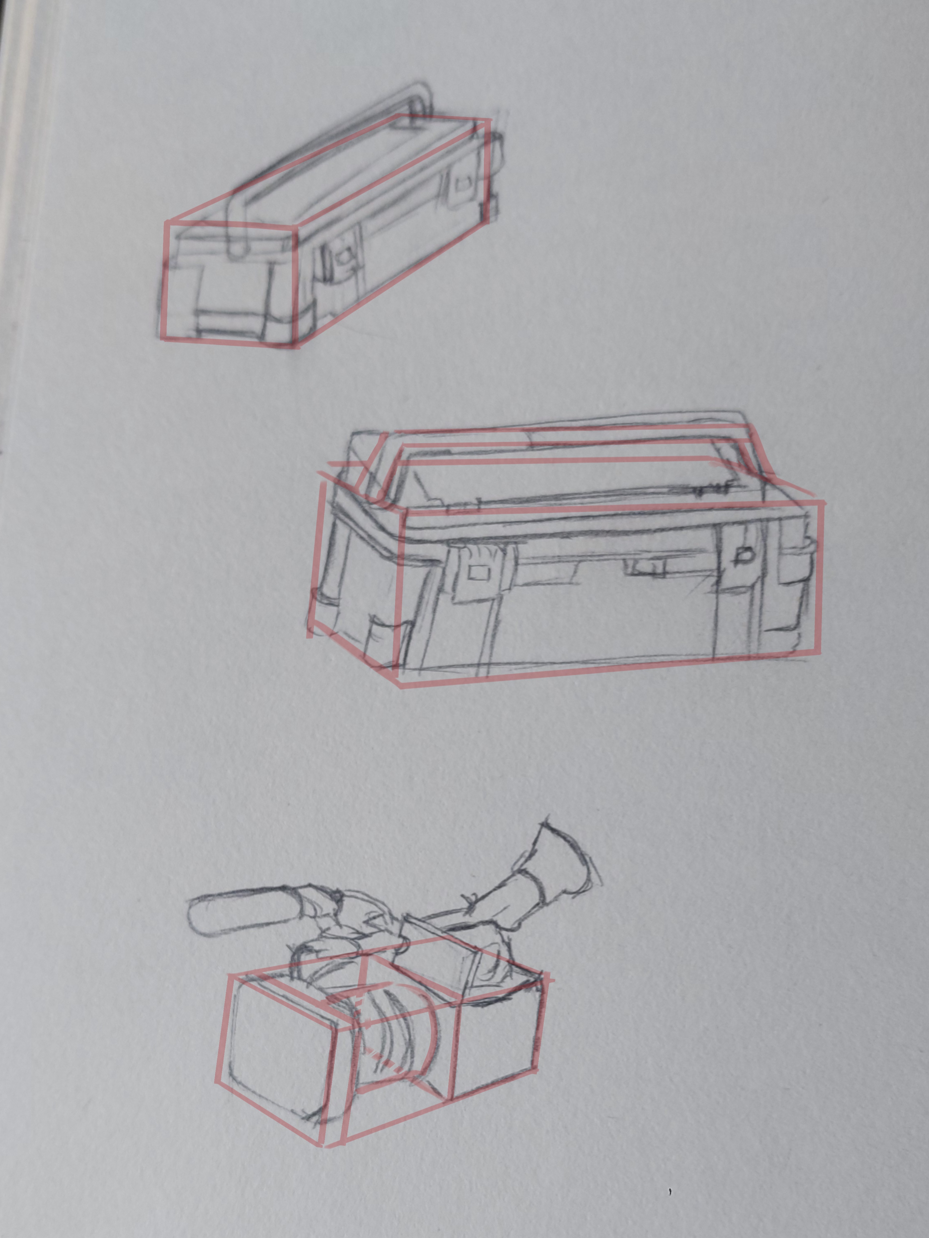 Bonjour, voici mes croquis pour le coffre et la caméra