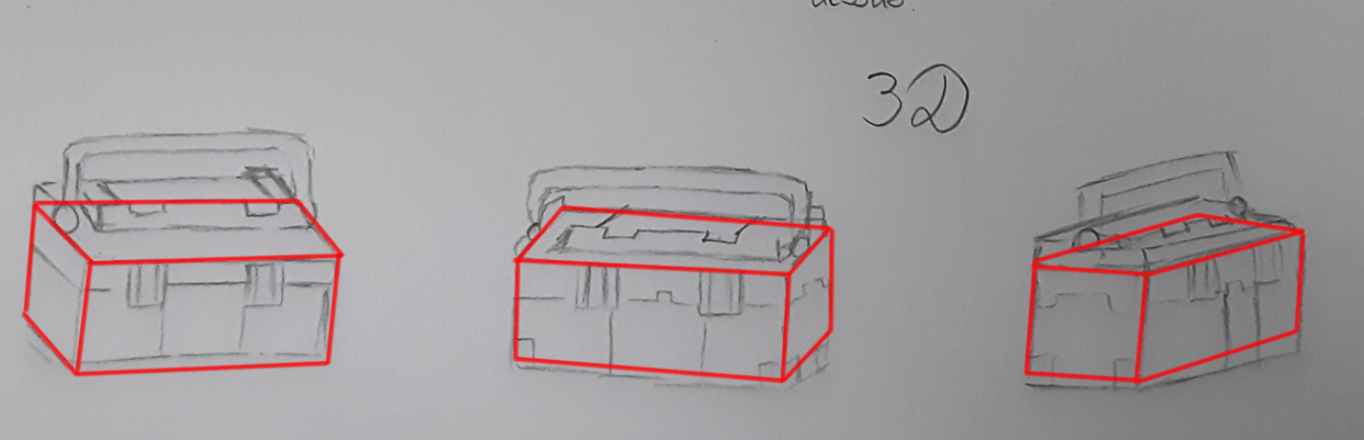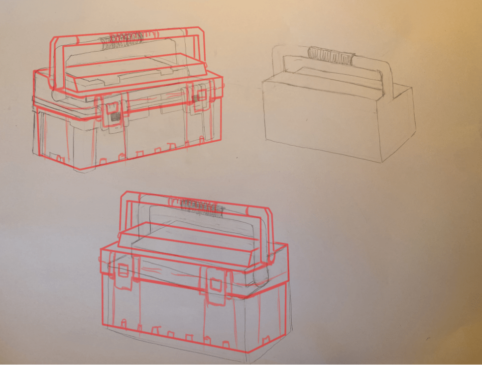 El detalle está en no desistir y continuar intentando probando cosas nuevas, en este paso te propongo hacer tus dibujos un poco más grandes, de modo que puedas tener mayor control del espacio y los detalles. También observa por áreas, empezando por las más fáciles de identificar, como los seguros de la caja, y desde ahí vas agregando los detalles más cercanos.
