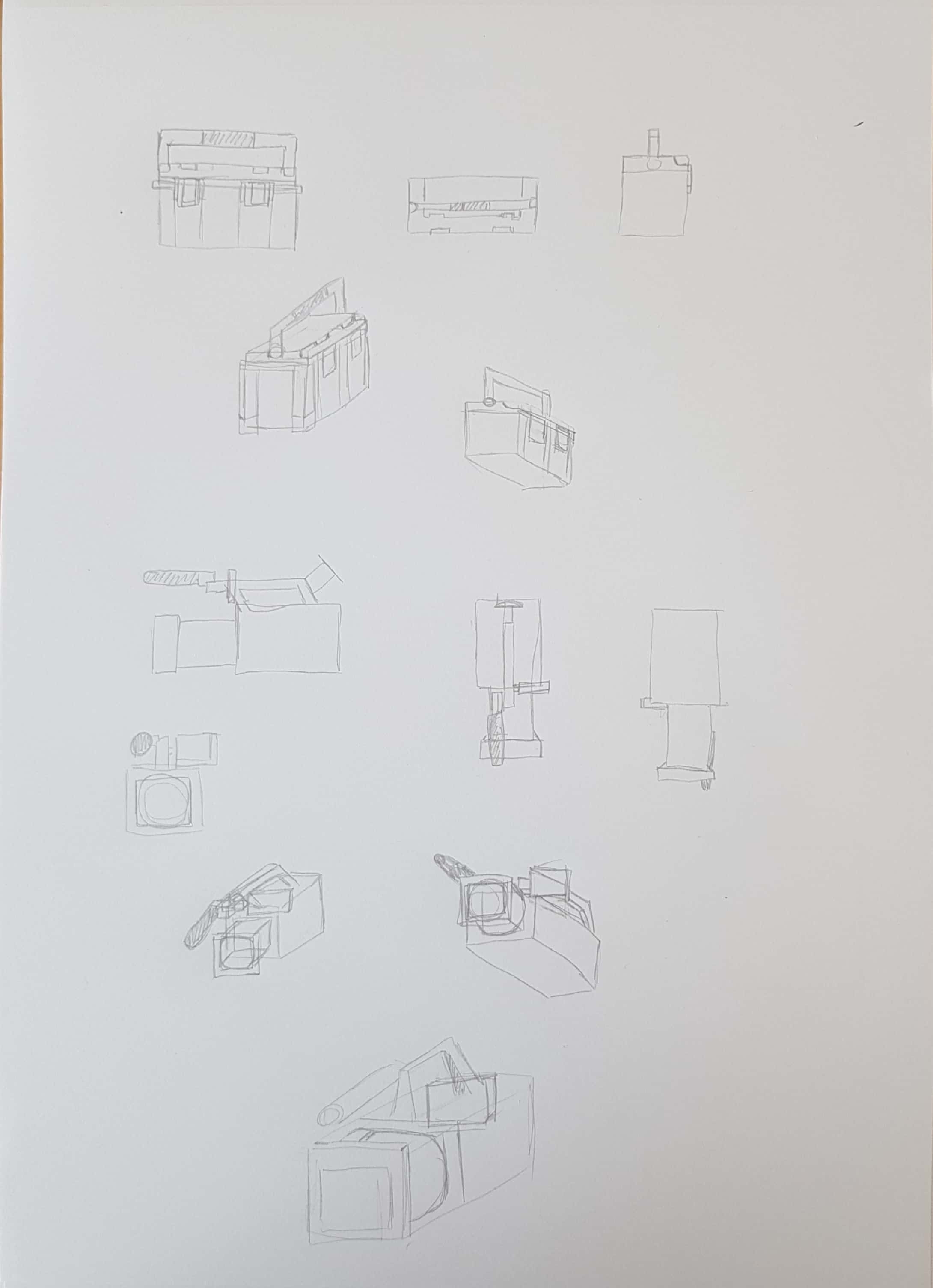 A la fin de la vidéo, quand j'ai vu le premier exercice (boîte à outil), aux premiers abords, je me suis dit : "Un rectangle en volume, cela a l'air assez simple ...". J'ai très vite changé d'avis quand j'ai commencé à observer l'objet en détail et que j'ai pris conscience des rebords, reliefs, recoins, proportions etc ... Cela a été un un peu casse-tête pour moi et j'ai du m'y reprendre plusieurs fois (et surtout marquer des pauses) pour comprendre et essayer de dessiner certaines parties de la boîte. En tout cas, au-delà de l'aspect technique, tes cours me donnent envie de persévérer et de recommencer sans me décourager (ce qui n'est pas mon fort à la base). Prochaine étape, la caméra, ça se complique 🙂 !
