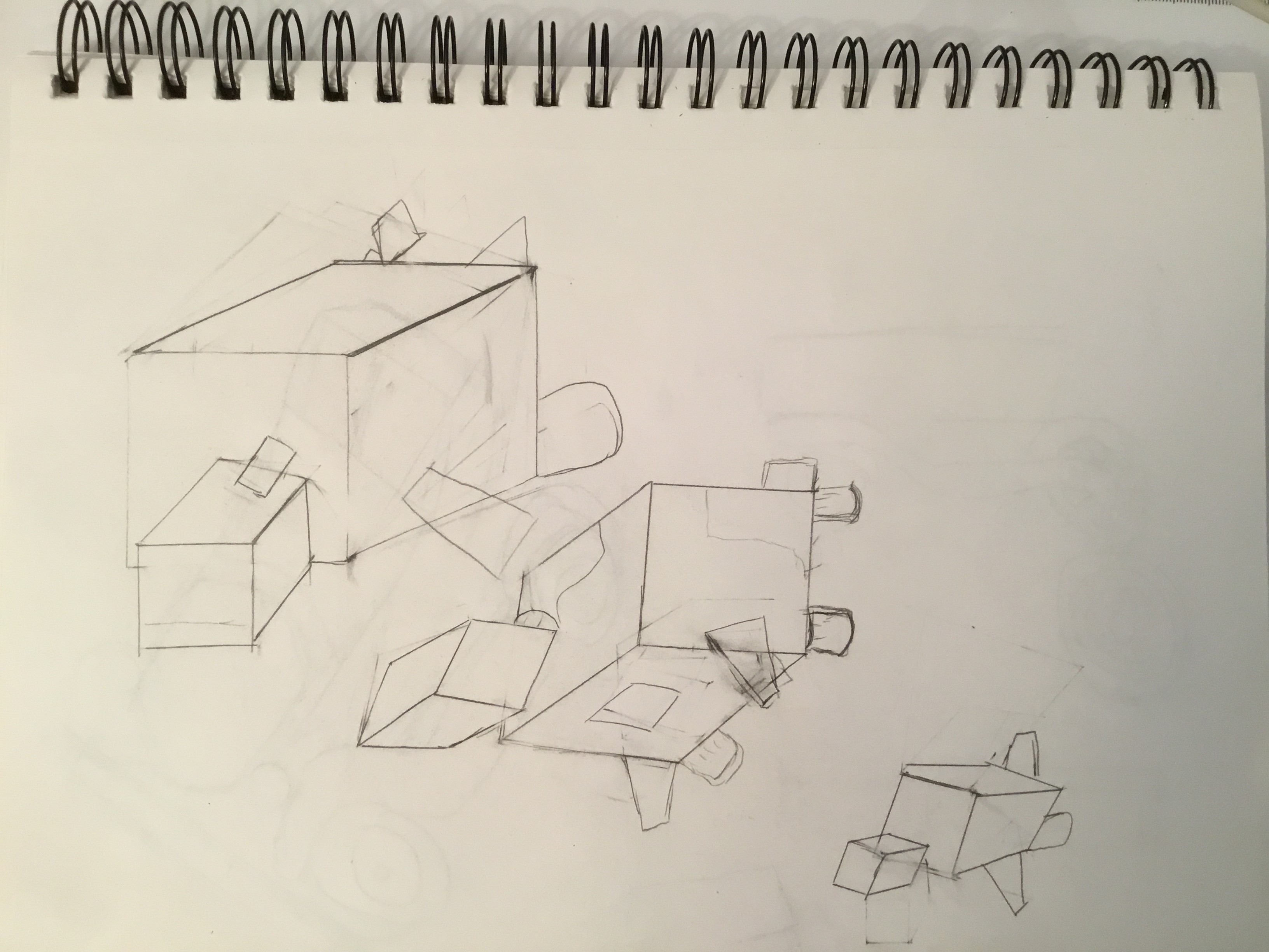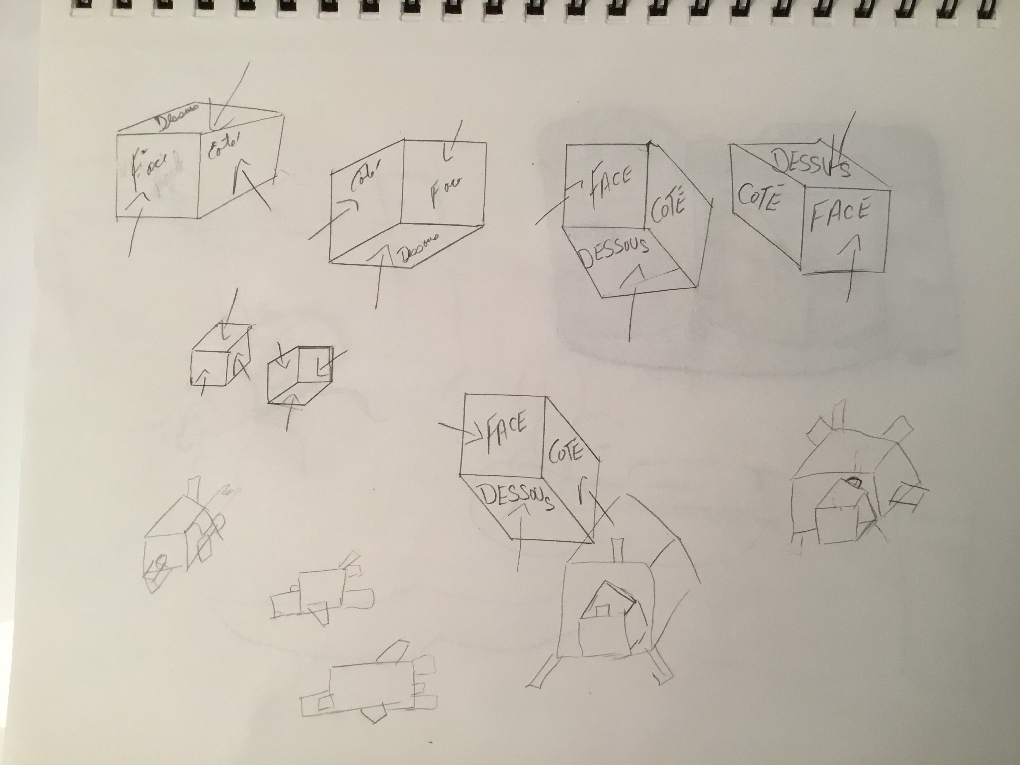 En revanche, je pense sincèrement que pour le dessin, tout le monde est capable d'apprendre. Ceci dit, certaines personnes ont plus difficultés que d'autres sur certains aspect, c'est normal. Dans ton cas, comme tu le dis, tu as beaucoup de mal à voir les choses en volume. Je crois que cela vient de ton manque d'expérience et de pratique ! Ce n'est pas ta main qui a du mal, et ce n'est pas non plus un problème d'organisation (tes dessins sont propres et clair). À mon avis, c'est ton œil que tu dois entraîner.