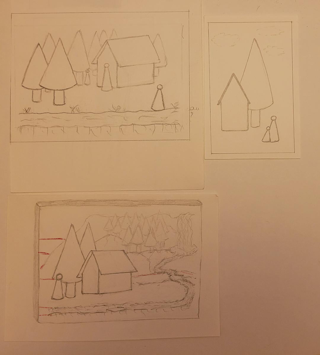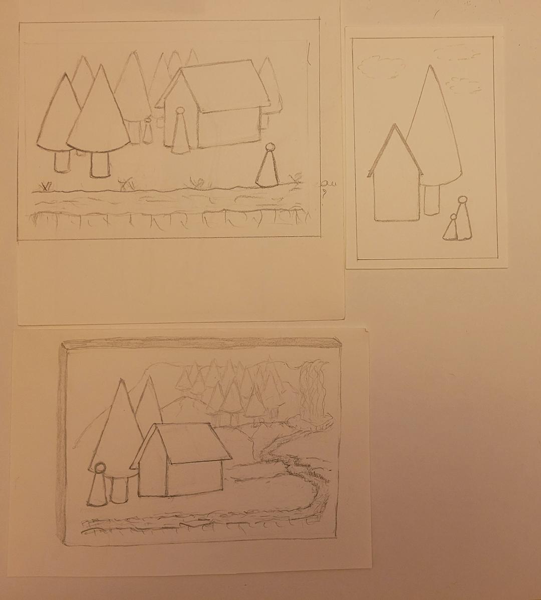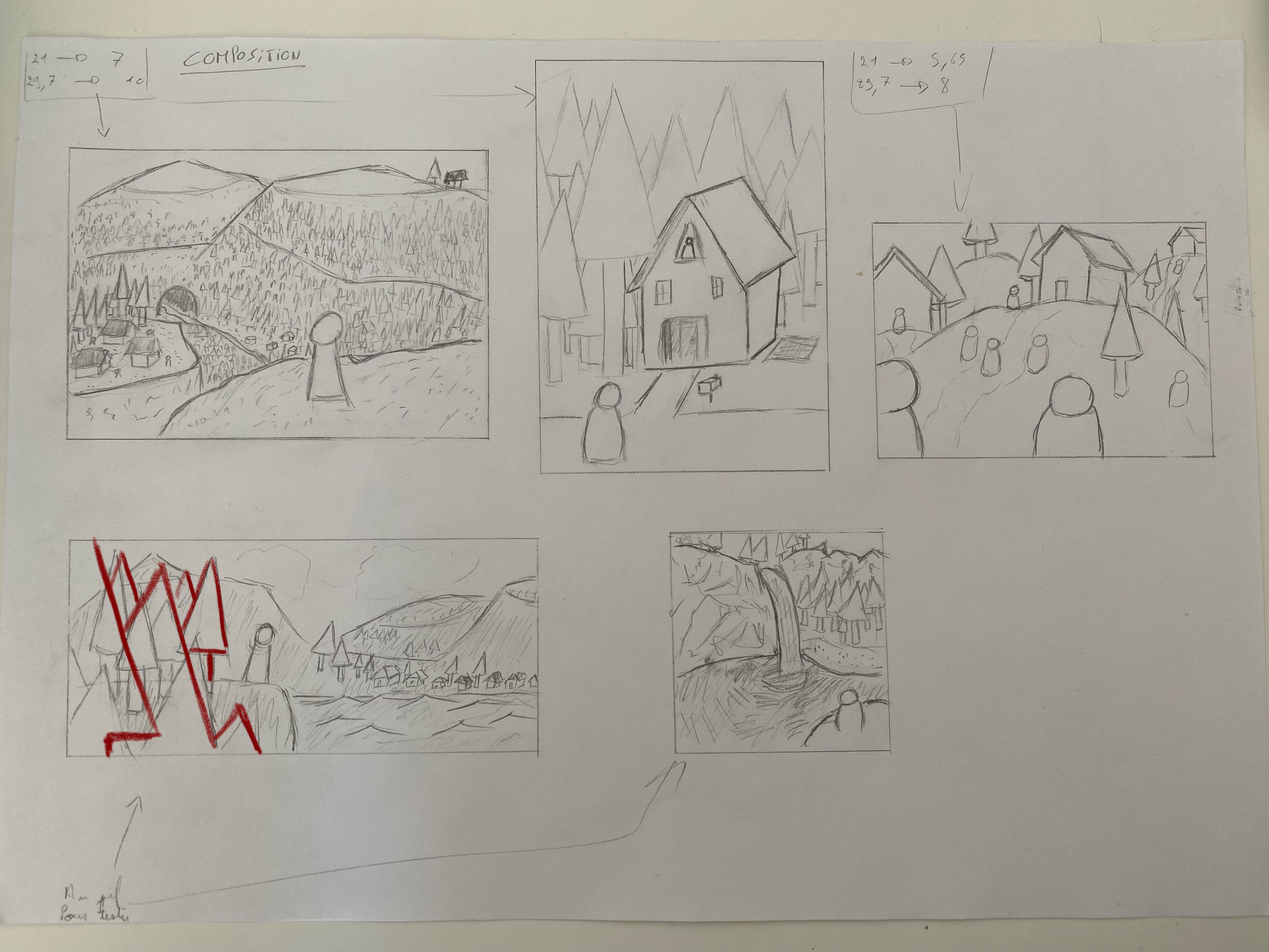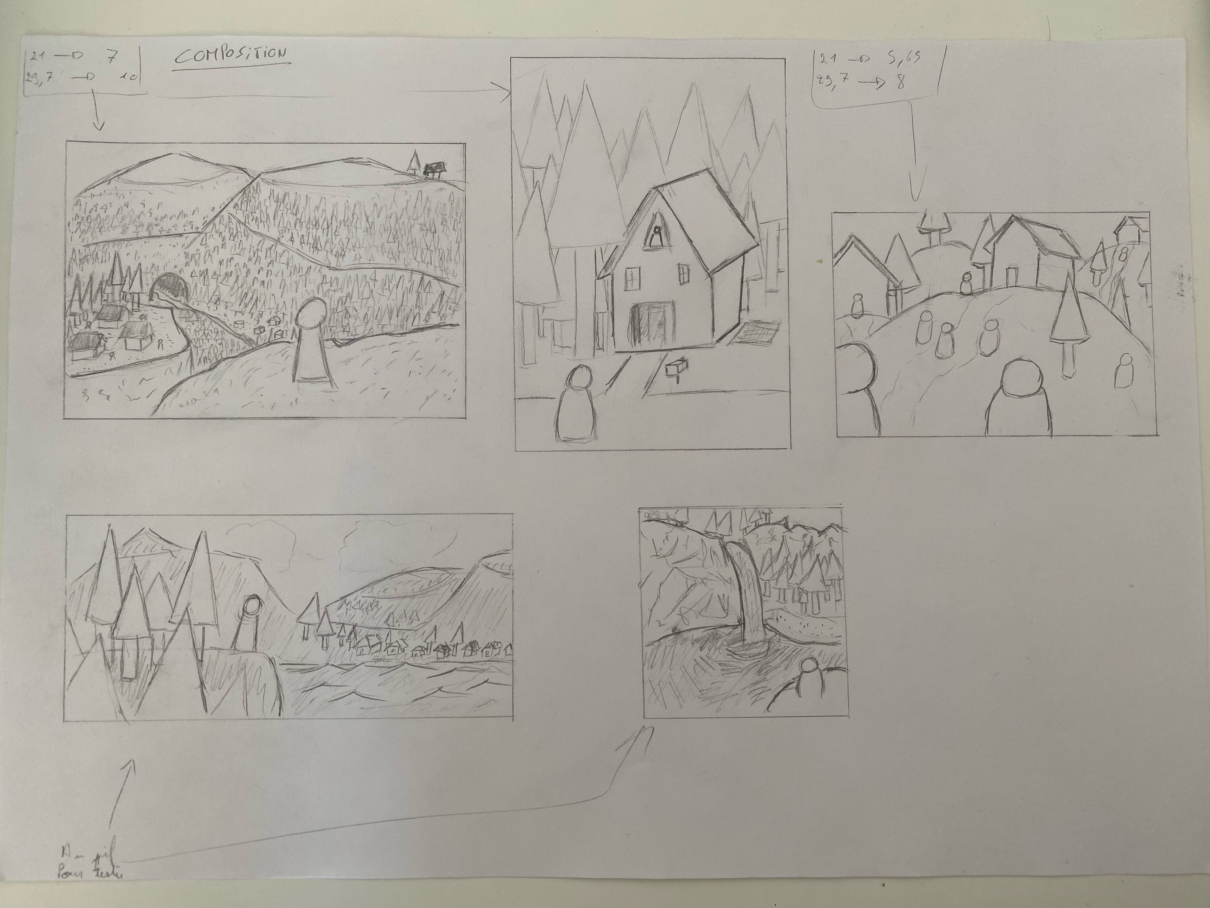 Aquí están mis composiciones. En el segundo, (paisaje A4), estos son personajes escondidos detrás de los árboles que observan la casa ... :-)