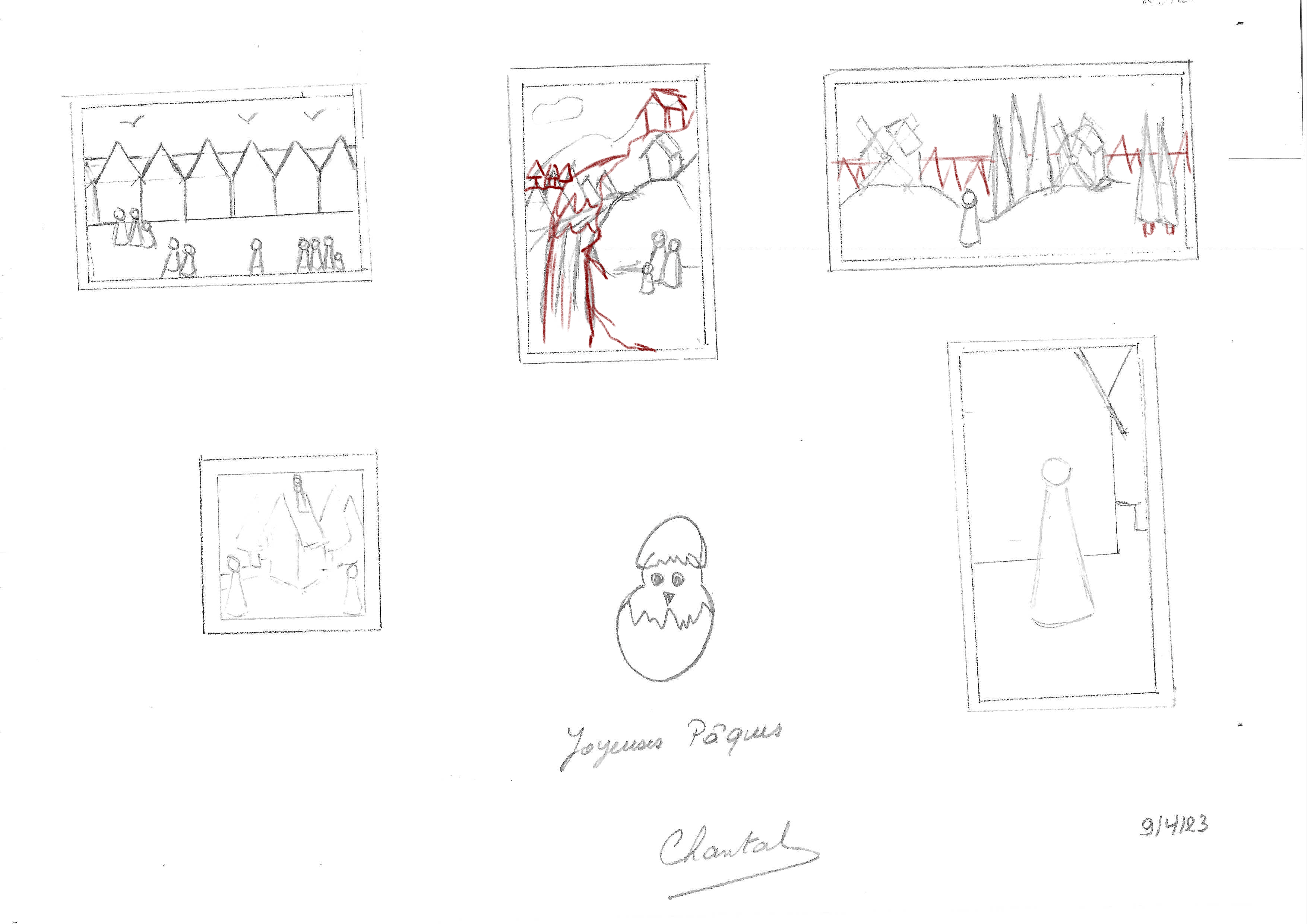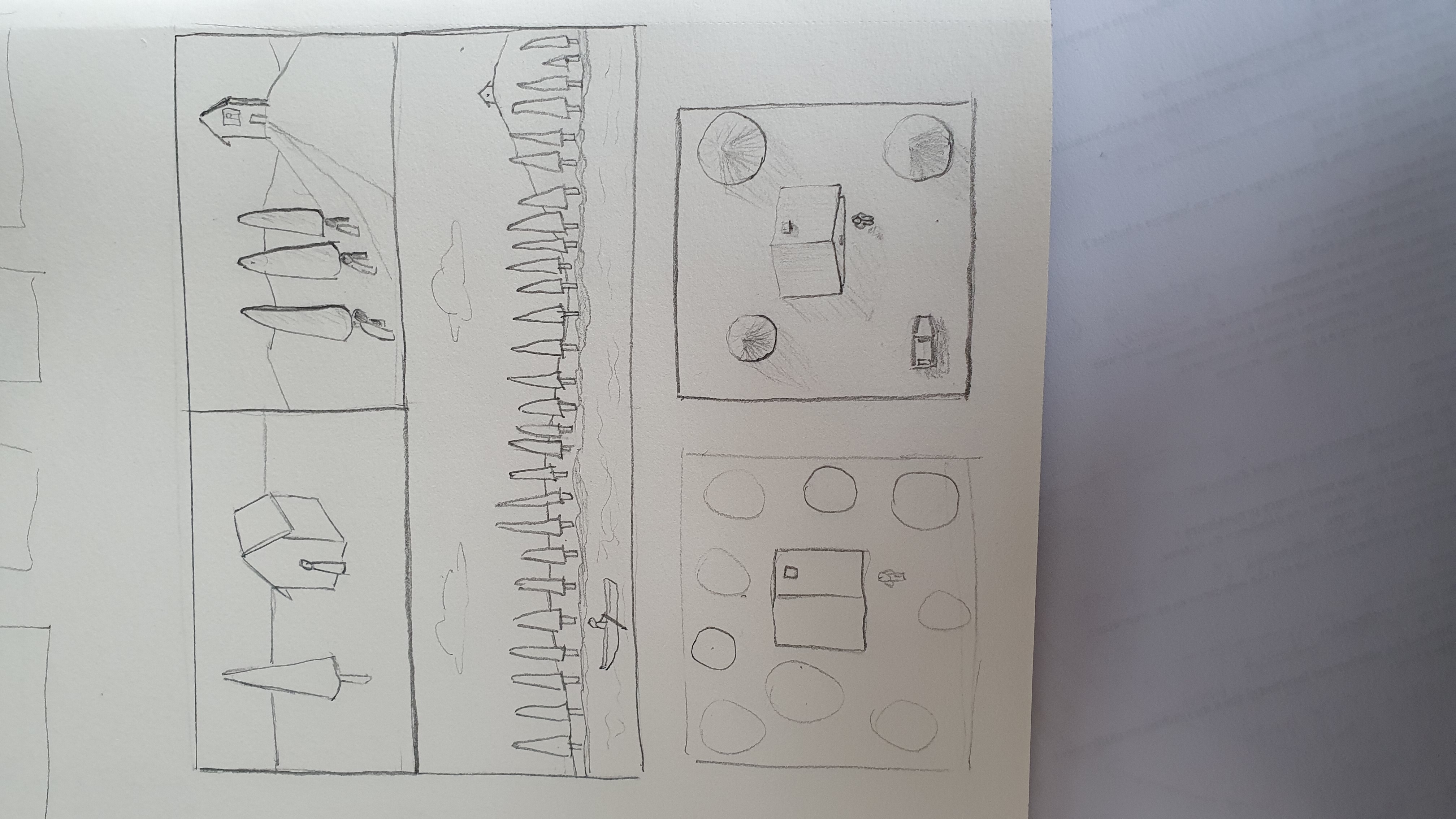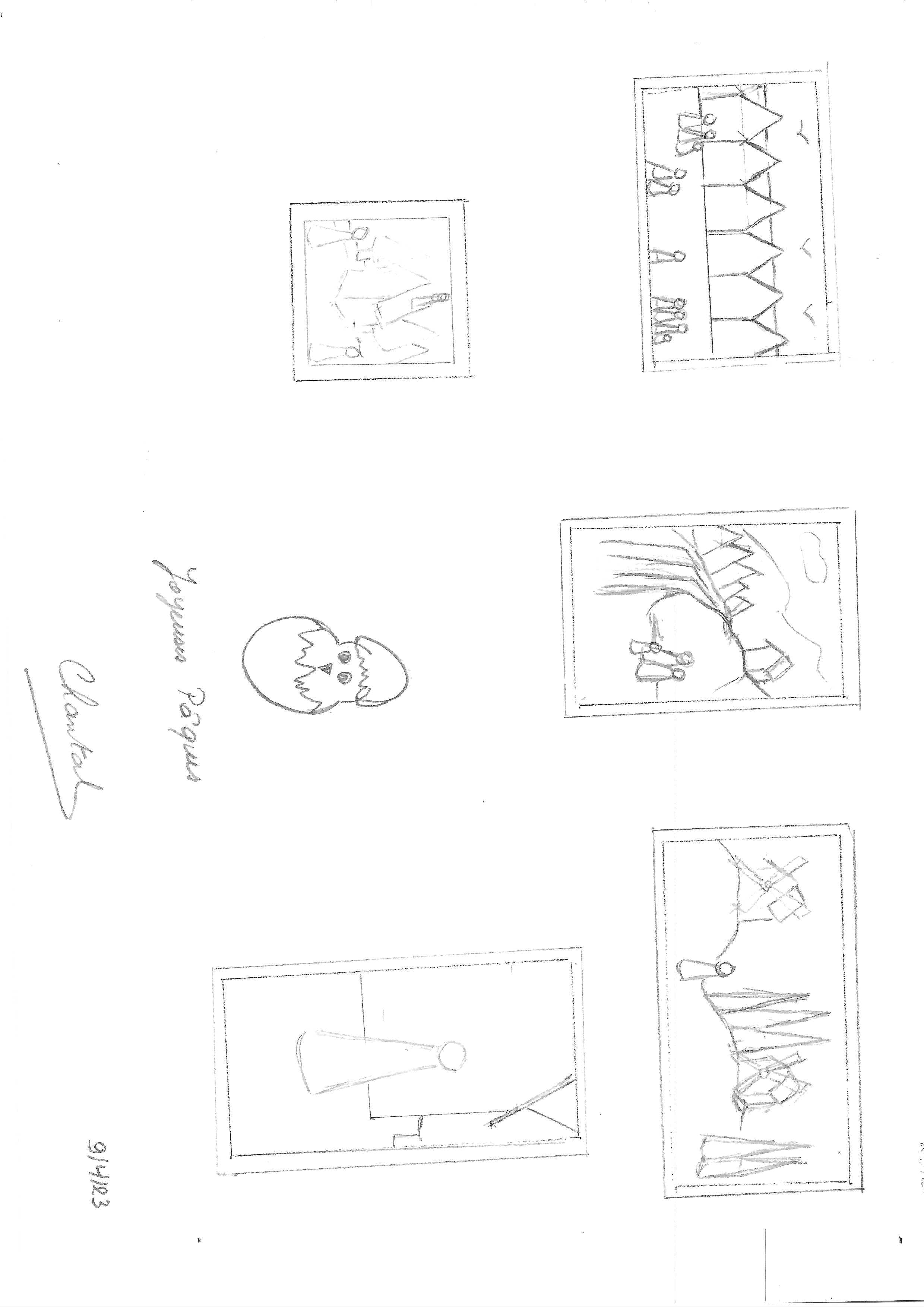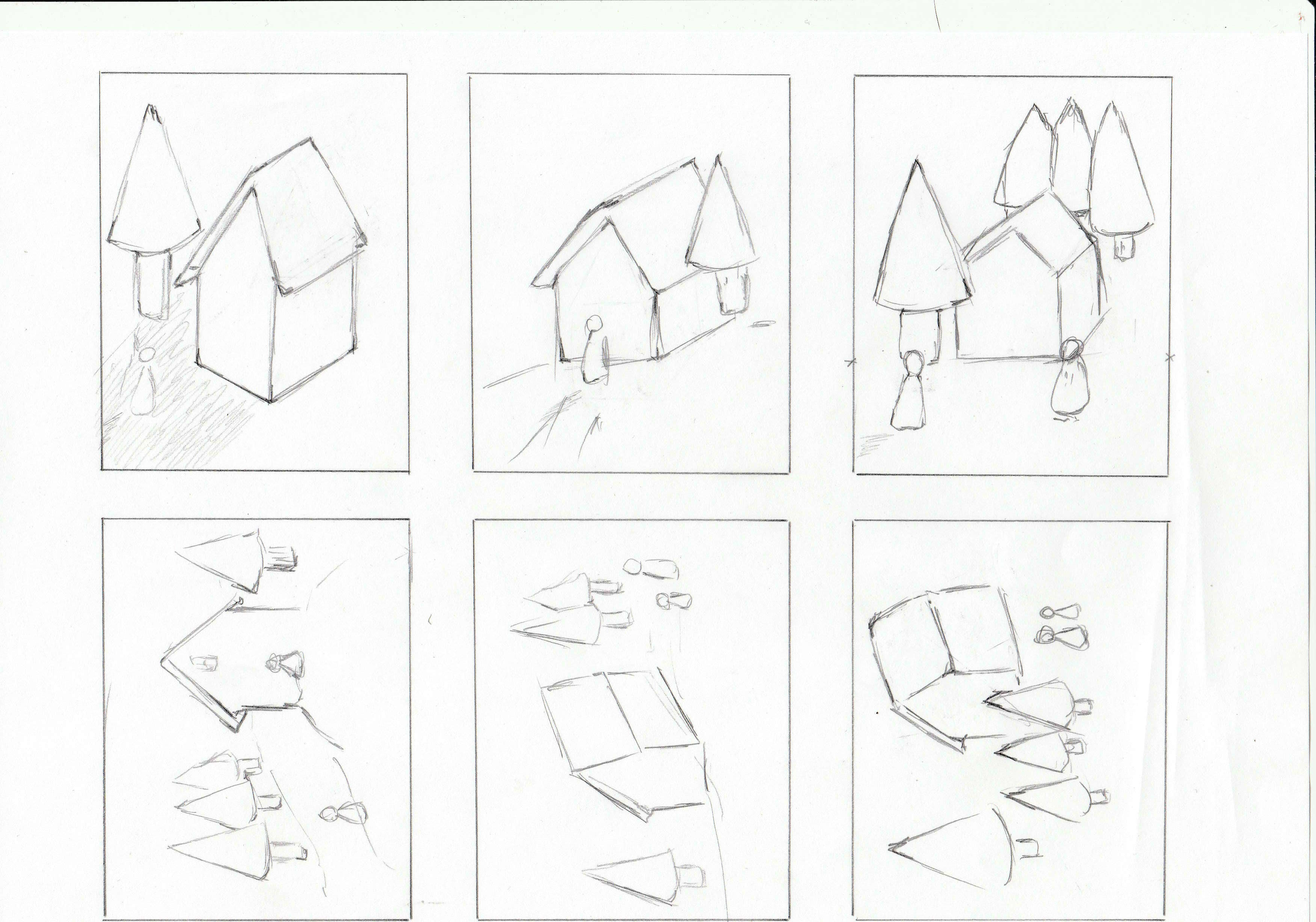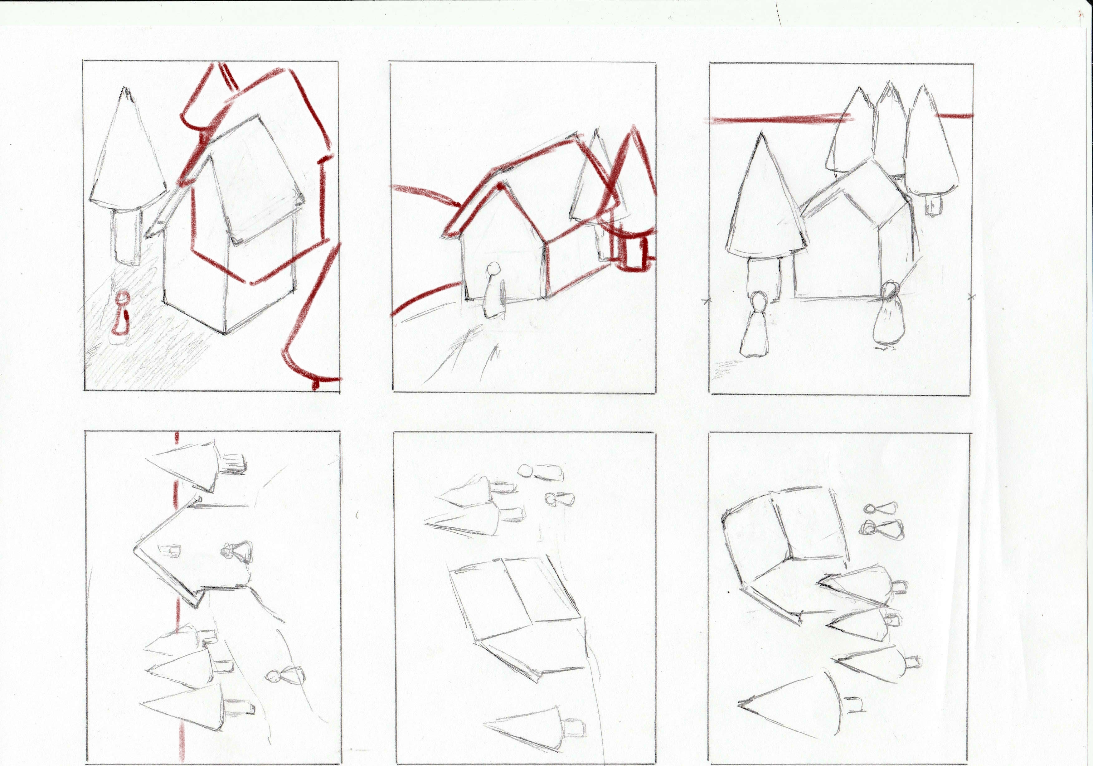 Aquí están mis composiciones. En el segundo, (paisaje A4), estos son personajes escondidos detrás de los árboles que observan la casa ... :-)