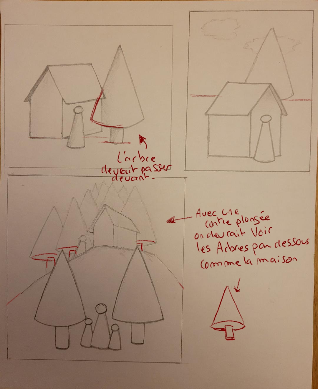 Bonjour Mariouchka, elles sont bien ces compositions. Attention sur la première, vue l'emplacement de la base du tronc l'arbre doit passer devant la maison. Sur la seconde, une petite ligne d'horizon ne serait pas de trop, surtout avec la présence des nuages dans le ciel. Sur la troisième, n'oublie pas d'appliquer le même effet de perspective sur les arbres que sur la maison.