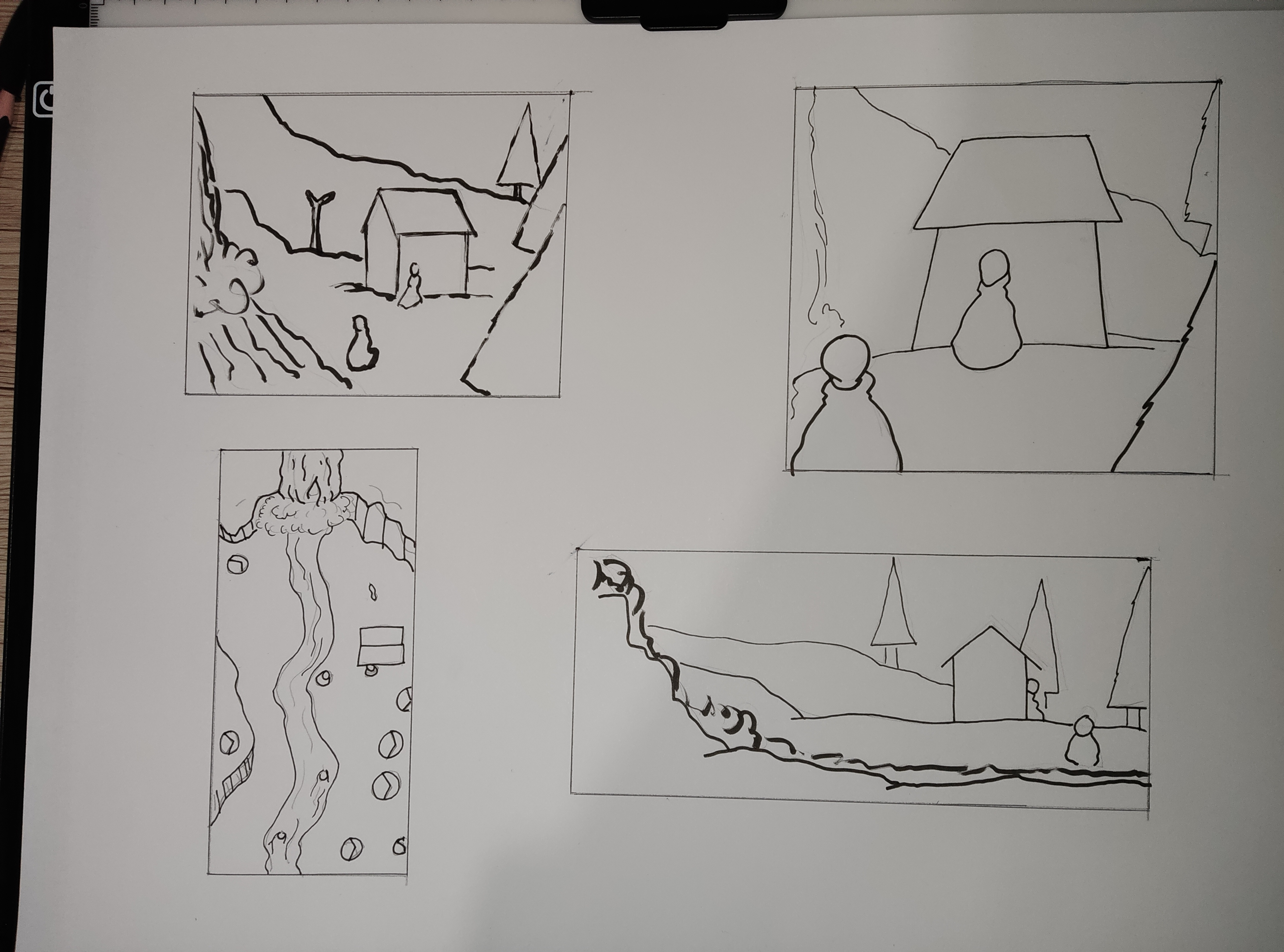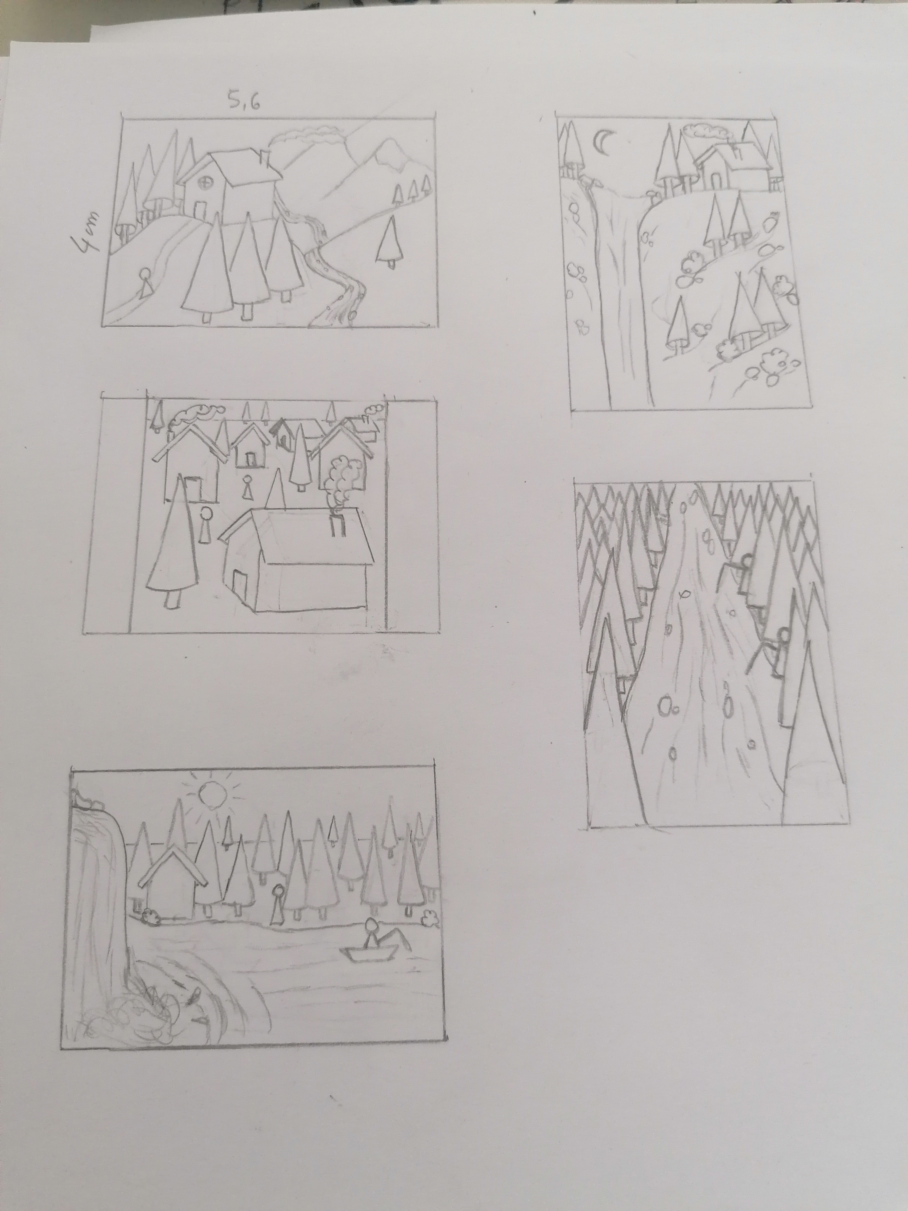 Sympa ces compositions Ulya! Pour celle avec la cascade, je pense que monter la maison plus haut accentuera plus l'effet de la chute d'eau. Je pense qu'on pourrait même rappocher les personnages de la scène plus au premier plan.