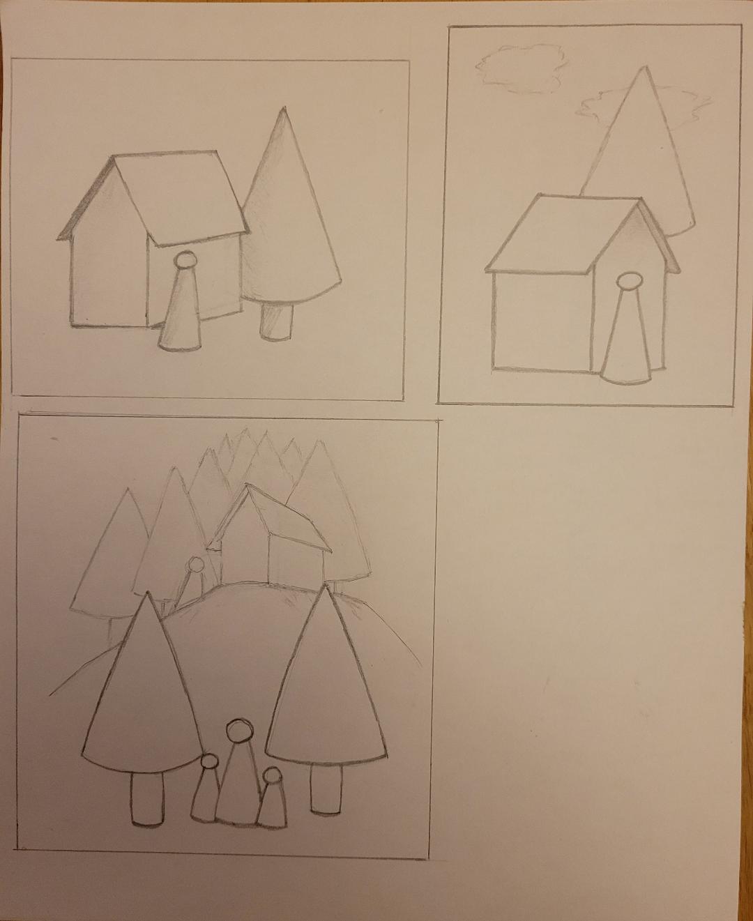 Hola Mariouchka, son de hecho estas composiciones. Tenga cuidado con el primero, dada la ubicación de la base del tronco, el árbol debe pasar frente a la casa. En el segundo, una pequeña línea de horizonte no sería demasiado, especialmente con la presencia de las nubes en el cielo. En el tercero, no olvide aplicar el mismo efecto de perspectiva en los árboles que en la casa.