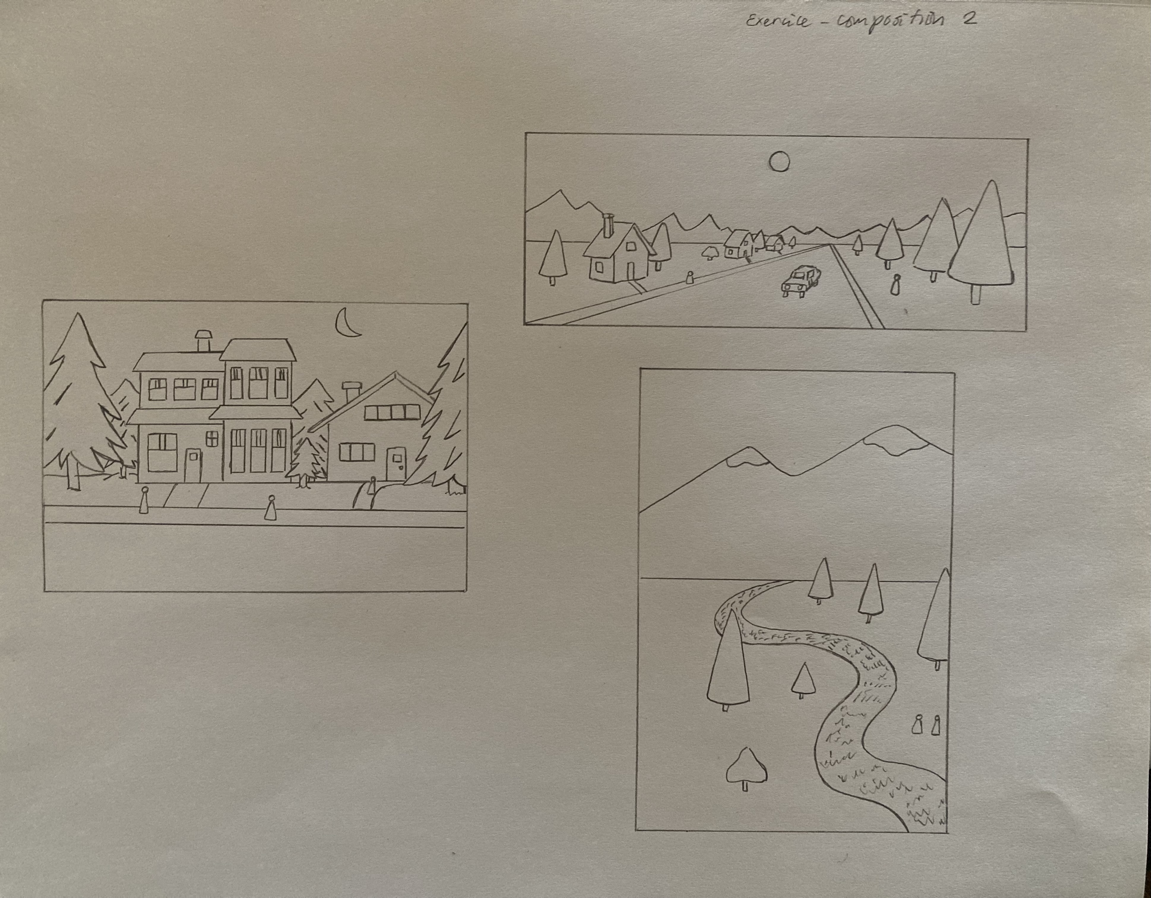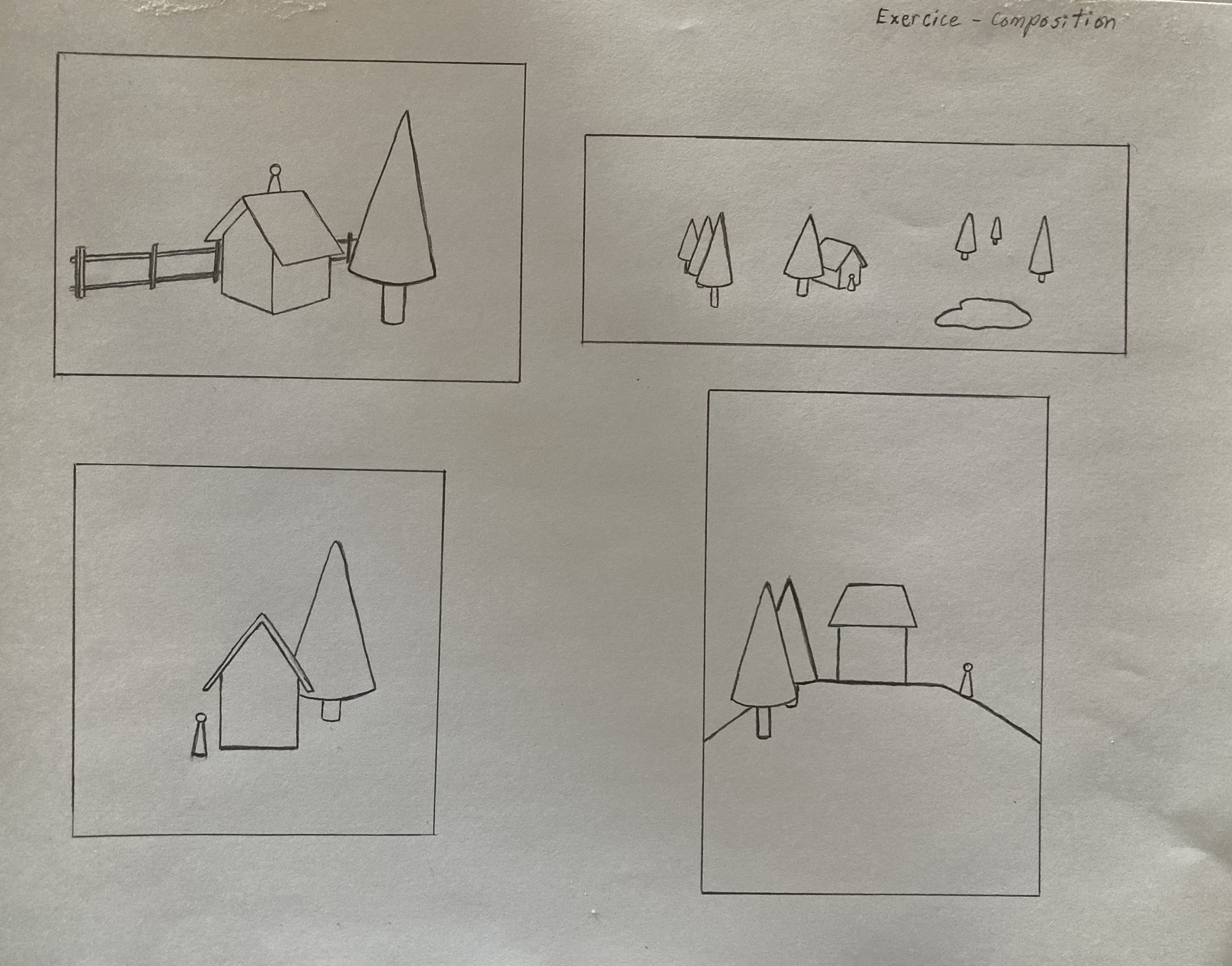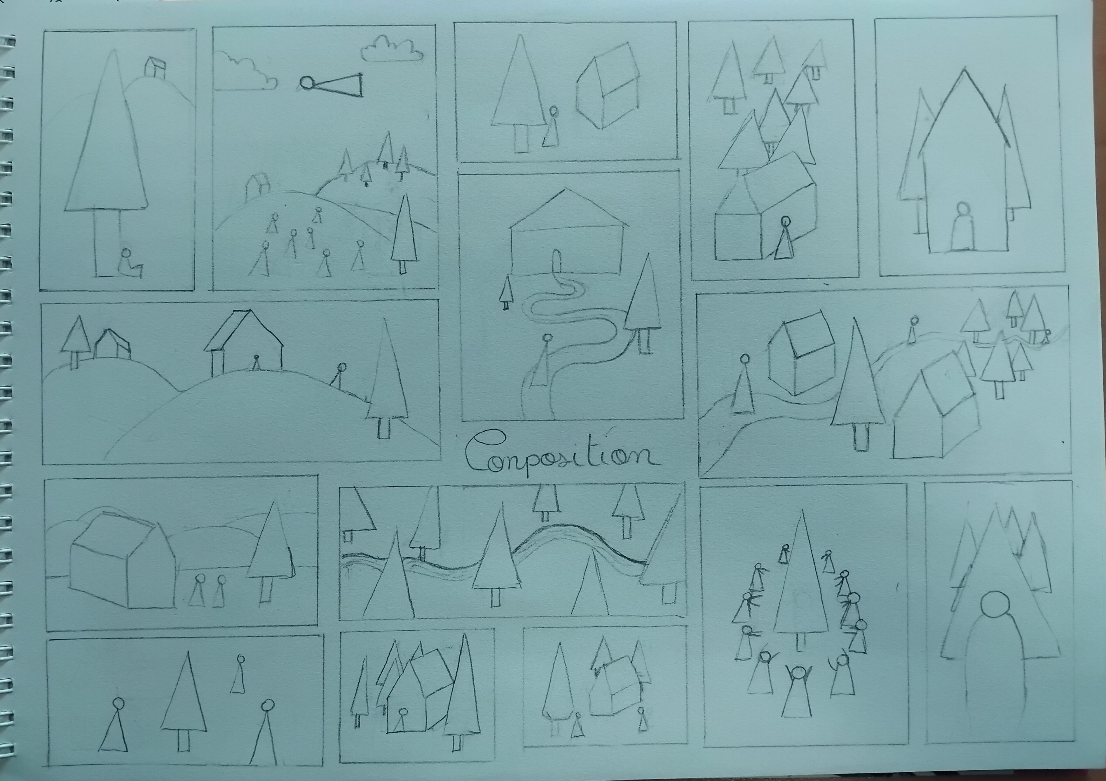 Oui c'est déjà beaucoup mieu 😀 Pour te challenger un peu ce que tu peux faire c'est reprendre une seule idée, par exemple la première avec des personnage au bord d'un lac et une maison et essayer de faire pleins de composition différente, cela va te forcer à expérimenter pleins de chose et à développer ta creativité 😃