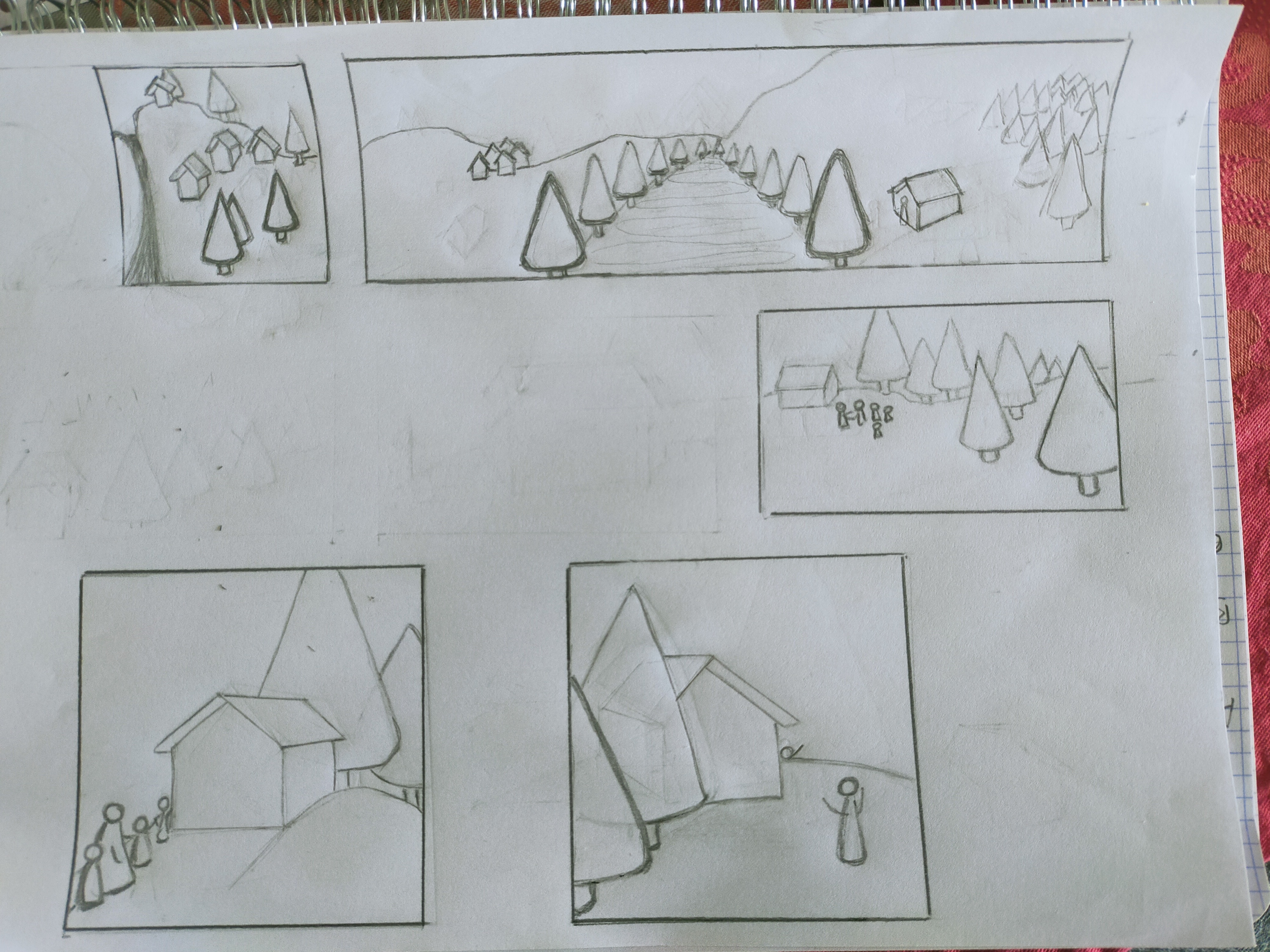pour continuer d'ameliroer tes mise en scène je te conseil de ne pas hésiter à aller jusqu'au bout de tes idées voir à les exagérer légèrement, par exemple tu as une maison sur la Coline, et bien tu peux accentuer la forme de la colline pour que le regarde soit automatiquement guide vers la maison. Pour les scènes plus classique, n'hesite pas à venir utiliser des règles de composition de base, cela permettra d'apporter encore plus de stabilité tout en conservant une scène simple.