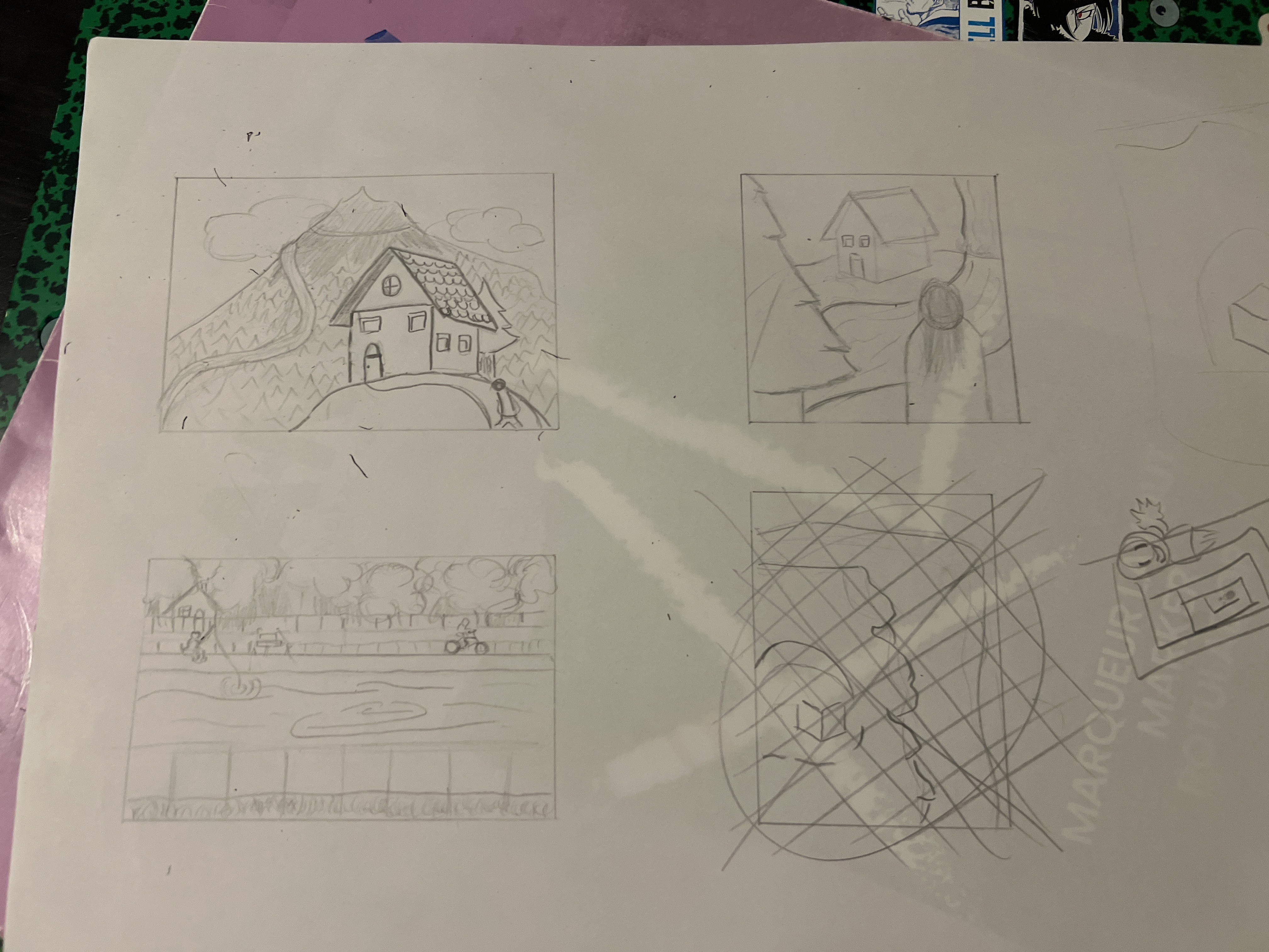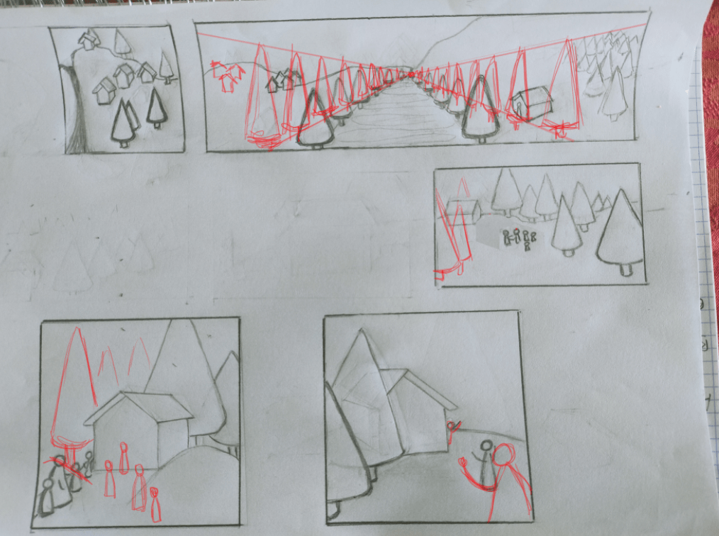 A continuación te comparto algunas propuestas: en primer lugar recuerda que el espectador lee la imagen, y la ubicación de los objetos ayuda a generar ciertas sensaciones. En el caso de las cascadas alejé la montaña hacia una esquina, mientras que el río sale hacia la opuesta; esto ayuda al espectador a reccorer todo el panel con su mirada. En la imagen de la familia frente al río, subí el nivel de este y baje la casa, solo como un aporte de perspectiva que genera equilibrio. Para la imagen de los dos personajes que están separados por la cascada te recomiendo alejarlos más hacia esquinas opuestas, lo que acentuará la tensión de sus miradas. Finalmente para el personaje que observa la casa alta, mi recomendación es usar una composición central con perspectiva, ubicando al hombre en el centro, mientras ve una casa que se encoje por la distancia; desde este punto el espectador genera empatía porque da la impresión de ver lo mismo que el personaje.
