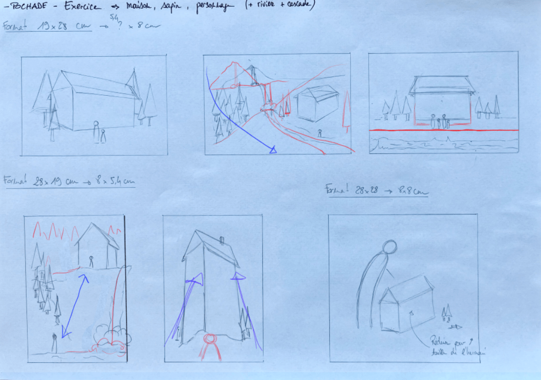 Je te partage les corrections de tes compositions. La suggestion générale est d'utiliser davantage l'espace, car les vides sont également interprétés et nous servent à faire passer certaines idées. Par exemple, pour une personne qui regarde le ciel, nous pouvons la dessiner très bas et laisser un espace immense vers le haut. J'ai donc ajouté quelques éléments ici et là pour équilibrer tes images. J'espère que cela te sera utile !