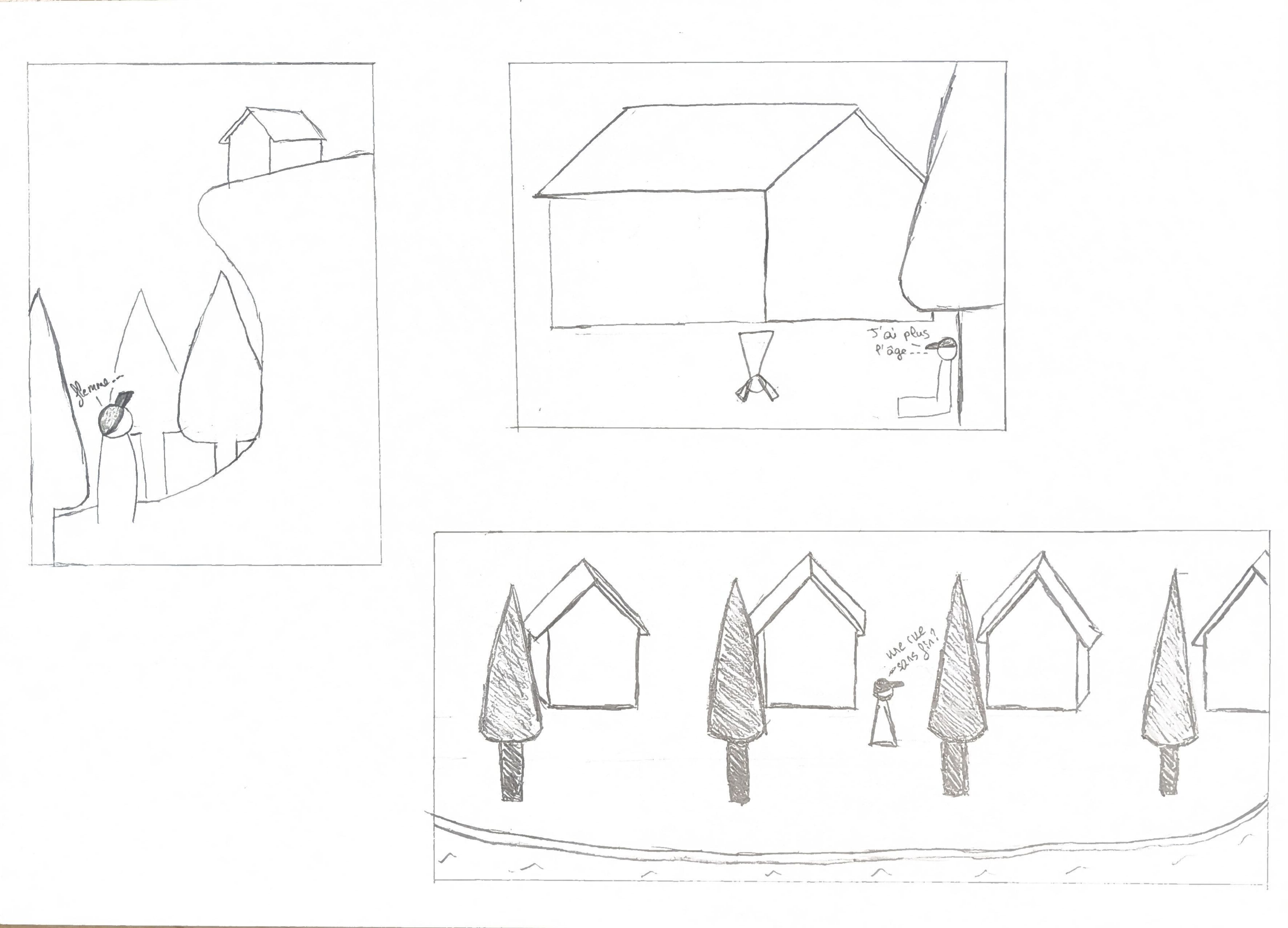 Voilà quelques mises en scène auquelles j'ai pensé. J'espère que c'est assez compréhensible comme brouillon, en tout cas ça l'est pour moi.