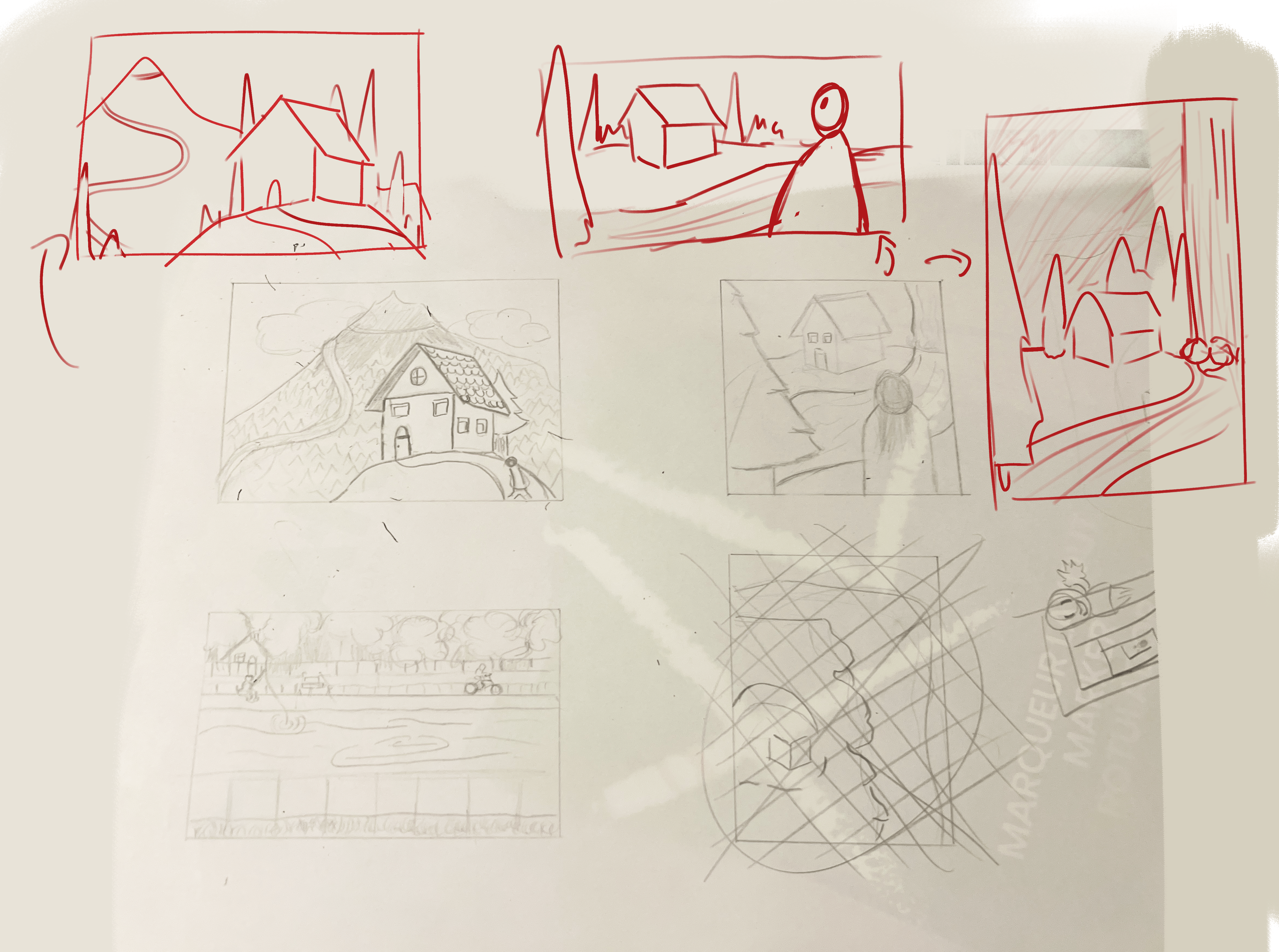 J'aime le fait que tu aies exploré différentes possibilités de composition. J'espère que cet exercice t'a aidé à trouver des façons de tirer profit d'une image. Je te partage ci-dessous quelques propositions. Tout d'abord, n'oublie pas que le spectateur "lit" l'image, et que l'emplacement des objets aide à générer certaines sensations. Dans le cas des chutes d'eau, j'ai éloigné la montagne vers un coin, tandis que la rivière sort vers le coin opposé. Cela aide le spectateur à parcourir tout le panneau du regard. Dans l'image de la famille devant la rivière, j'ai monté le niveau de celle-ci et j'ai baissé la maison, juste pour une question de perspective qui crée de l'équilibre. Pour l'image des deux personnages séparés par la cascade, je te recommande de les éloigner davantage vers des coins opposés, ce qui accentuera la tension de leurs regards. Enfin, pour le personnage qui observe la maison haute, ma recommandation est d'utiliser une composition centrale avec perspective, en plaçant l'homme au centre tandis qu'il regarde une maison qui rétrécit avec la distance. À partir de ce point, le spectateur crée de l'empathie car cela donne l'impression de voir la même chose que le personnage.