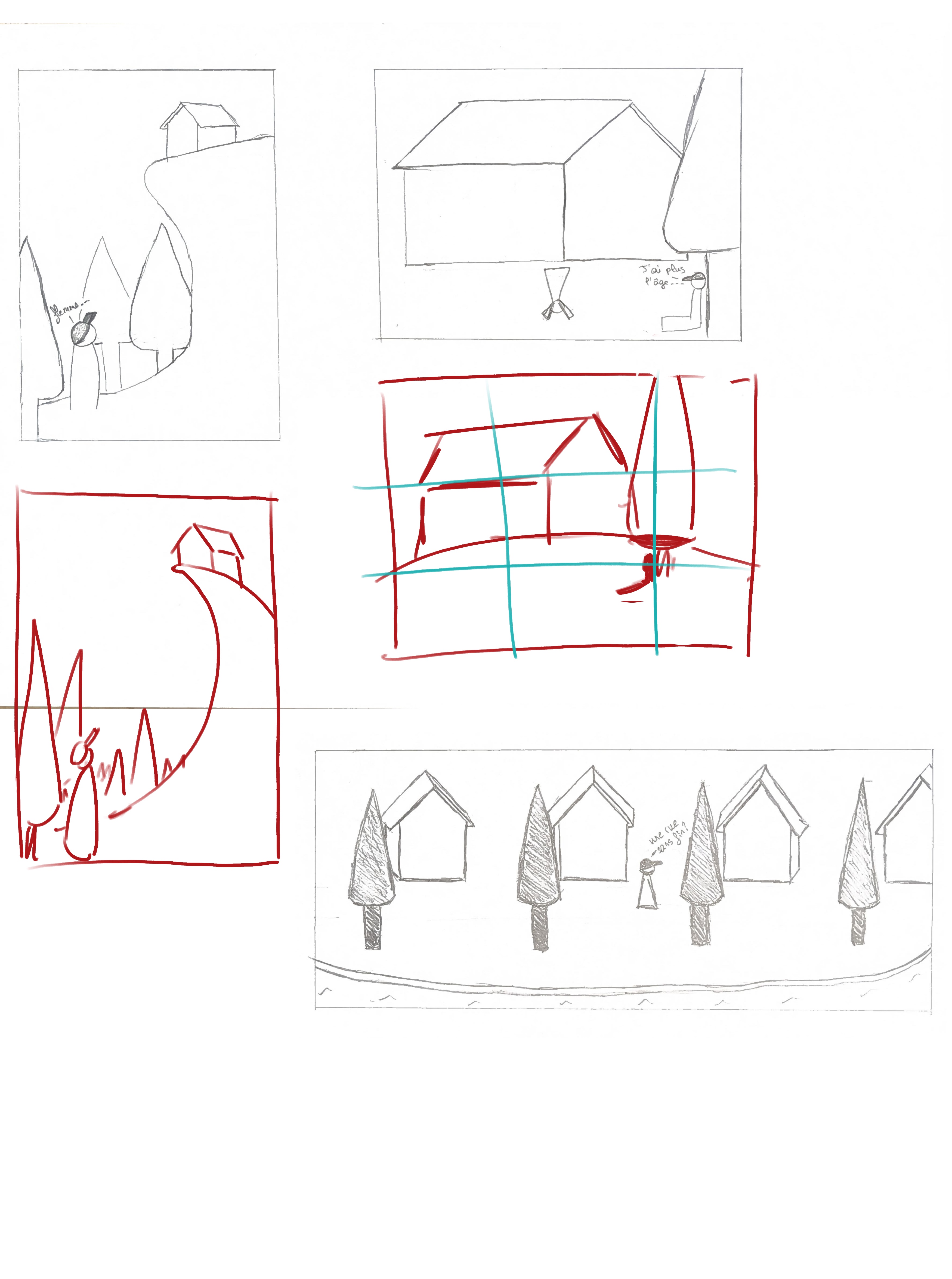 - Hierachise les éléments : tu as tendance à dessiner les éléments avec la même taille ce qui fait qu'on a du mal à comprendre la profondeur mais aussi l'importance des éléments, par demple pour les arbres sur l'illustration en bas à gauche, tu peux en dessiner plusieurs de différentes tailles pour apporter profondeur et rendu plus naturel. Cela fonctionne aussi pour ton illustration en haut à droite, elle ne fait pas très naturel si tu redessine tous les éléments, mais ne jouant avec la règles des tiers (on oublie la maison, elle sert à montrer que c'est le même décors que l'illustration en haut à gauche, mais on peut le deviner sans, elle ne participe donc pas directement à la compo présente et ajoute un élément trop important visuellement et dans l'equilibre de la composition pour pas grand chose) et on vient créer une opposition entre les personnages qui arrivent et la scène du pic ni que sous l'arbre. Tu peux aussi accentuer le premier plan en dessinant une ligne de sol.