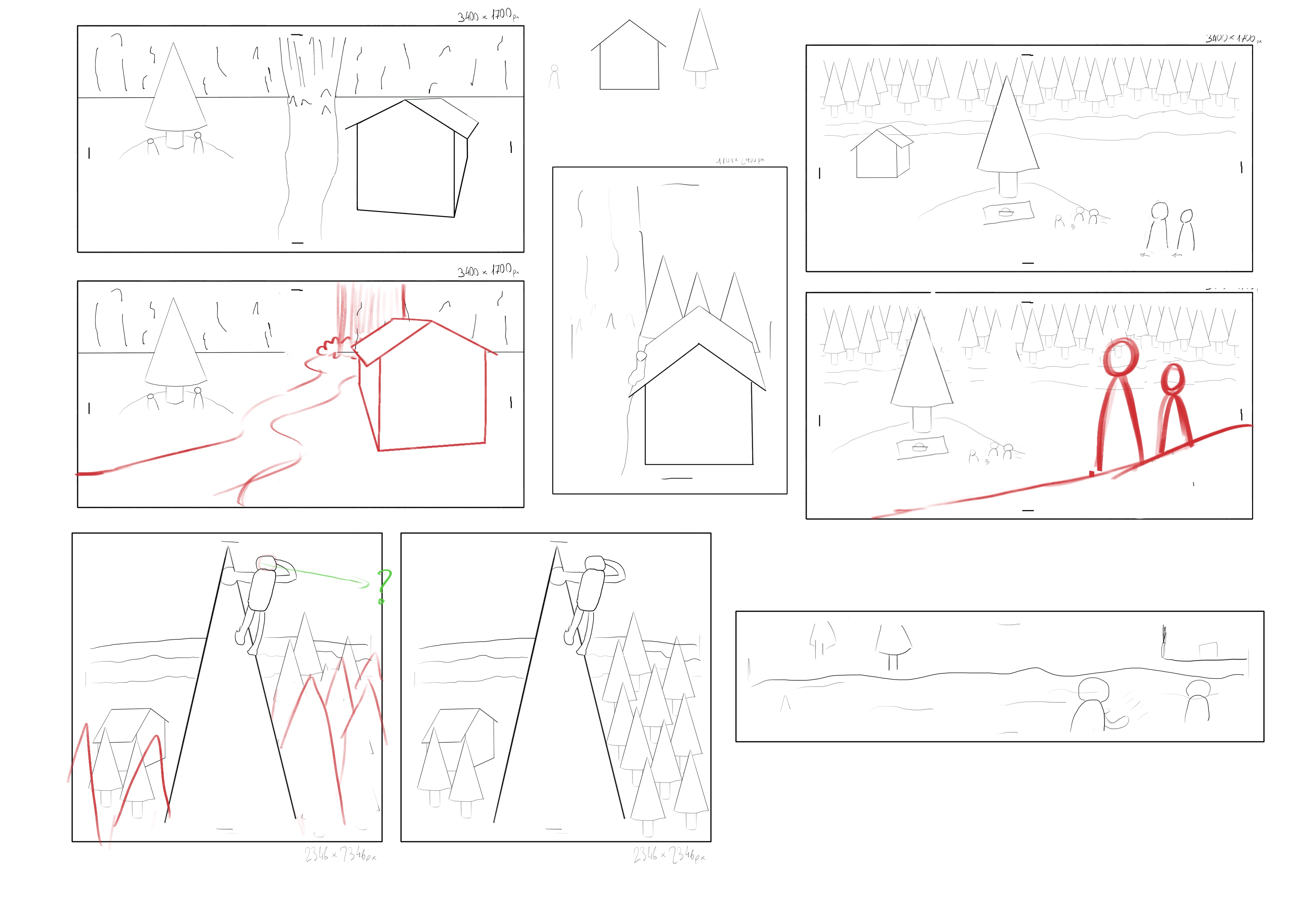 Me gusta que hayas explorado diferentes posibilidades de composición, espero que el ejercicio te haya ayudado a encontrar formas de sacarle provecho a una imagen. A continuación te comparto algunas propuestas: en primer lugar recuerda que el espectador lee la imagen, y la ubicación de los objetos ayuda a generar ciertas sensaciones. En el caso de las cascadas alejé la montaña hacia una esquina, mientras que el río sale hacia la opuesta; esto ayuda al espectador a reccorer todo el panel con su mirada. En la imagen de la familia frente al río, subí el nivel de este y baje la casa, solo como un aporte de perspectiva que genera equilibrio. Para la imagen de los dos personajes que están separados por la cascada te recomiendo alejarlos más hacia esquinas opuestas, lo que acentuará la tensión de sus miradas. Finalmente para el personaje que observa la casa alta, mi recomendación es usar una composición central con perspectiva, ubicando al hombre en el centro, mientras ve una casa que se encoje por la distancia; desde este punto el espectador genera empatía porque da la impresión de ver lo mismo que el personaje. Espero que esto te sea de ayuda para continuar mejorando.