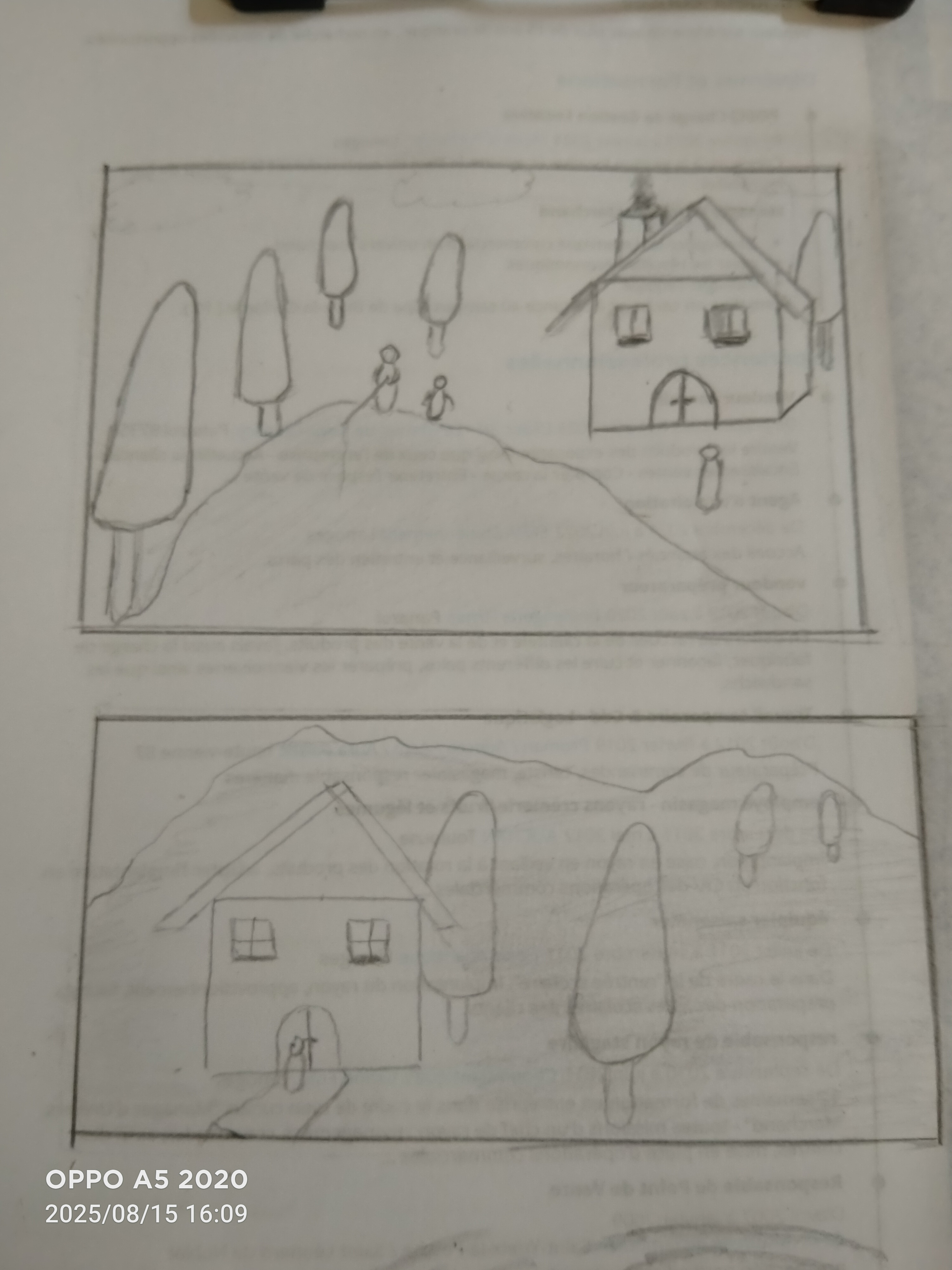Je te partage les corrections de tes compositions. La suggestion générale est d'utiliser davantage l'espace, car les vides sont également interprétés et nous servent à faire passer certaines idées. Par exemple, pour une personne qui regarde le ciel, nous pouvons la dessiner très bas et laisser un espace immense vers le haut.