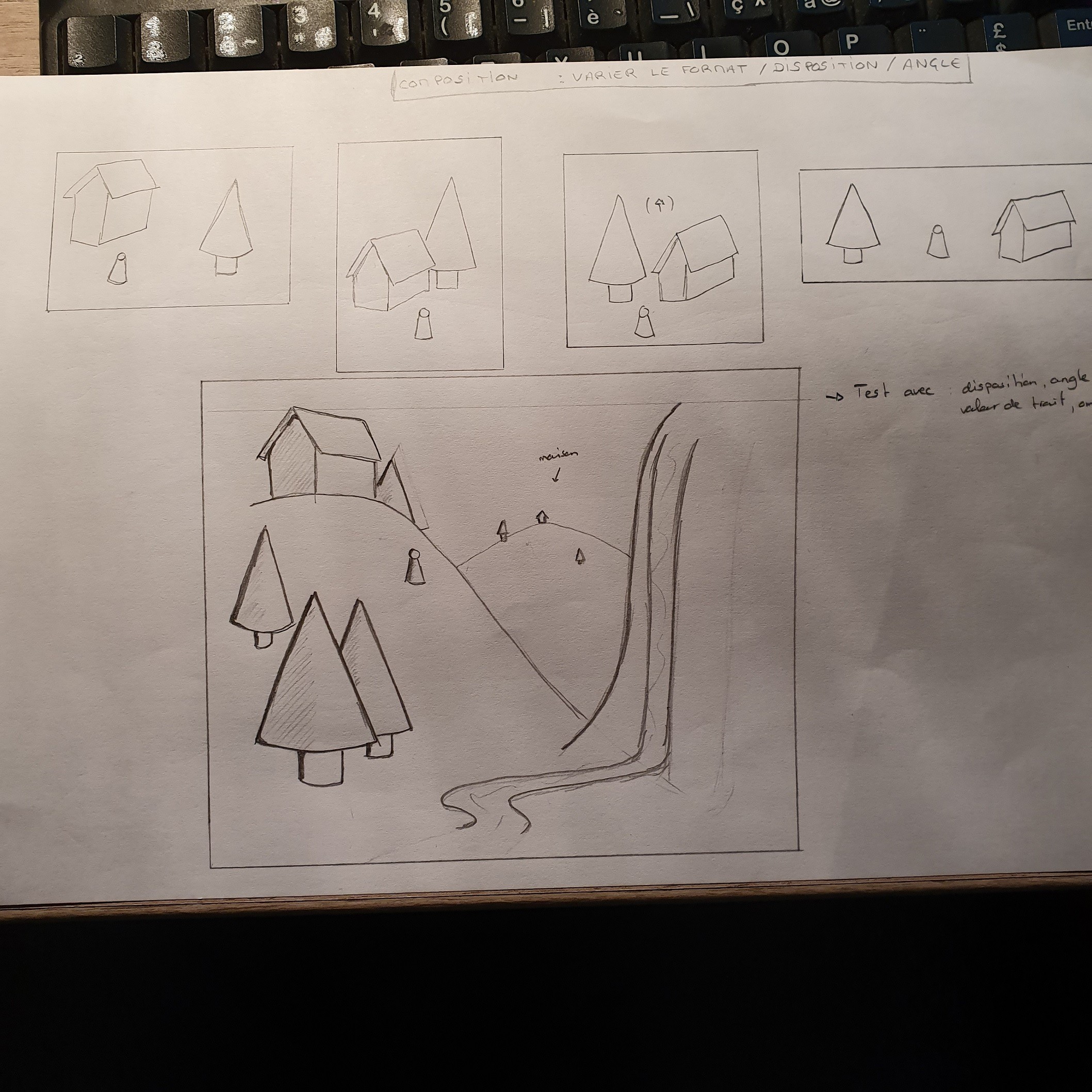 Je te propose de faire une autre compo non centrée (aucun élément important au centre de ton image), et je te propose de mettre un élément de ton choix au premier plan (un arbre, un rocher, une autre maison, un personnage). Vraiment très très devant ^^