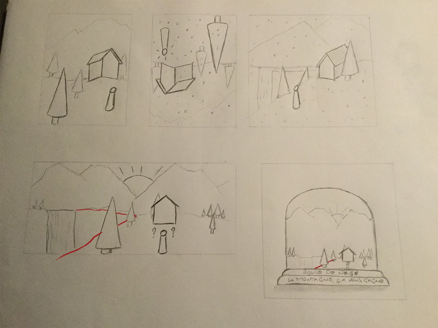 Bonjour et merci. En fait les deux premières vignettes, on voit la maison sur la gauche et légèrement en dessous, et la cascade est en dehors du champ de vision. La vignette en haut à droite, on aperçoit la maison par la droite, comme si j’avais tourné la boule. Ce qui fait qu’on voit la cascade en « troisième plan » derriere la maison, puis les 2 sapins.