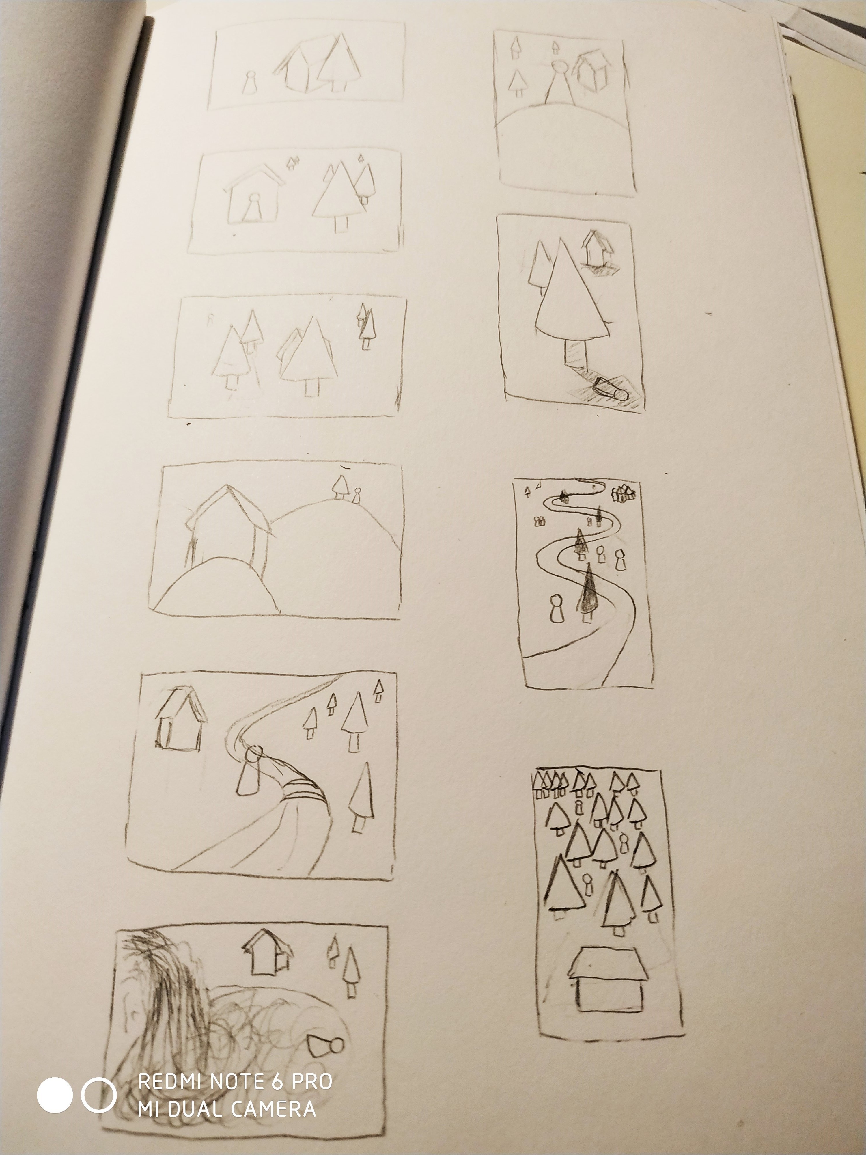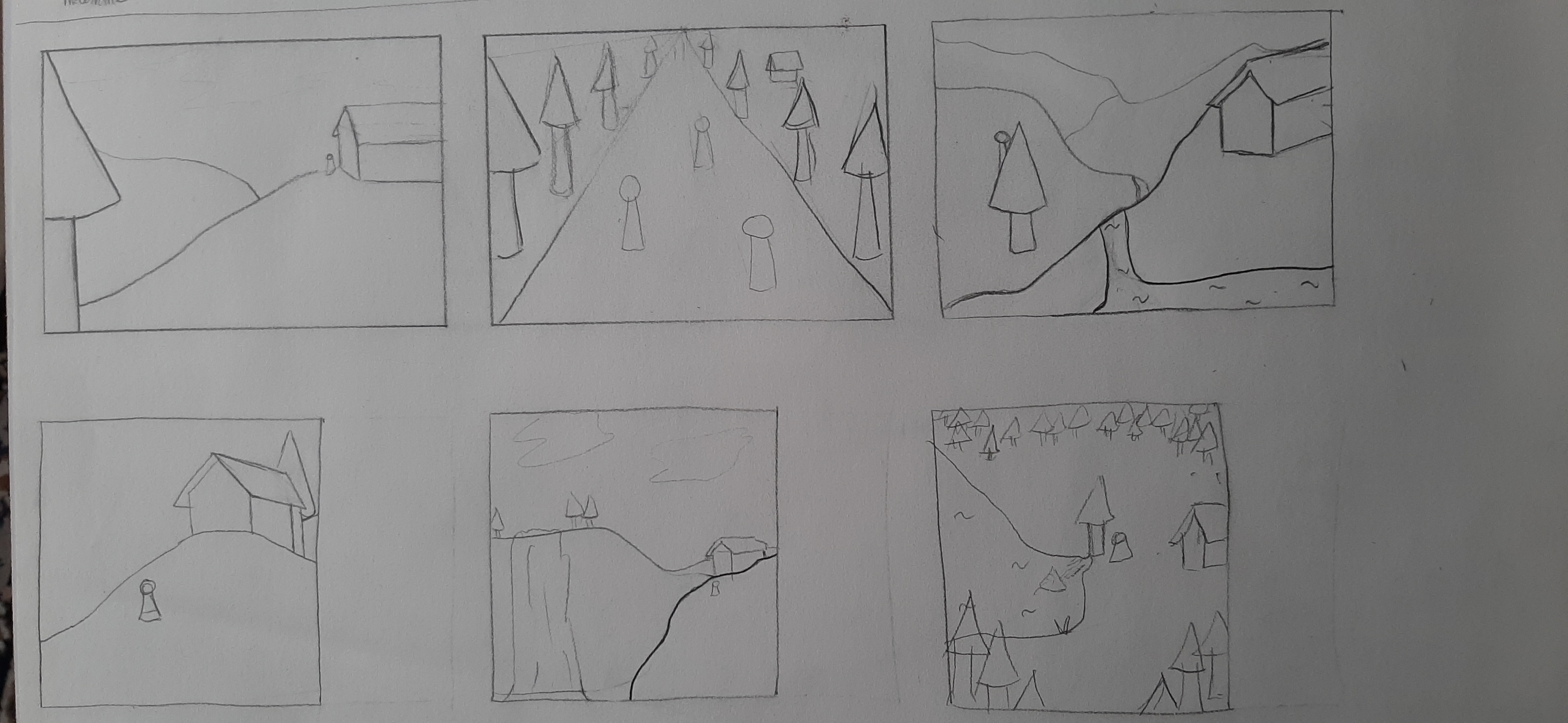 Si je devais pinailler : tu n'as fait que des cadrages centrés (l'élément important de ton image se trouve au centre). Dans ta première image, le chemin et la forêt au bout, dans celle de droite la maison, et pareil pour la troisième. Je ne sais pas si le chemin était l'élément important de ta première image, mais tout nous amène à y prêter attention : il est en plein centre, il mène à une colline bien en évidence, la perspective des bâtiments fuit vers la colline et les montagnes nous ramènent vers le bas. Tous tes personnages donnent aussi l'impression de regarder dans cette direction. Si tu reprends cette pochade simplement en modifiant ton chemin, ton image va complètement changer ^^