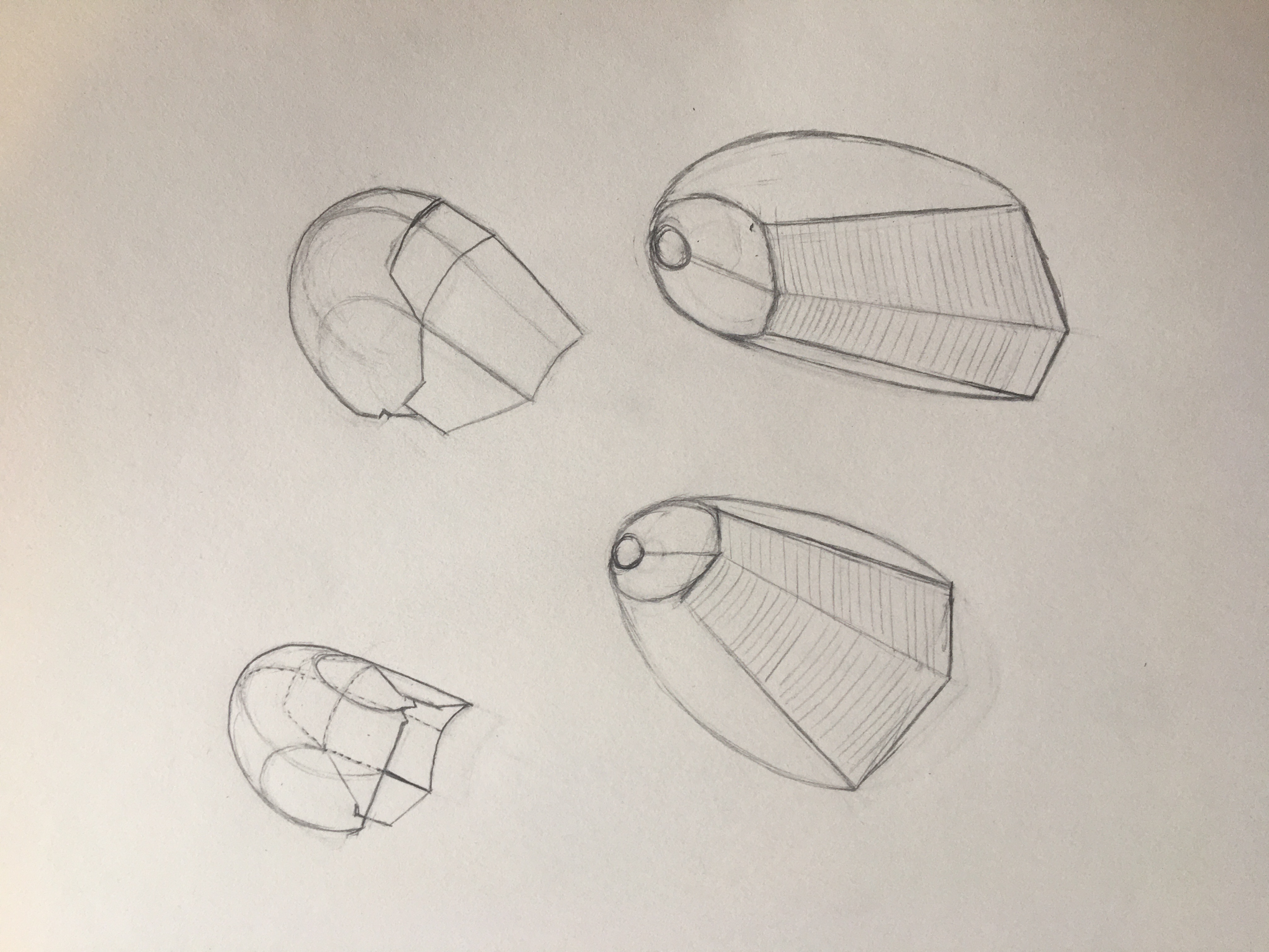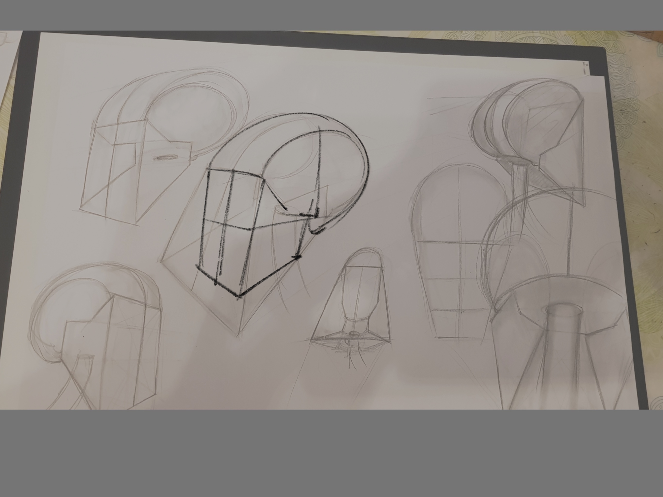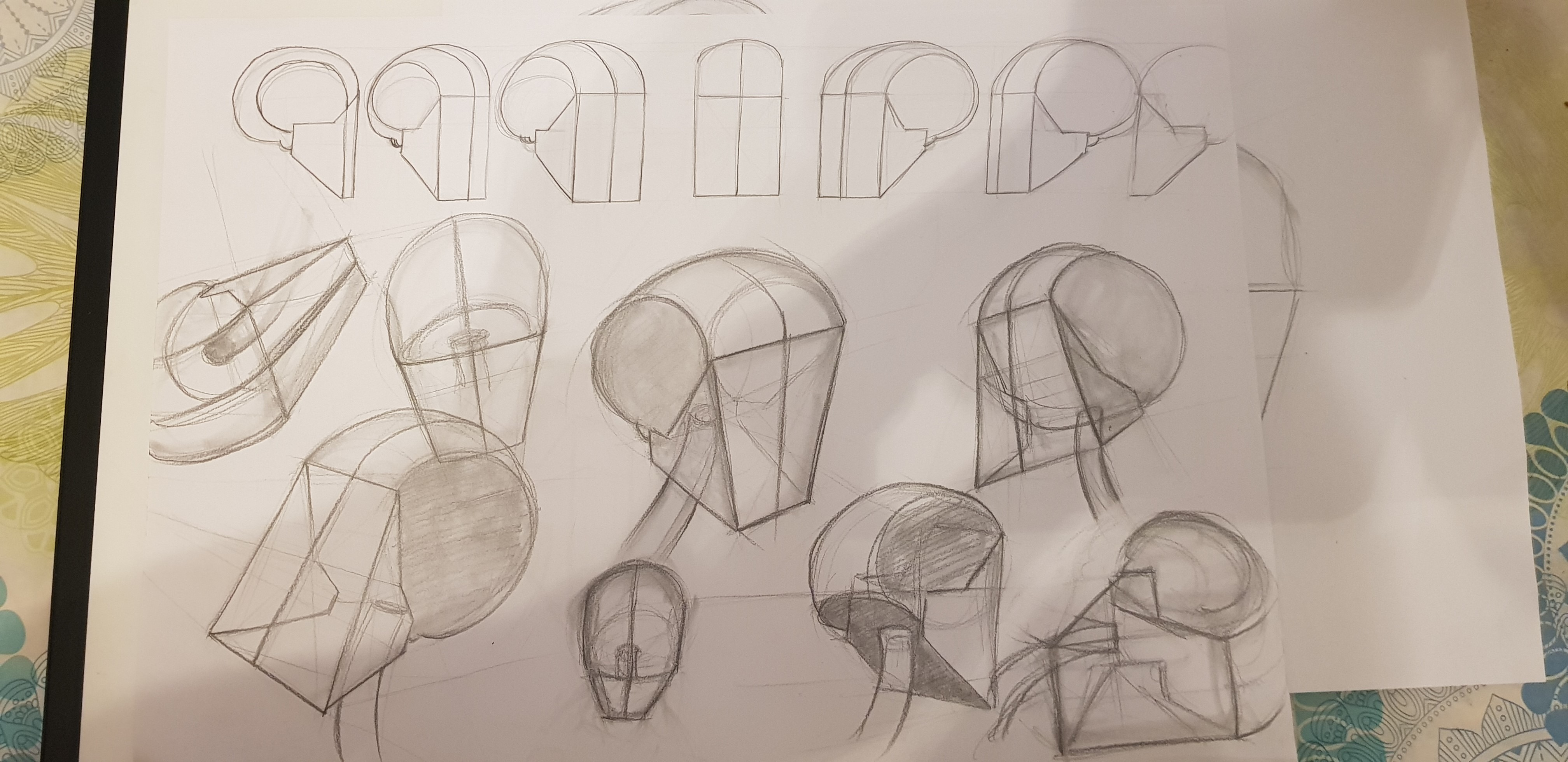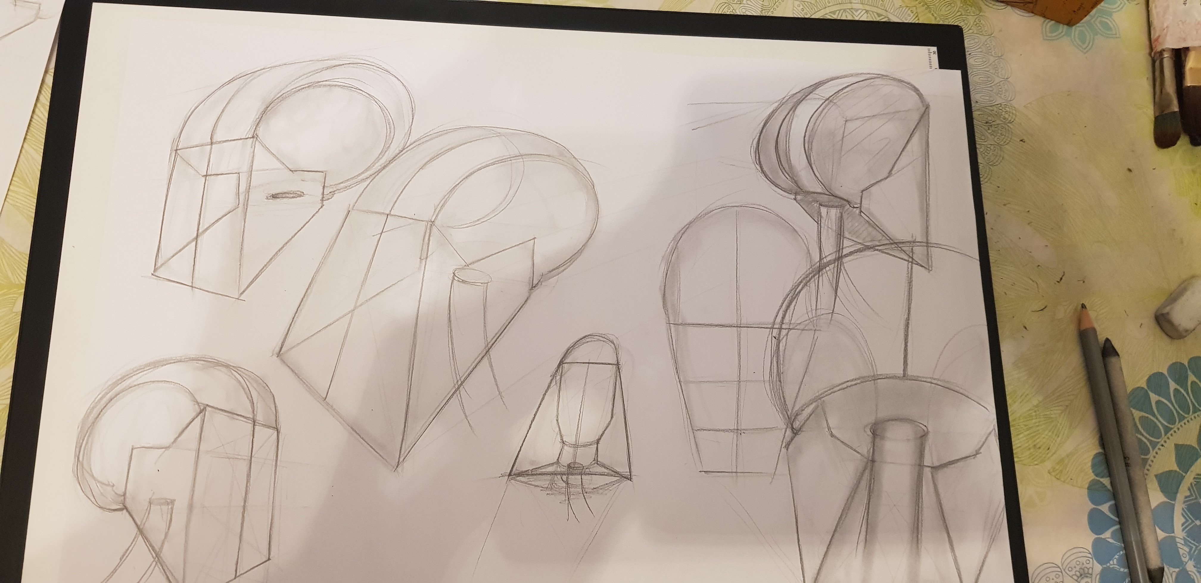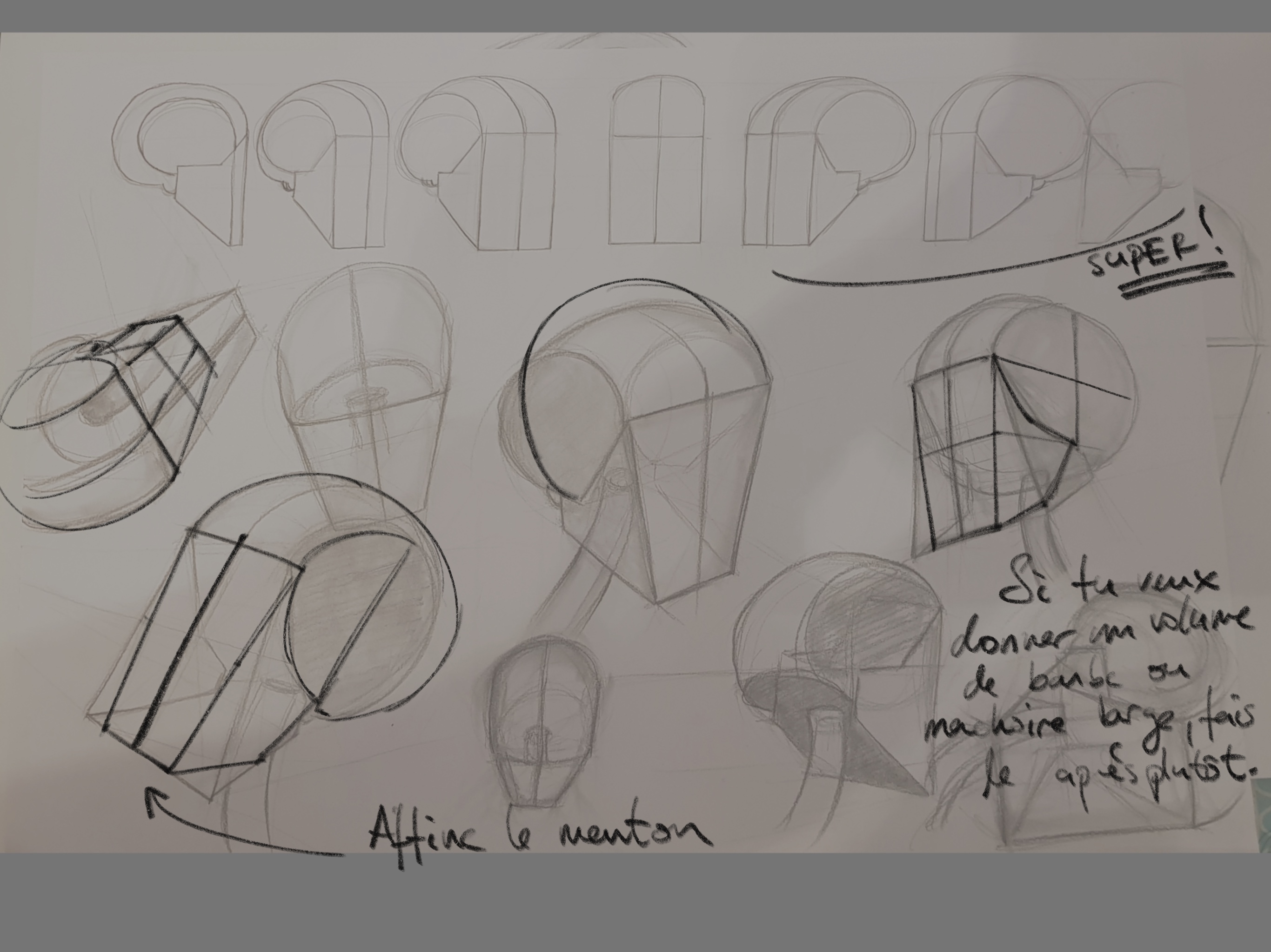 Tu as super bien cerné les volumes simples du corps. Le reste du chemin à faire concerne les proportions, notament la largeur et la profondeur du menton, affine le. Du reste ça fonctionne très bien. Je te propose quelques corrections sur tes dessins :