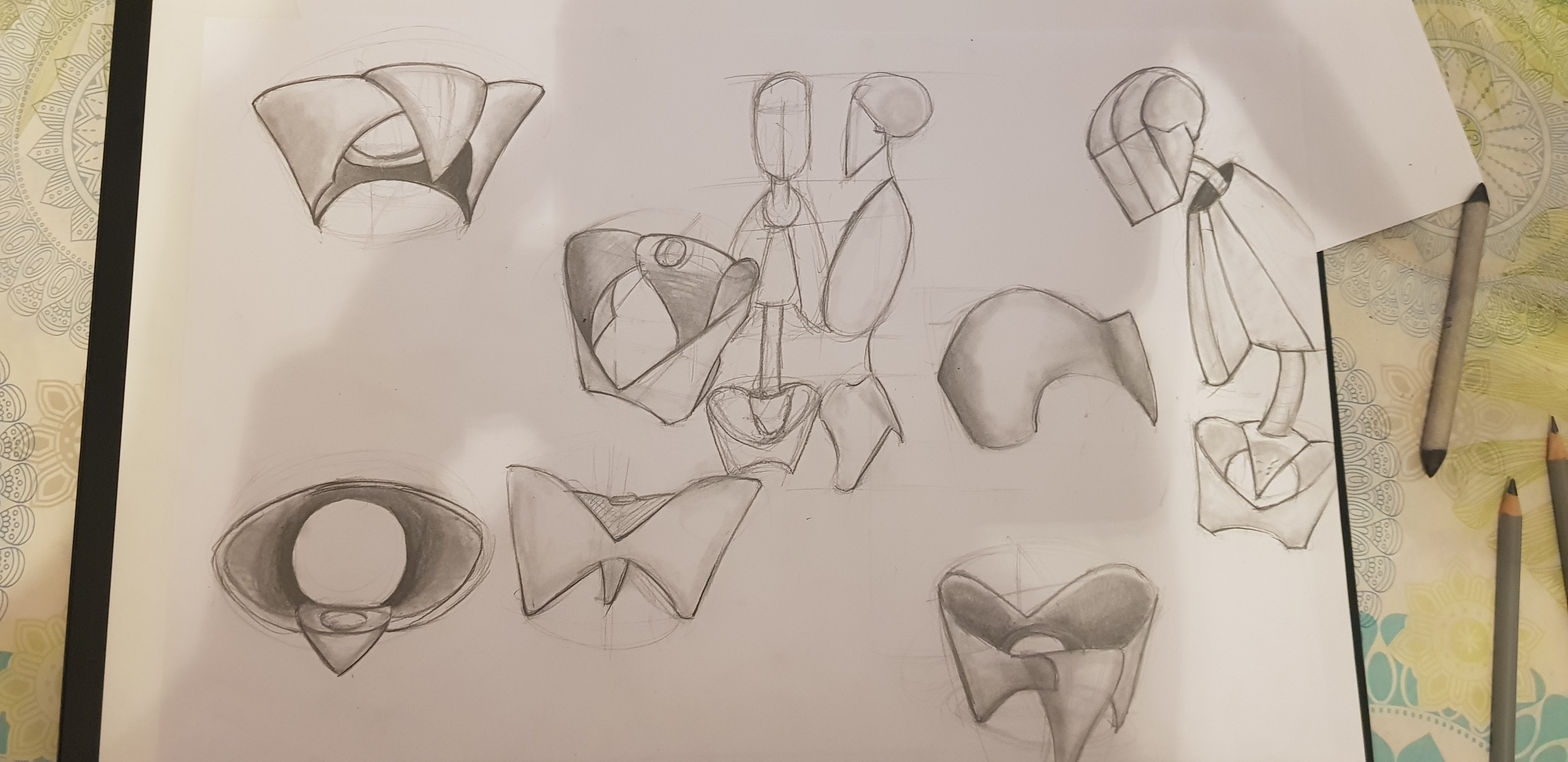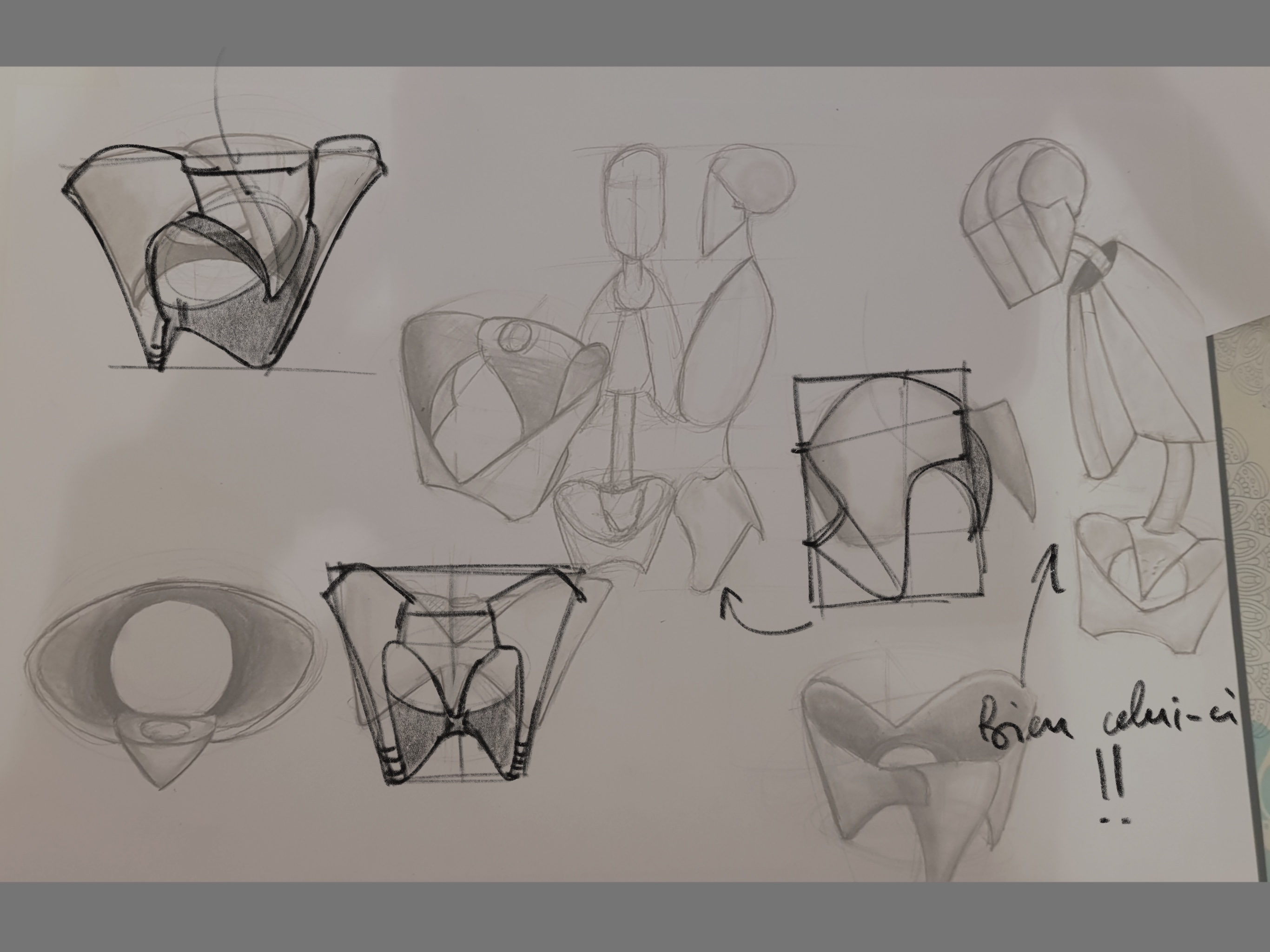 Voici différents essais concernant la tête, la cage thoracique ainsi que le bassin et deux vues d'ensemble on va dire.