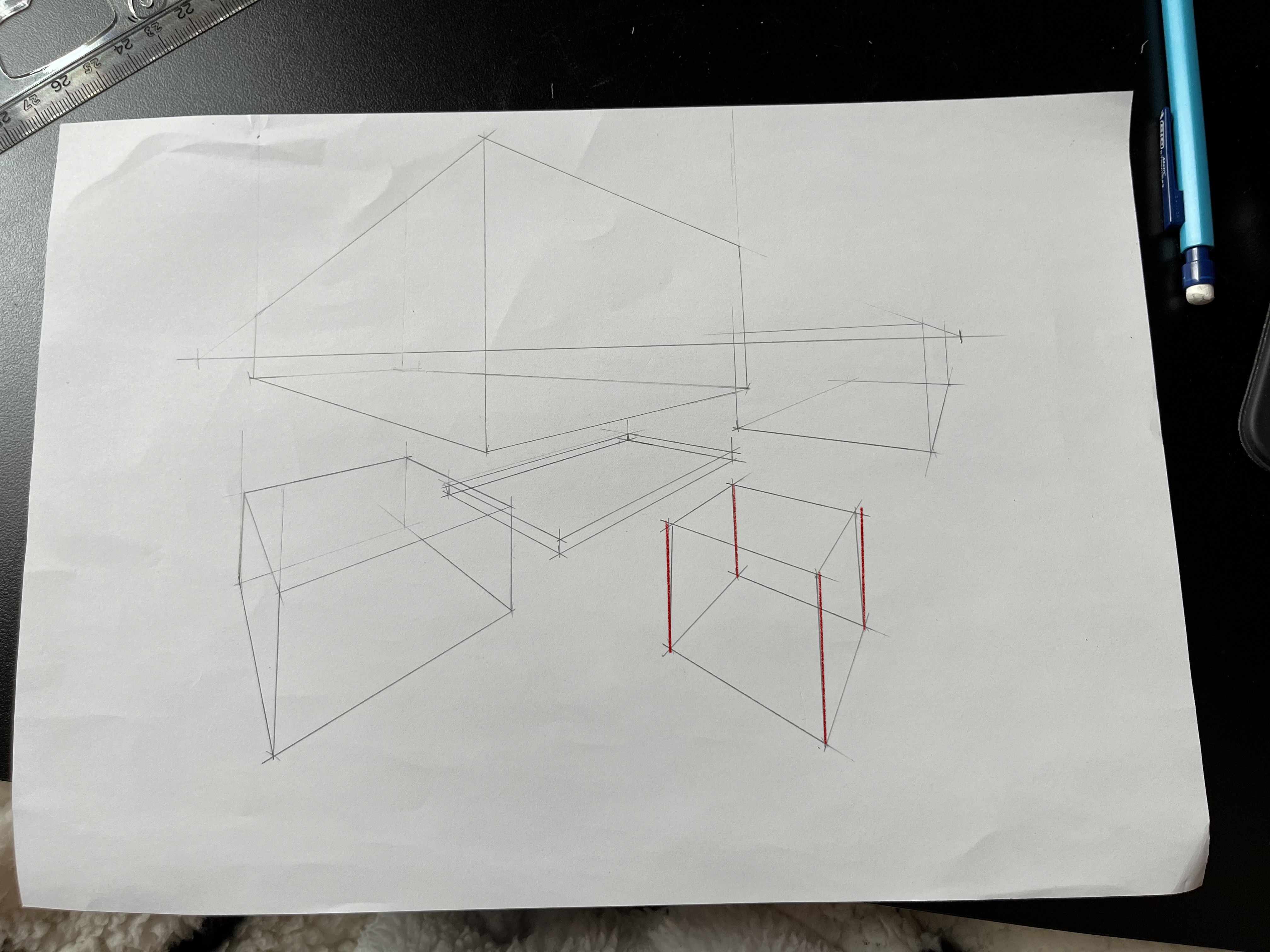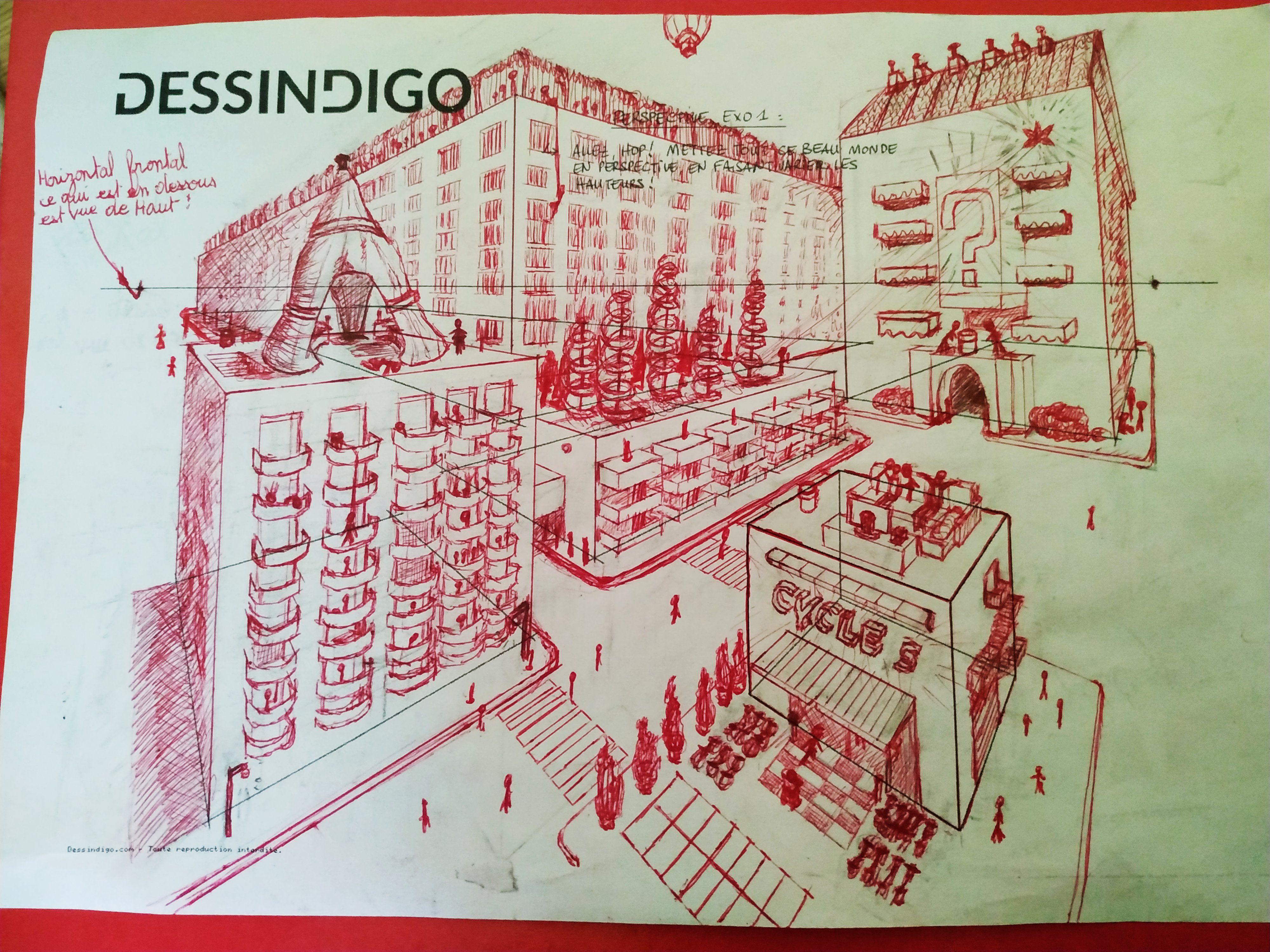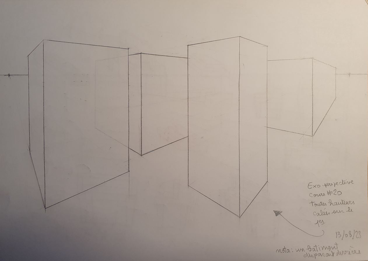 Bonsoir Dsalaun, et bienvenue si c'est ton premier exercice posté! Ça va, ce n'est pas aussi sale que ce que tu t'imagines, et c'est parfaitement lisible! C'est du bon travail, fait juste attention à tes verticales, sur la forme du premier plan principalement. Sinon, toutes tes lignes de fuites sont nickel!