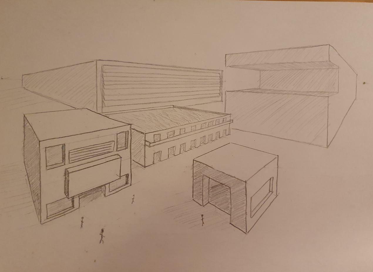 Après avoir vu le corrigé, j'ai fait une 3ème version avec des hauteurs différentes, un habillage de certaines façades et une tentative de 3 niveaux de valeur de trait...