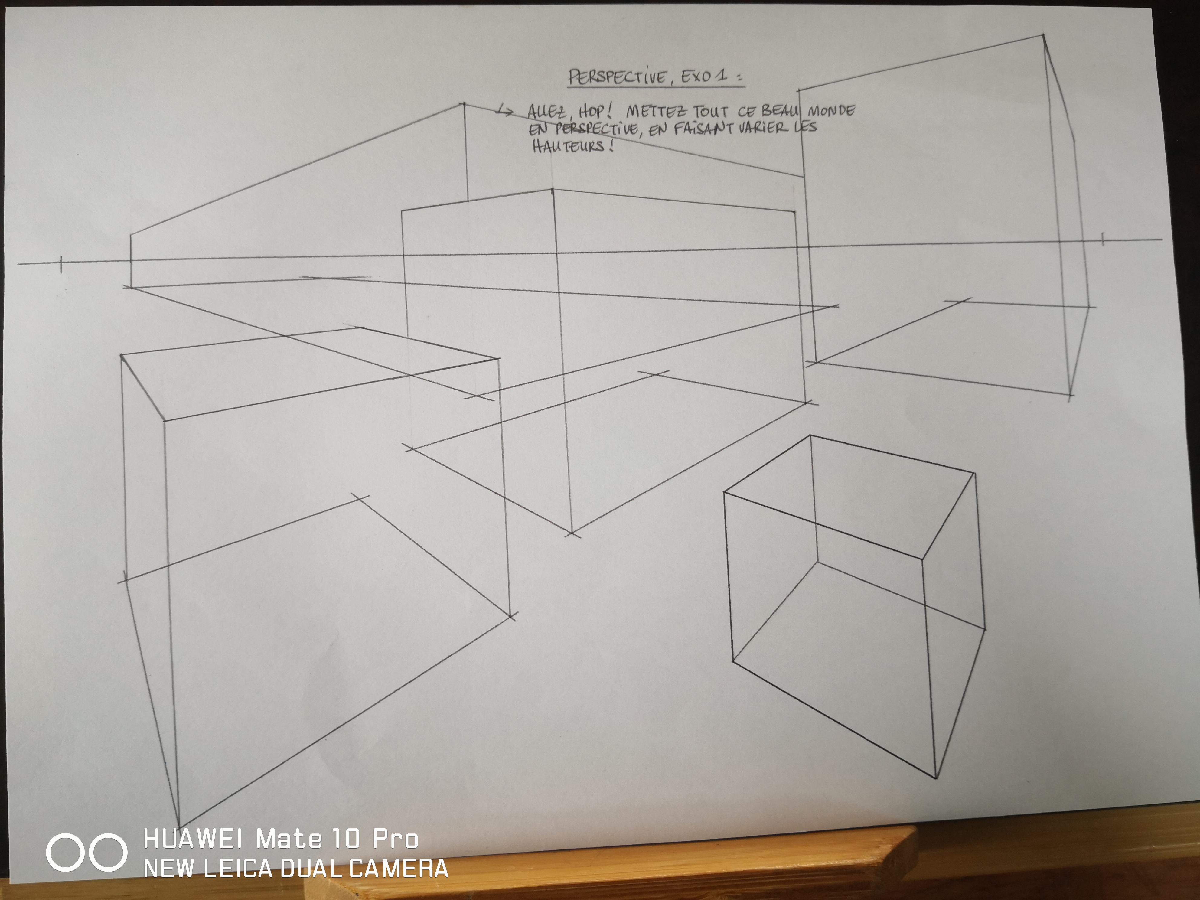 Salut Domi37, c'est très bien. La perspective est bien respectée. Par contre, je ne sais pas si c'est voulu, mais tout tes cubes ne reposent pas sur la même base, ce qui donne un effet de lévitation (ce qui peut être bien sympa). Mais il faudra que tu fasses attention à ce point si tu fais des futurs execices de perspectives pour dessiner des décors et notamment des villes, que tes formes reposent sur la même base. :)
