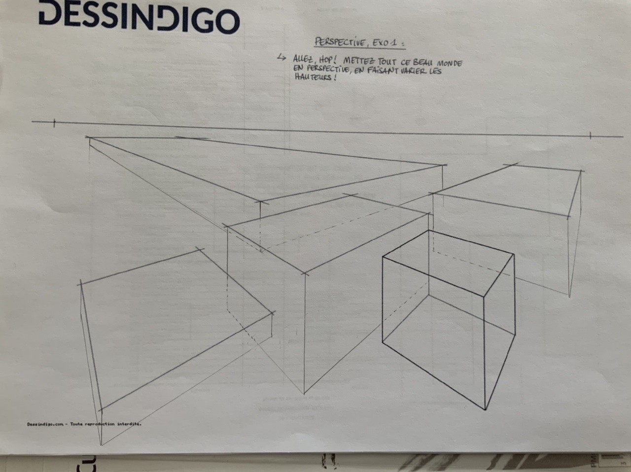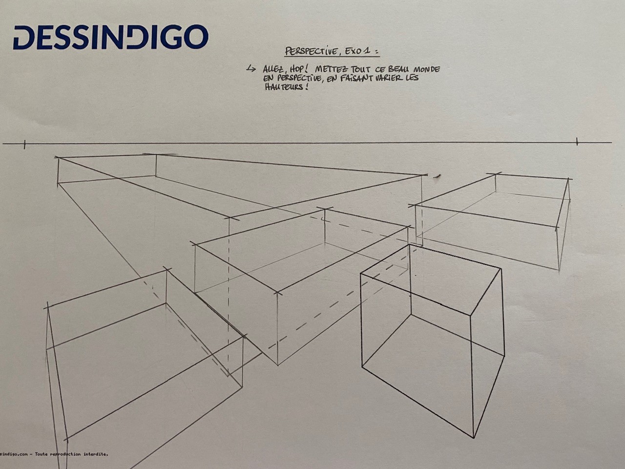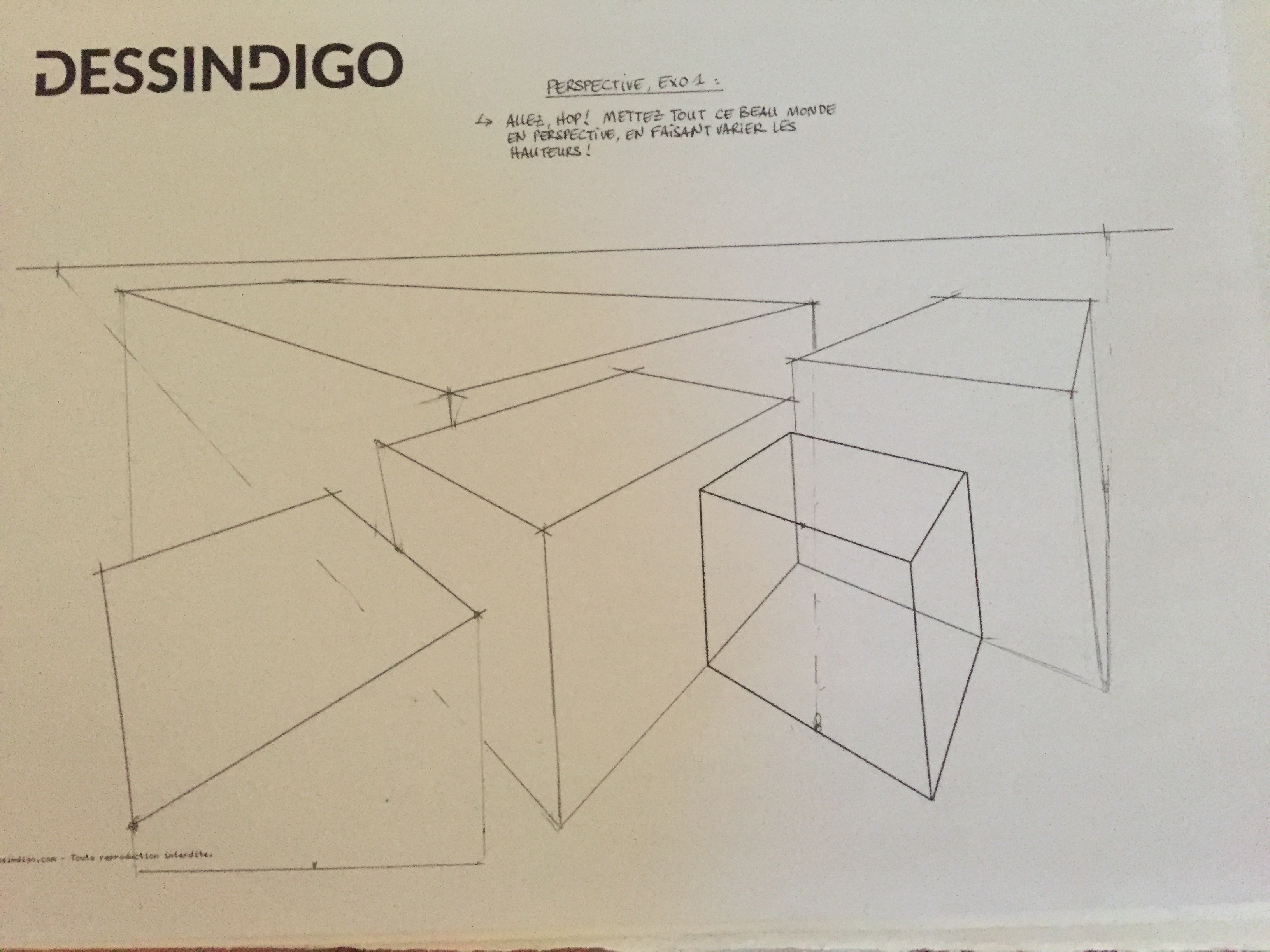 De ce fait, manquant d'aide, j'ai et je "travaille" la perspective avec d'autres supports en parallèle ( livre de Matthew Brehm, "PERSPECTIVE les bases du dessin" de chez VIGOT, et avec des tutos trouvés au hasard sur Youtube à force de Rechercher " comment dessiner un toit en perspective ..." . Malheureusement, J'ai dû faire un TRÈS LONG stop DESSINDIGO depuis l'exercice de juxtaposition d'une maison, d'un bonhomme et d'un arbre dans un pochoir, car pour dessiner correctement le toit de la maison dans différentes positions, il me fallait des connaissances .... : justement des connaissances de dessin de pers à 2 points de fuite, par exemple. LE Cours D'AUJOURD'HUI vient un peu tard dans la chronologie avec mon très faible niveau ...